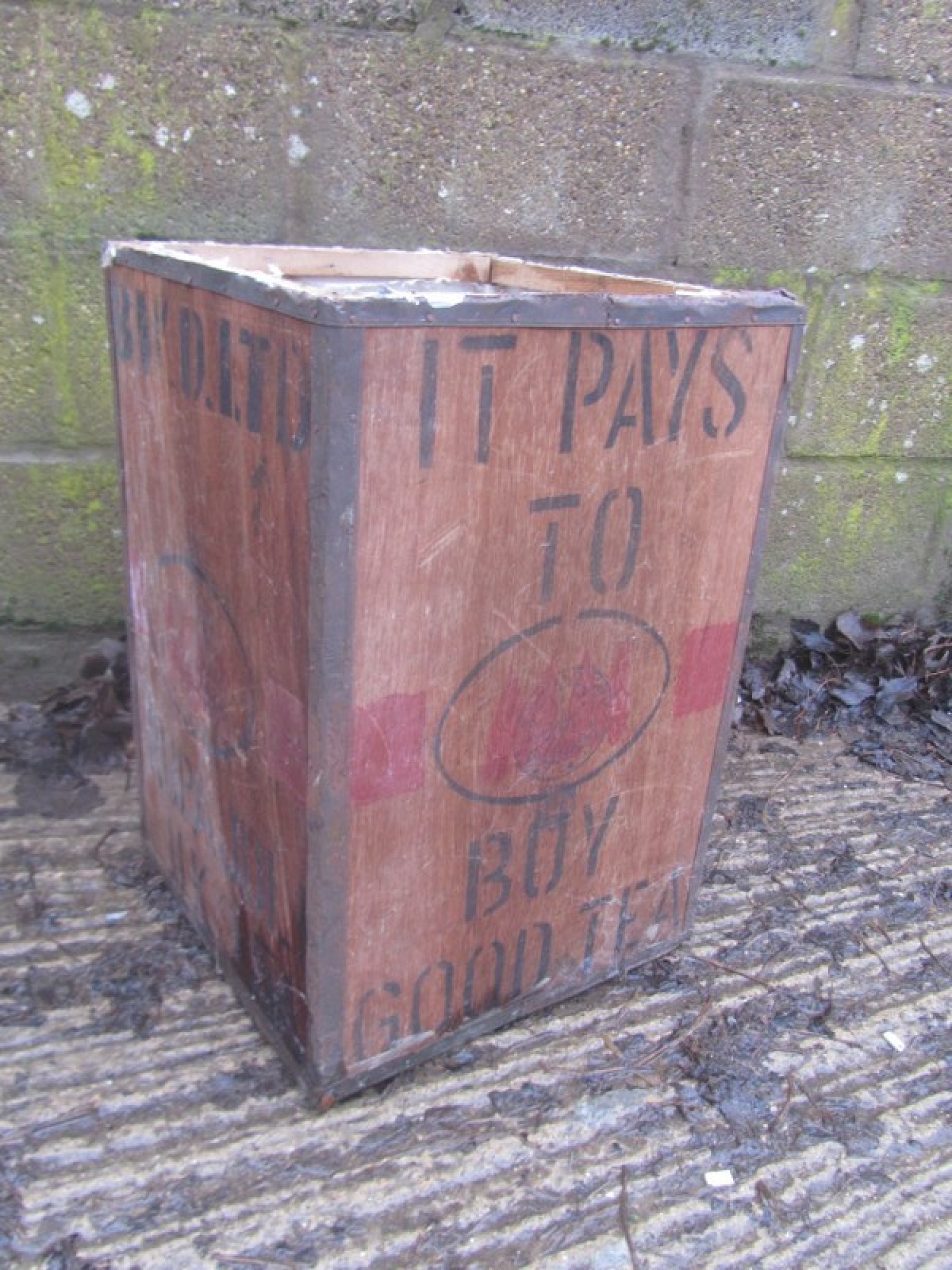 VINTAGE PLYWOOD TEA CHEST. IN WORN CONDITION, THEY HAVE SAT IN A LOFT FOR YEARS. IDEAL FOR STORAGE OR DISPLAY. PRINTED LOGOS ON THE SIDES.