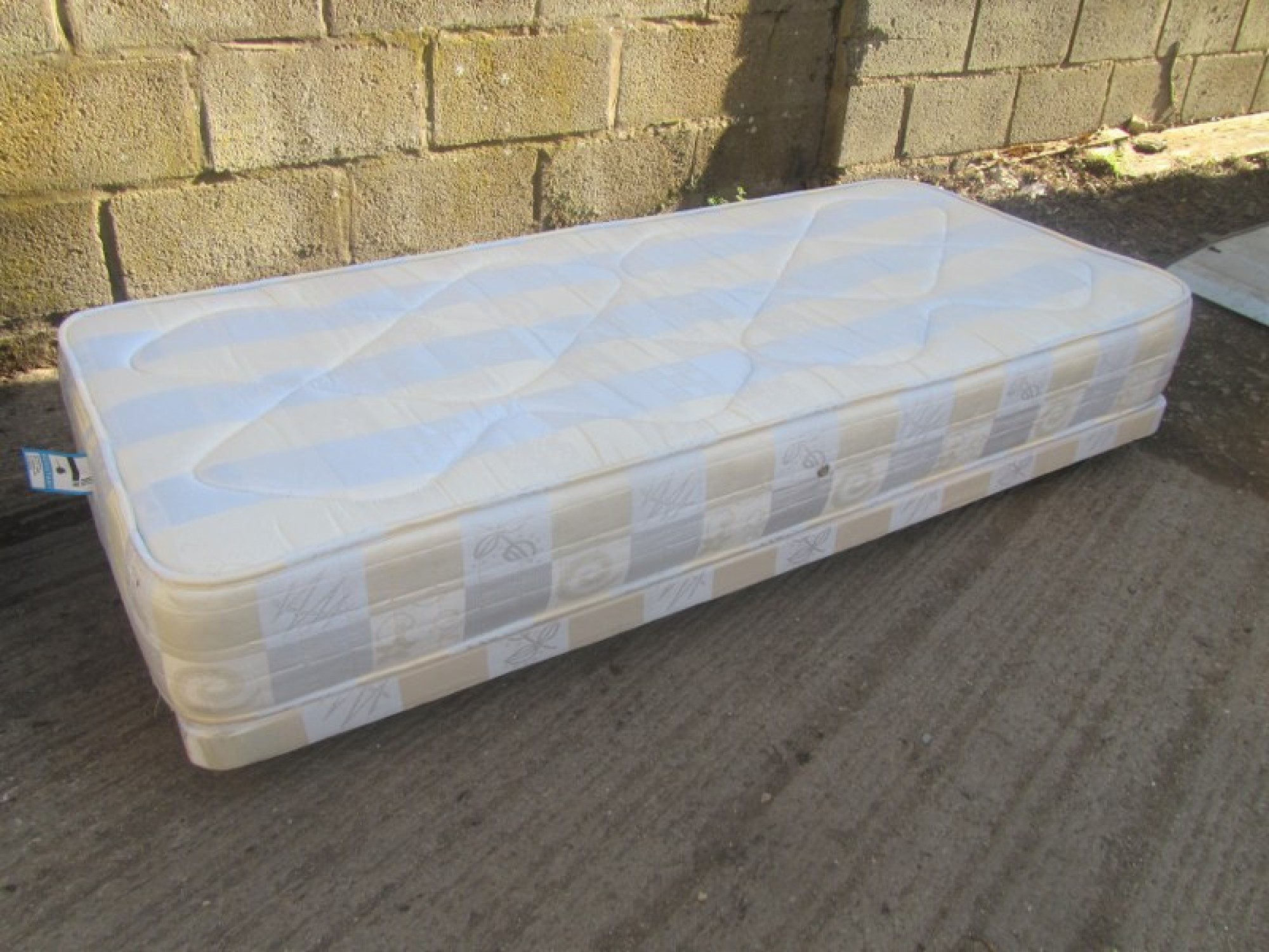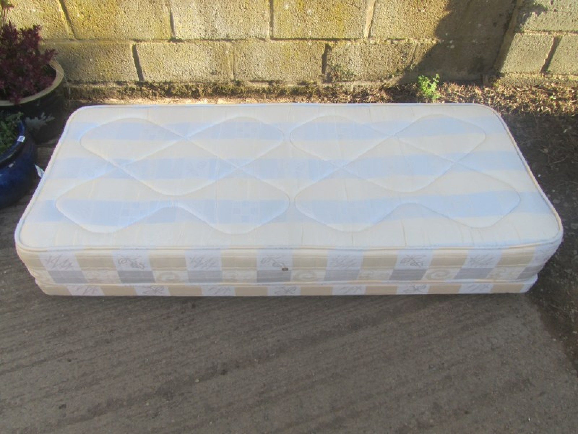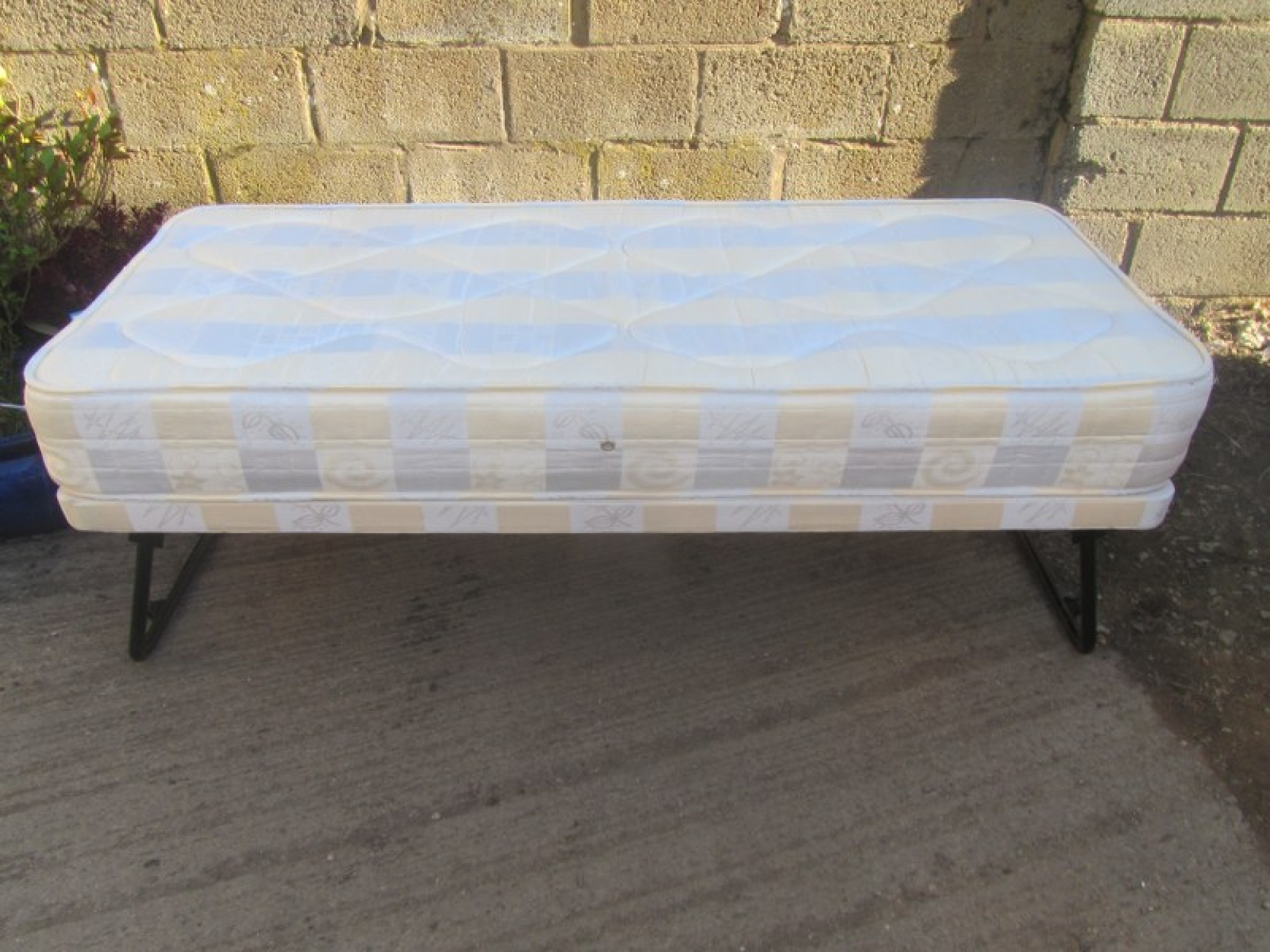 A SINGLE 2'6" WIDE FOLD OUT GUEST BED FRAME IN AVERAGE CONDITION. THE BASE HAS FOLD OUT LEGS. ORIGINALLY IT WAS STORED UNDER ANOTHER BED. SMALLER THAN A STANDARD MATTRESS. MATTRESS INCLUDED.