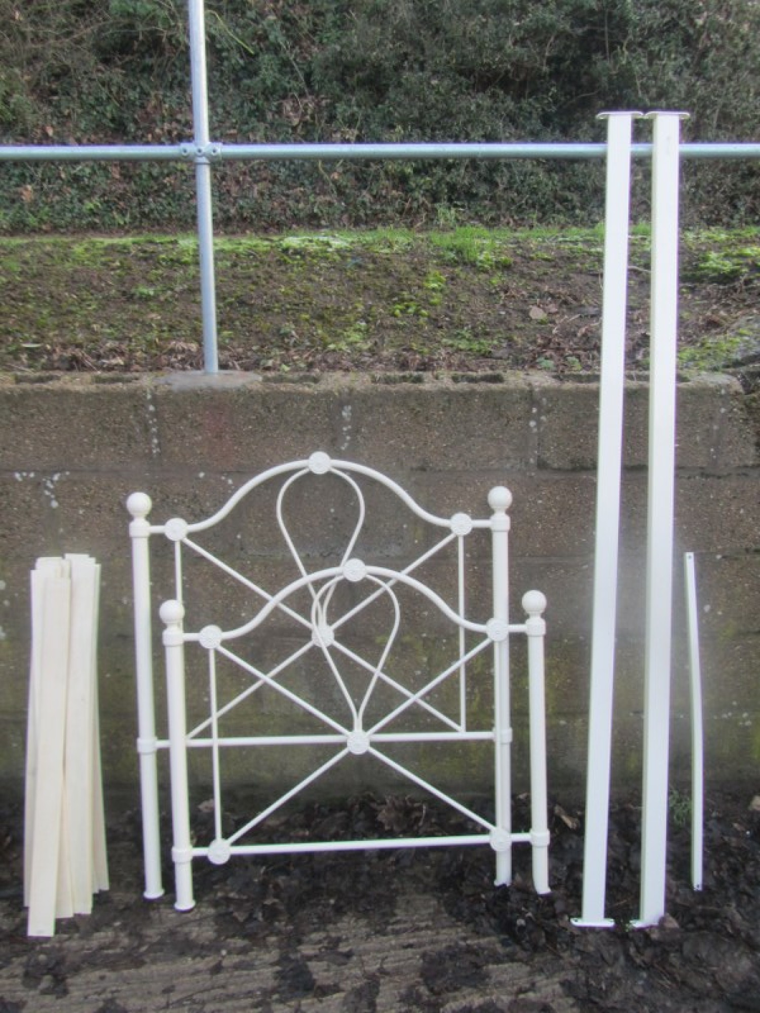 A CREAM COLOURED METAL BED FRAME, IT IS FLATPACKED READY FOR COLLECTION, EASY TO ASSEMBLE. IT WILL FIT A STANDARD 3' MATTRESS.