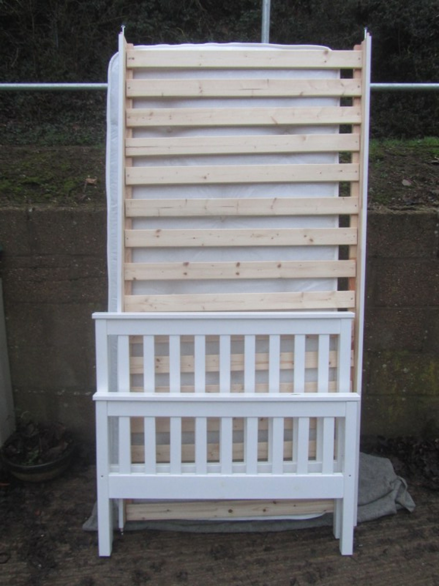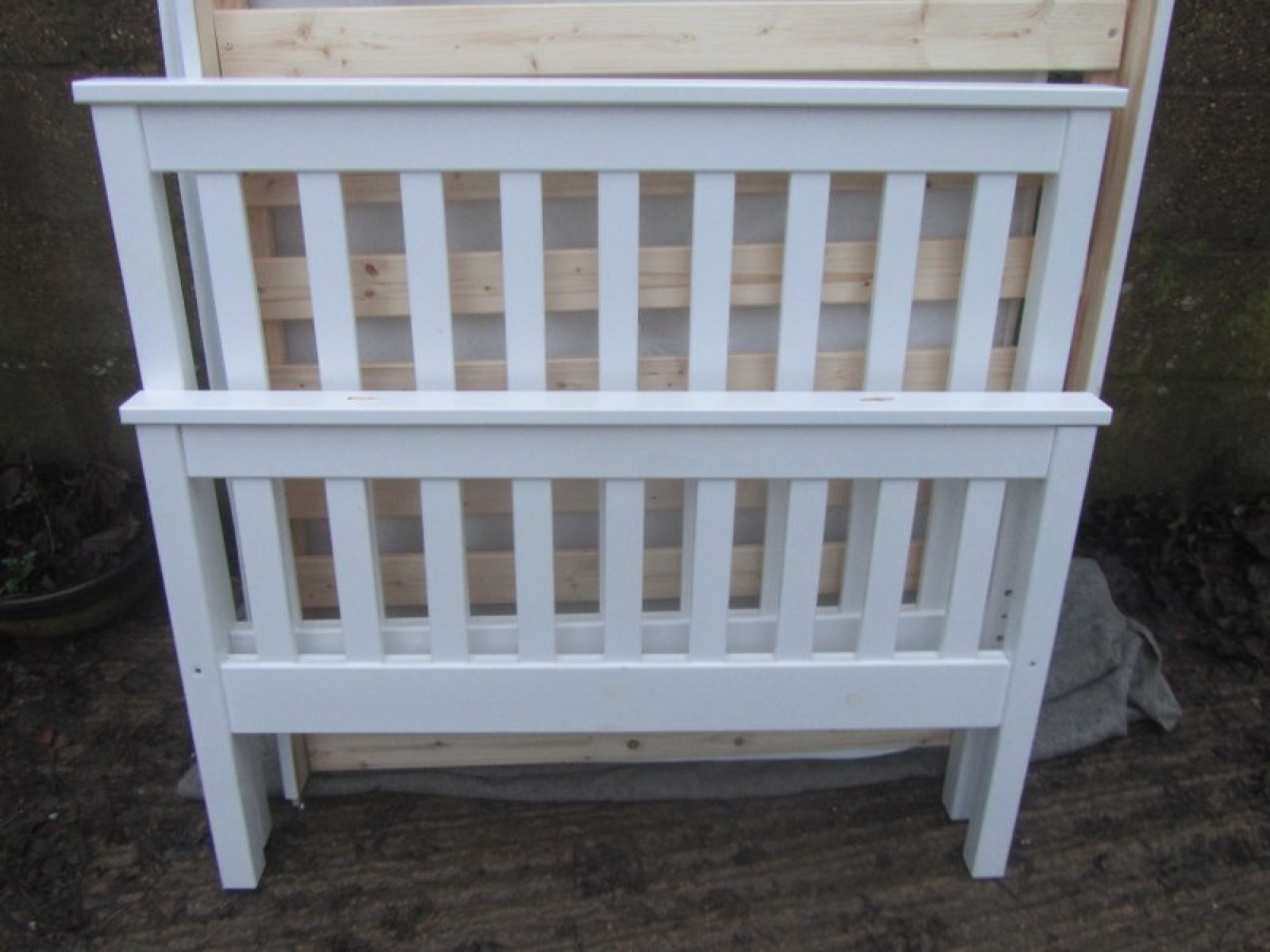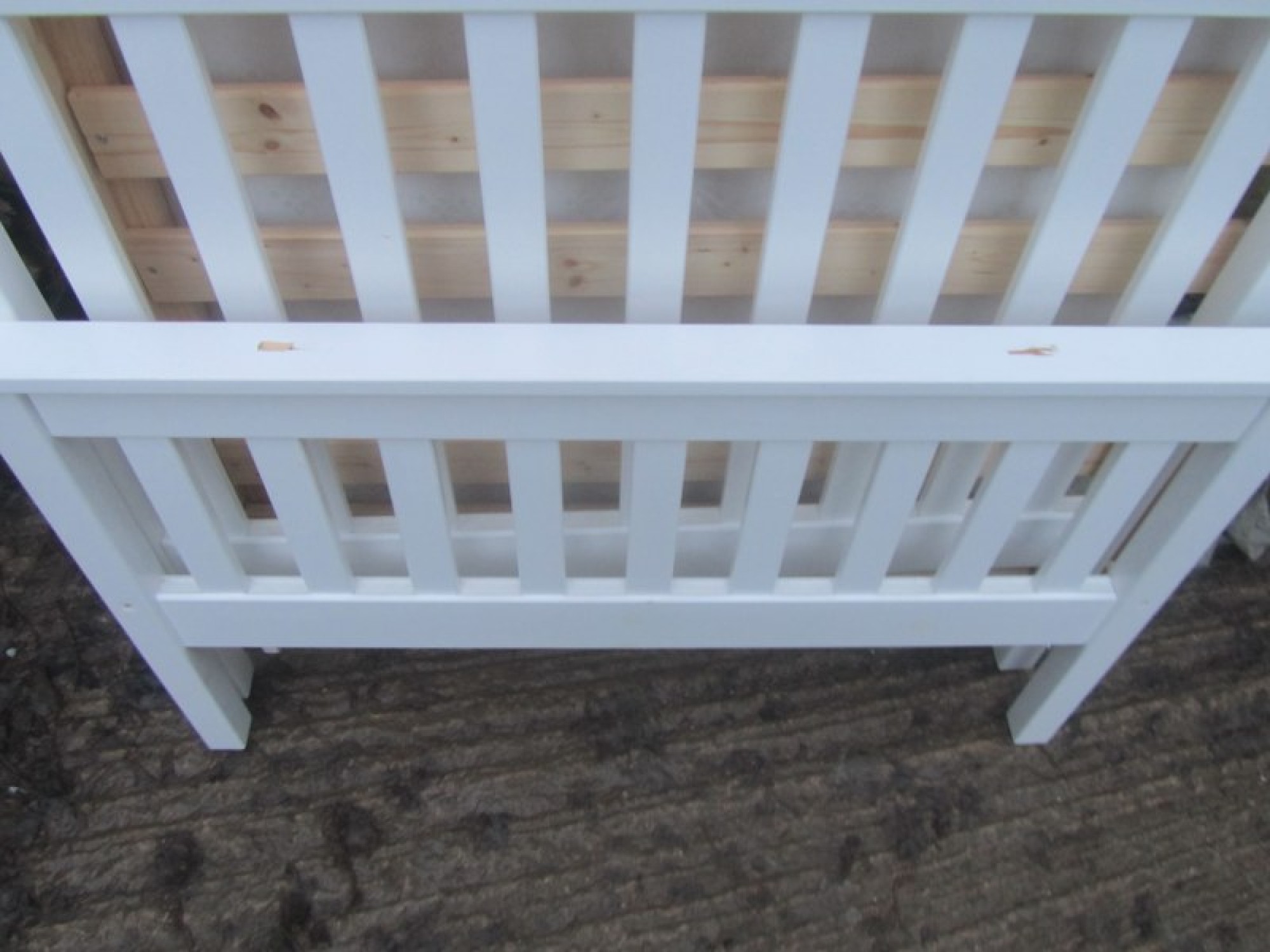 A WHITE COLOURED BED FRAME WITH SLATS, IT IS FLATPACKED READY FOR COLLECTION. SOME DAMAGED TO THE WOOD ON THE TOP RAIL OF THE FOOT BOARD.