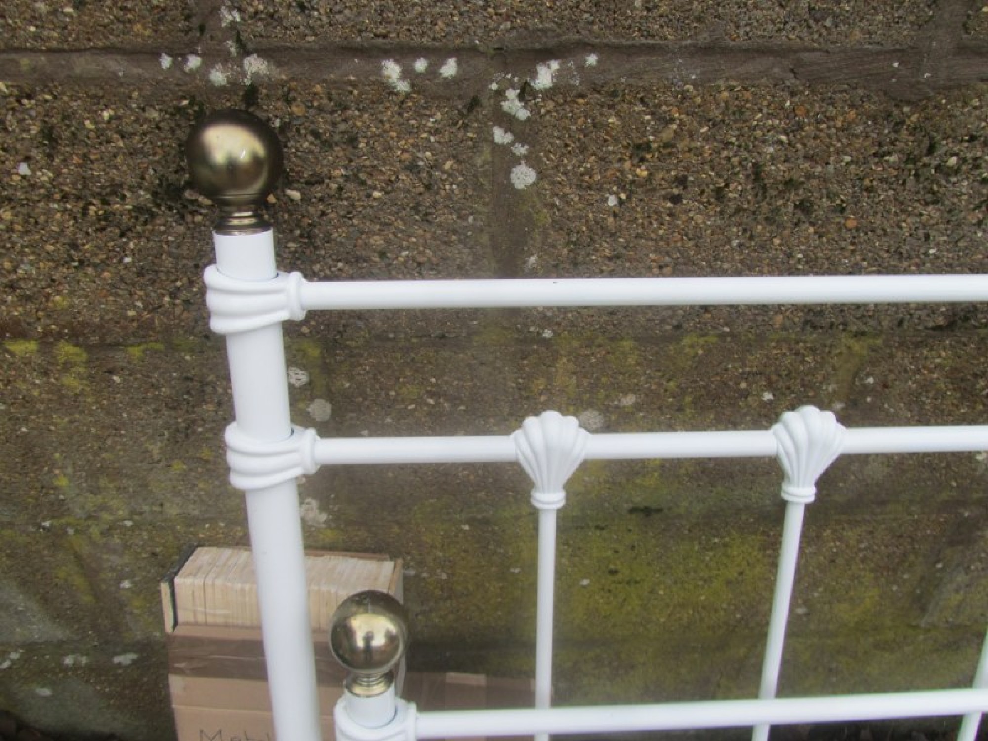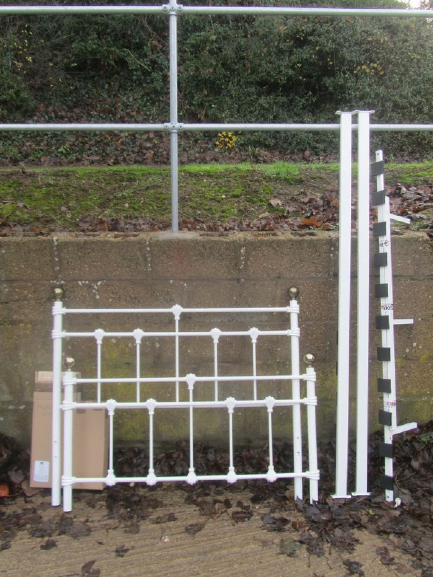A WHITE METAL BED FRAME TO FIT A 4' QUEEN SIZE MATTRESS. THE BED IS DISMANTLED READY FOR COLLECTION. INCLUDES SLATS AND FITTINGS.