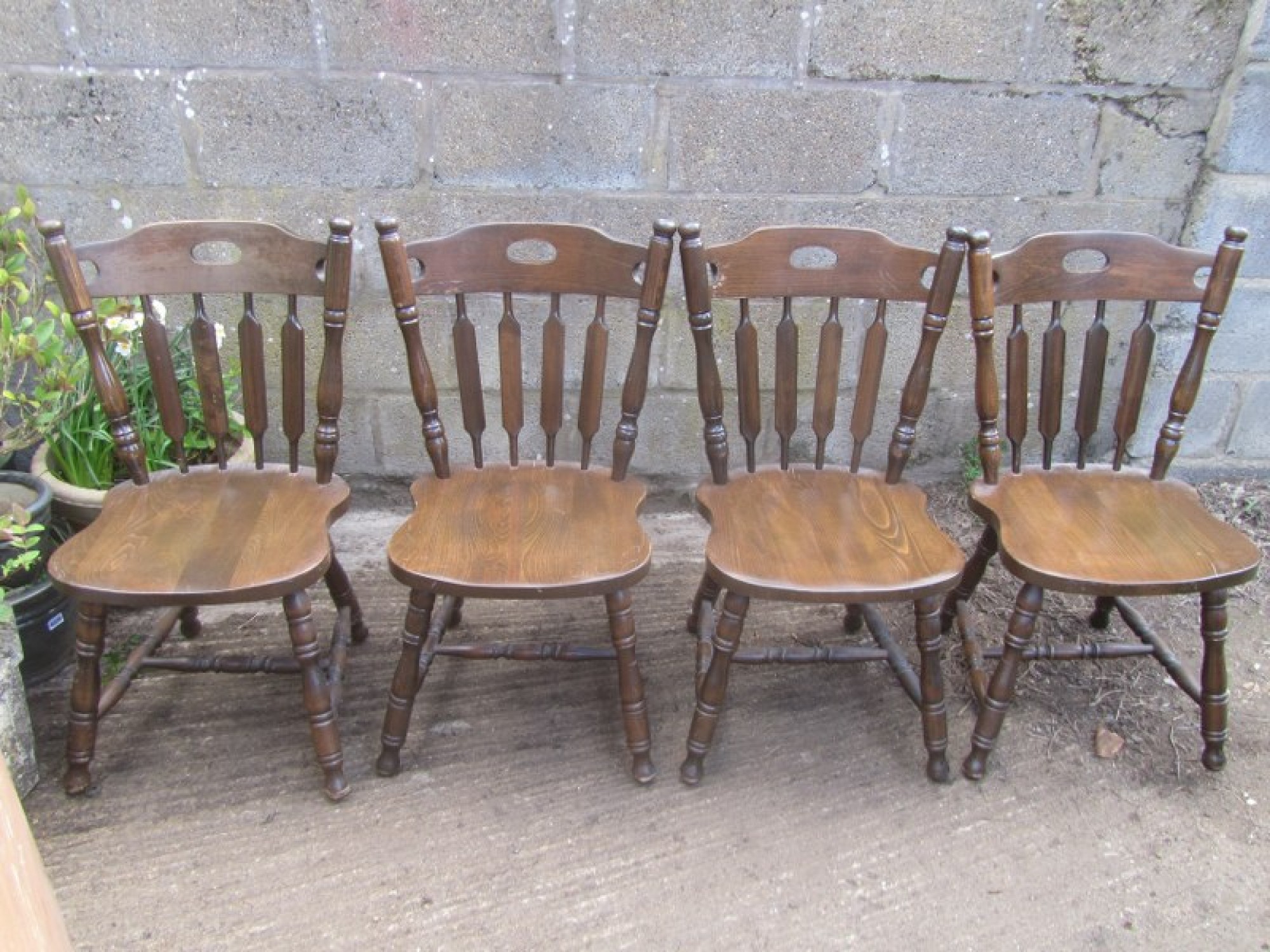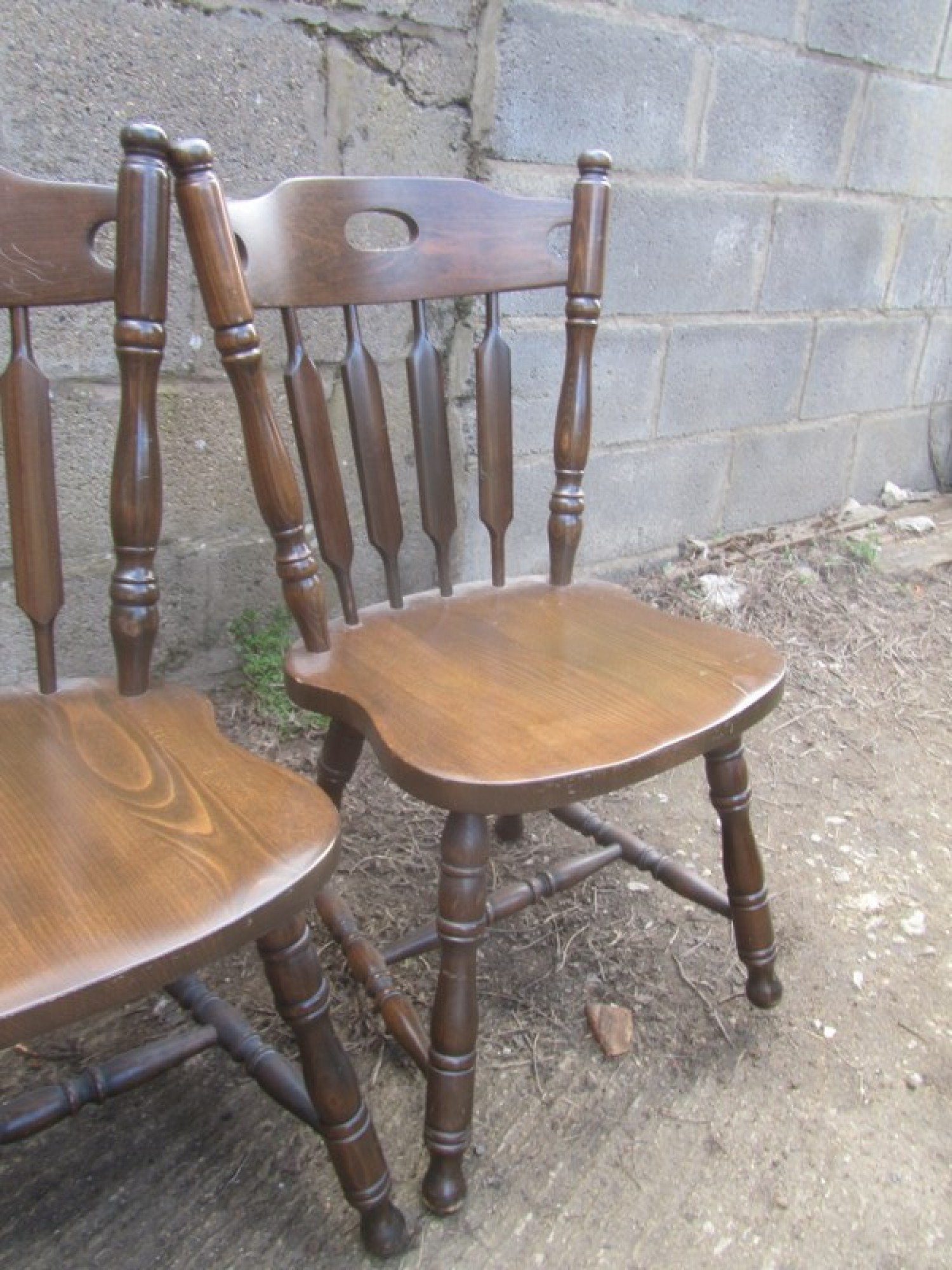 THIS IS A SET OF 4 CHAIRS FOR THE KITCHEN OR DINING ROOM. MADE IN SOLID BEECH, PLYWOOD SEAT, IN A DARK COLOUR. THIS IS A SET OF 4 CHAIRS. HEIGHT TO SEAT IS 44cm.