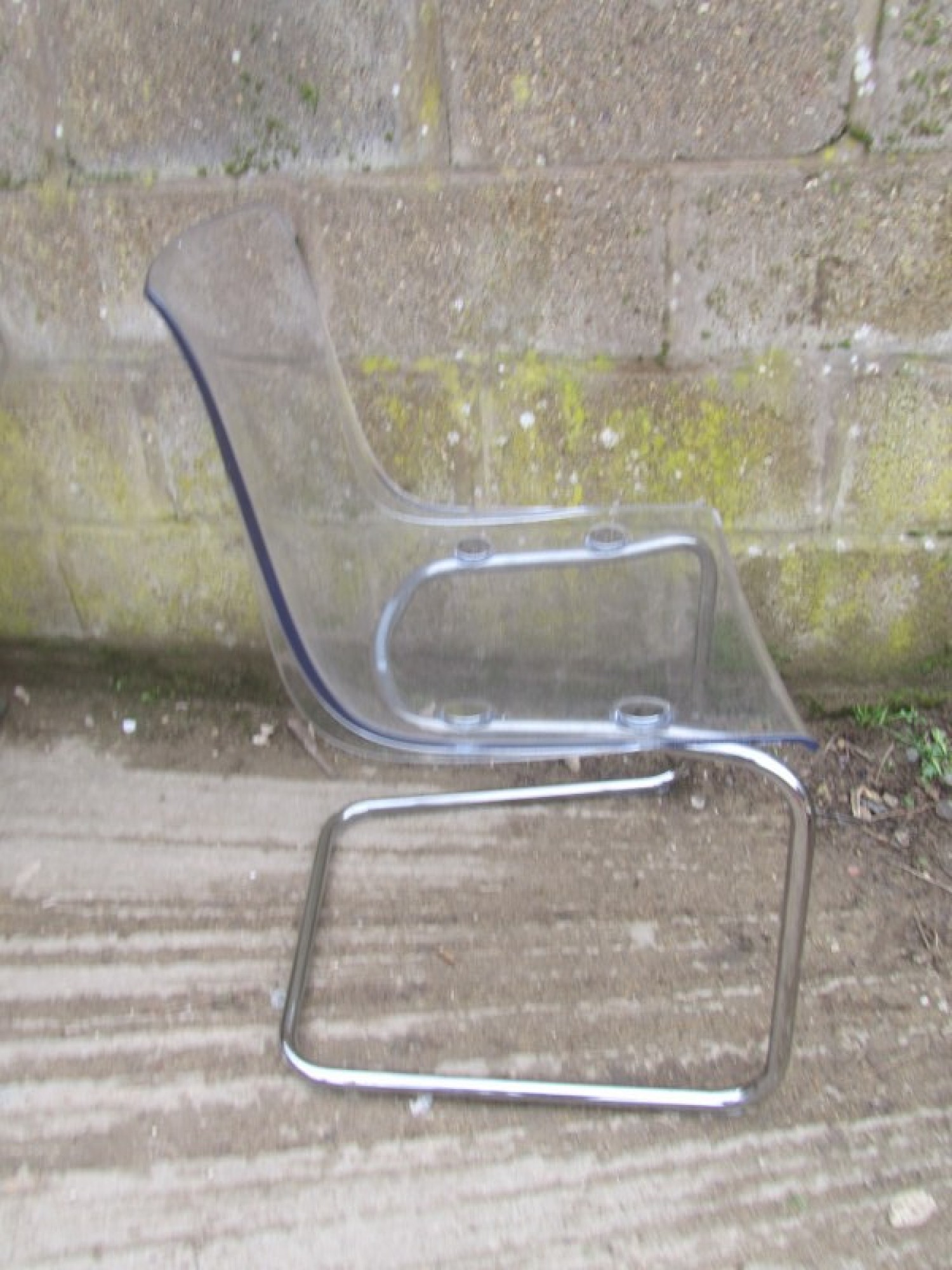 A MODERN CHAIR, METAL FRAME, PLASTIC SEAT. SOME SCUFFS AND MARKS.
