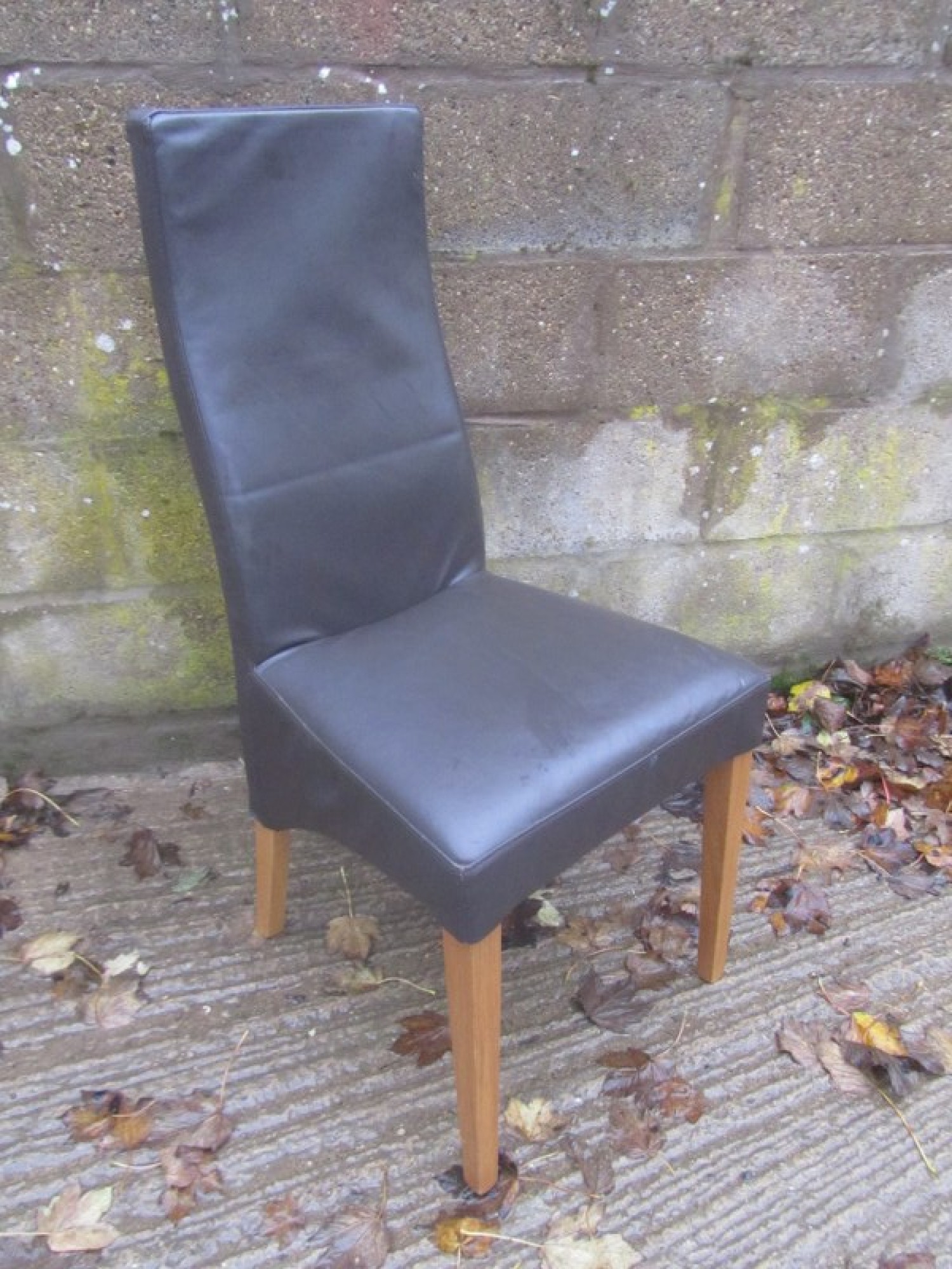 A MODERN DINING CHAIR IN BROWN LEATHER EFFECT UPHOLSTERY. OAK LEGS. IN AVERAGE CONDITION, SOME SCUFFS. SEAT HEIGHT IS 47cm.
