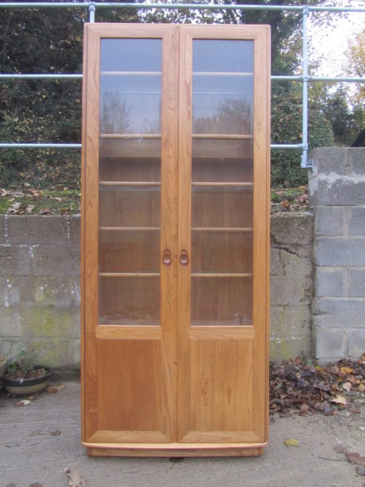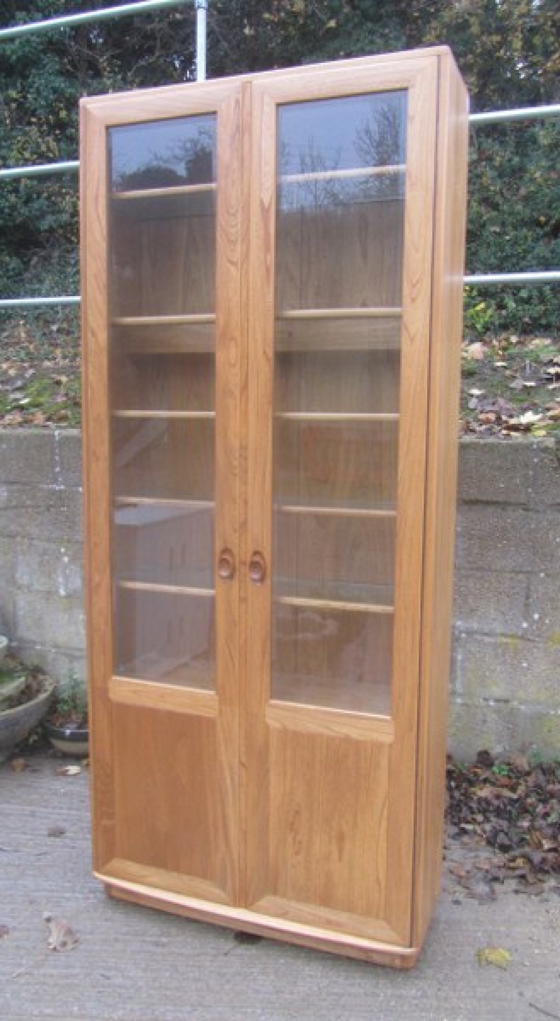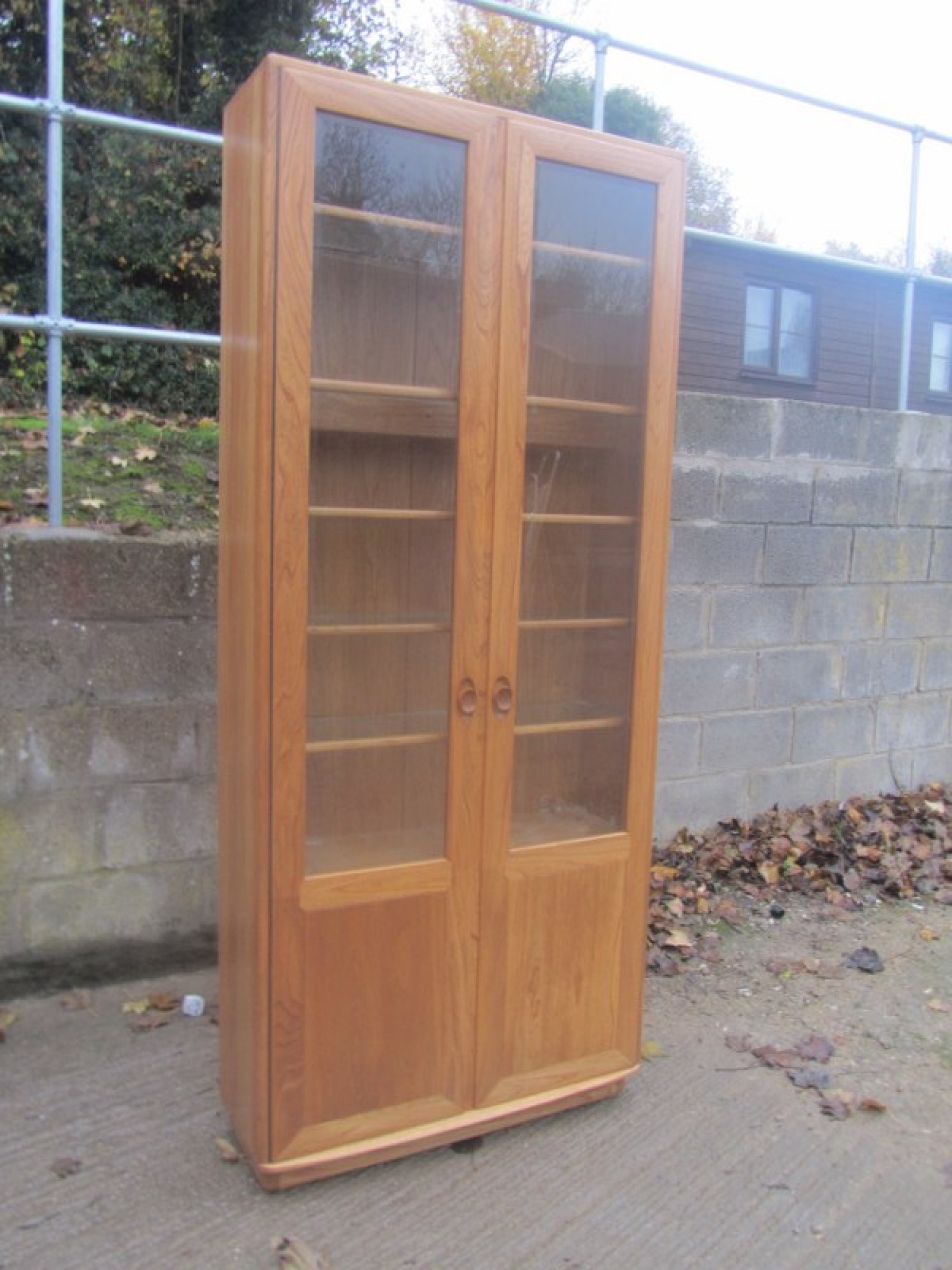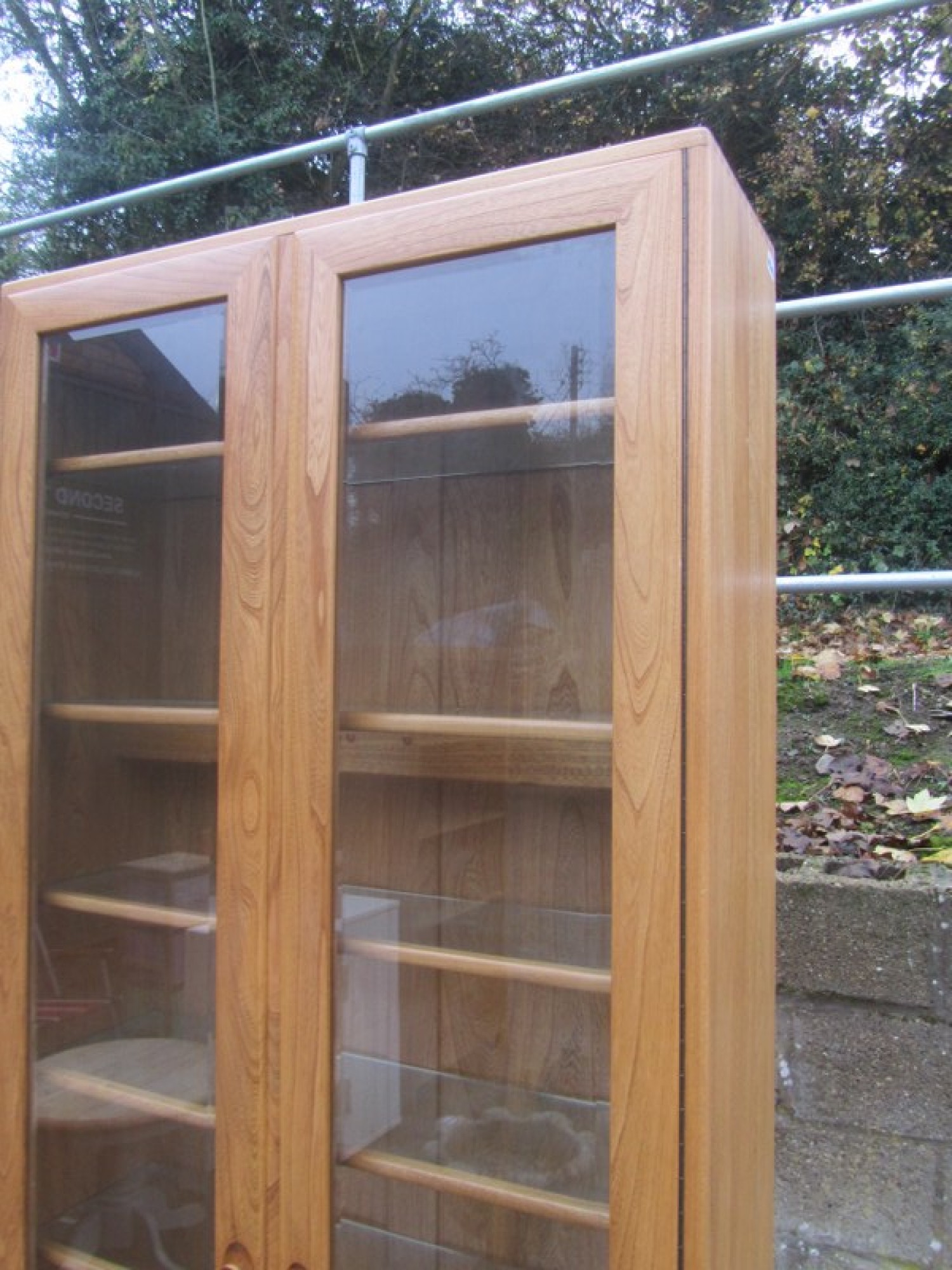 THIS IS A TALL DISPLAY CABINET WITH 2 GLAZED DOORS. MADE BY QUALITY MAKERS 'ERCOL'. MADE IN SOLID WOOD, GOOD CLEAN CONDITION THERE IS A DENT AT THE TOP OF THE RIGHT HAND EDGE. COST £3000 WHEN NEW.