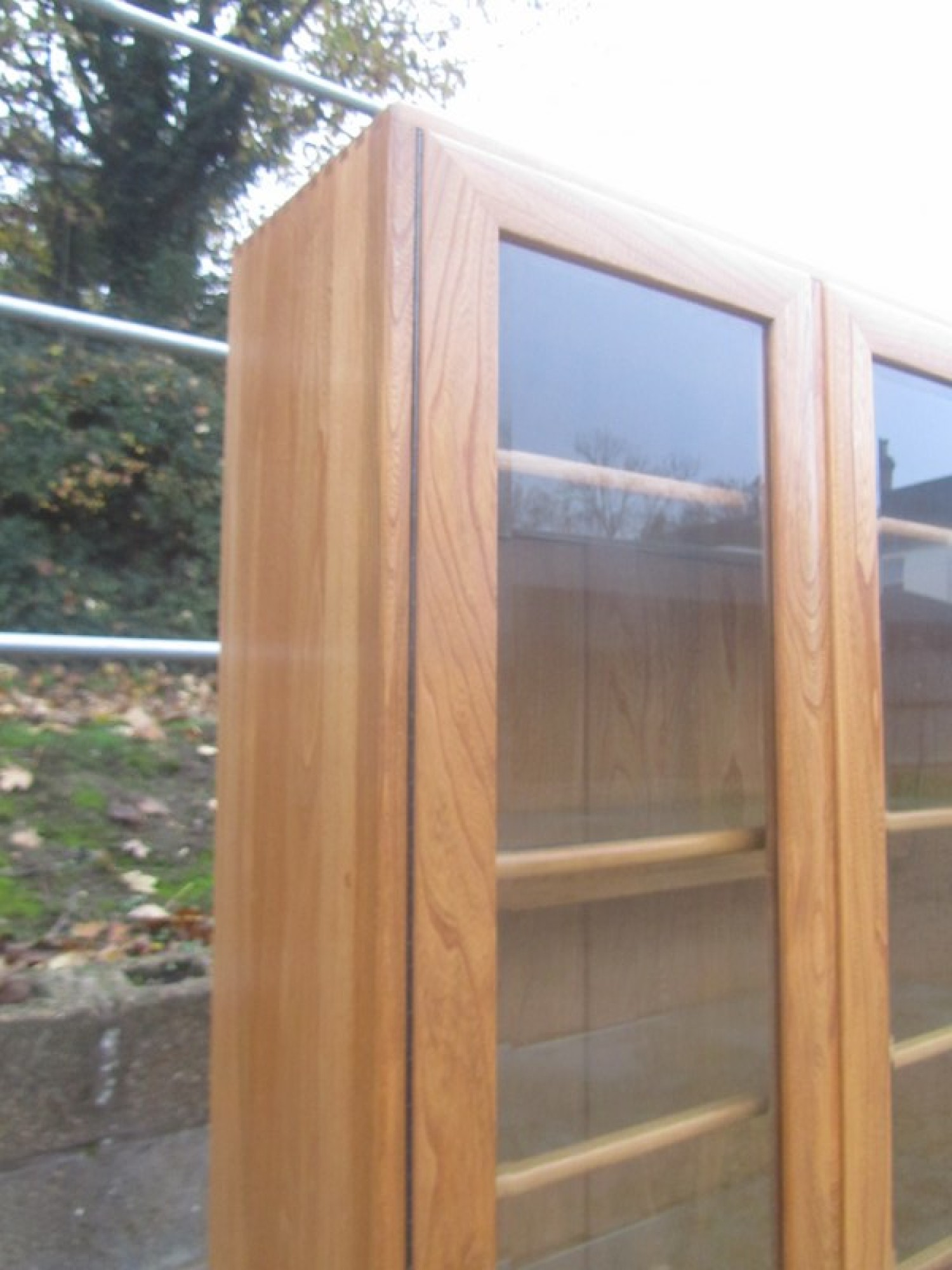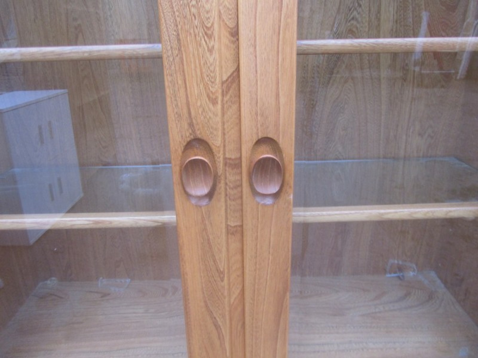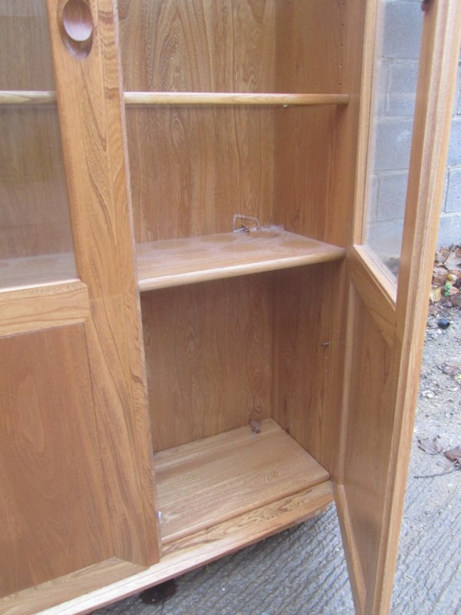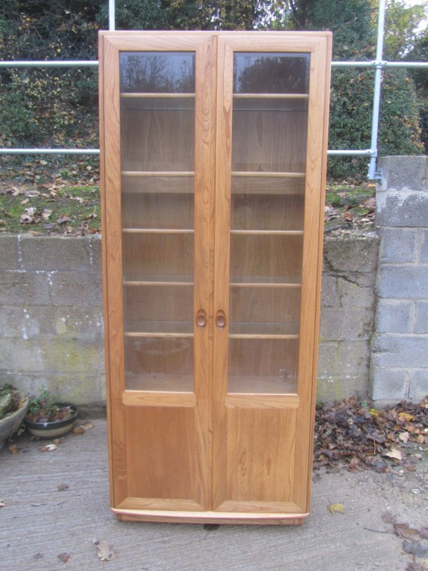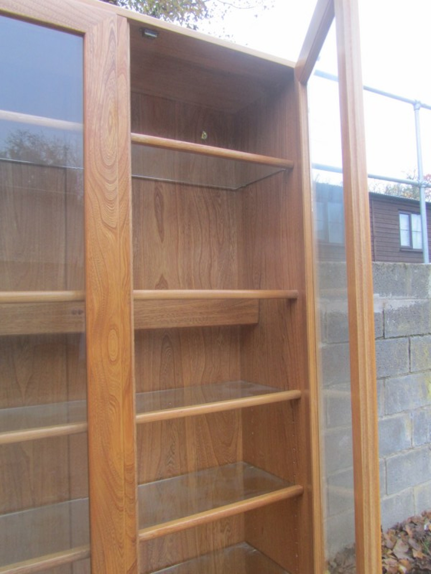 THIS IS A TALL DISPLAY CABINET WITH 2 GLAZED DOORS. MADE BY QUALITY MAKERS 'ERCOL'. MADE IN SOLID WOOD, GOOD CLEAN CONDITION THERE IS A DENT AT THE TOP OF THE RIGHT HAND EDGE. COST £3000 WHEN NEW.
