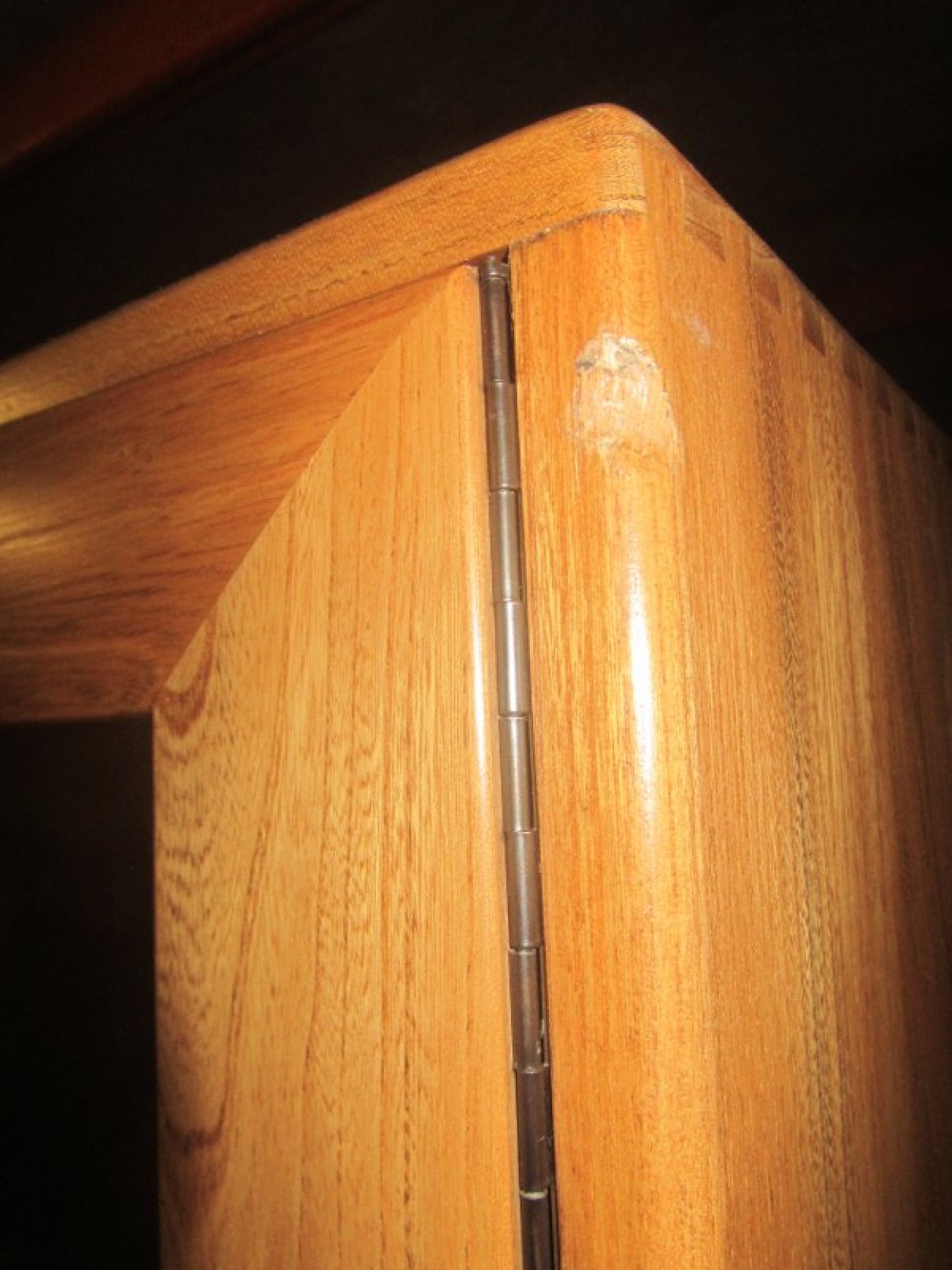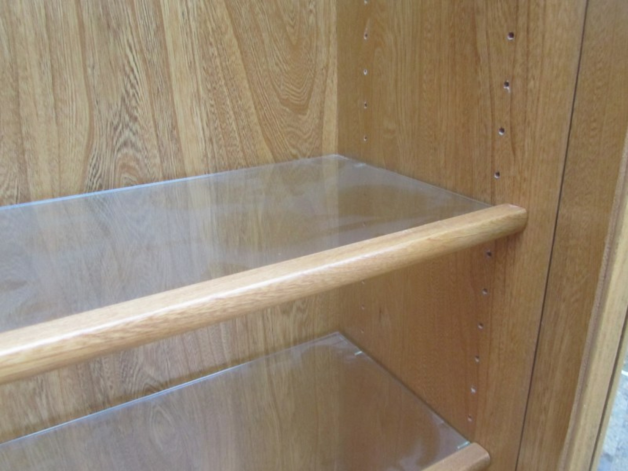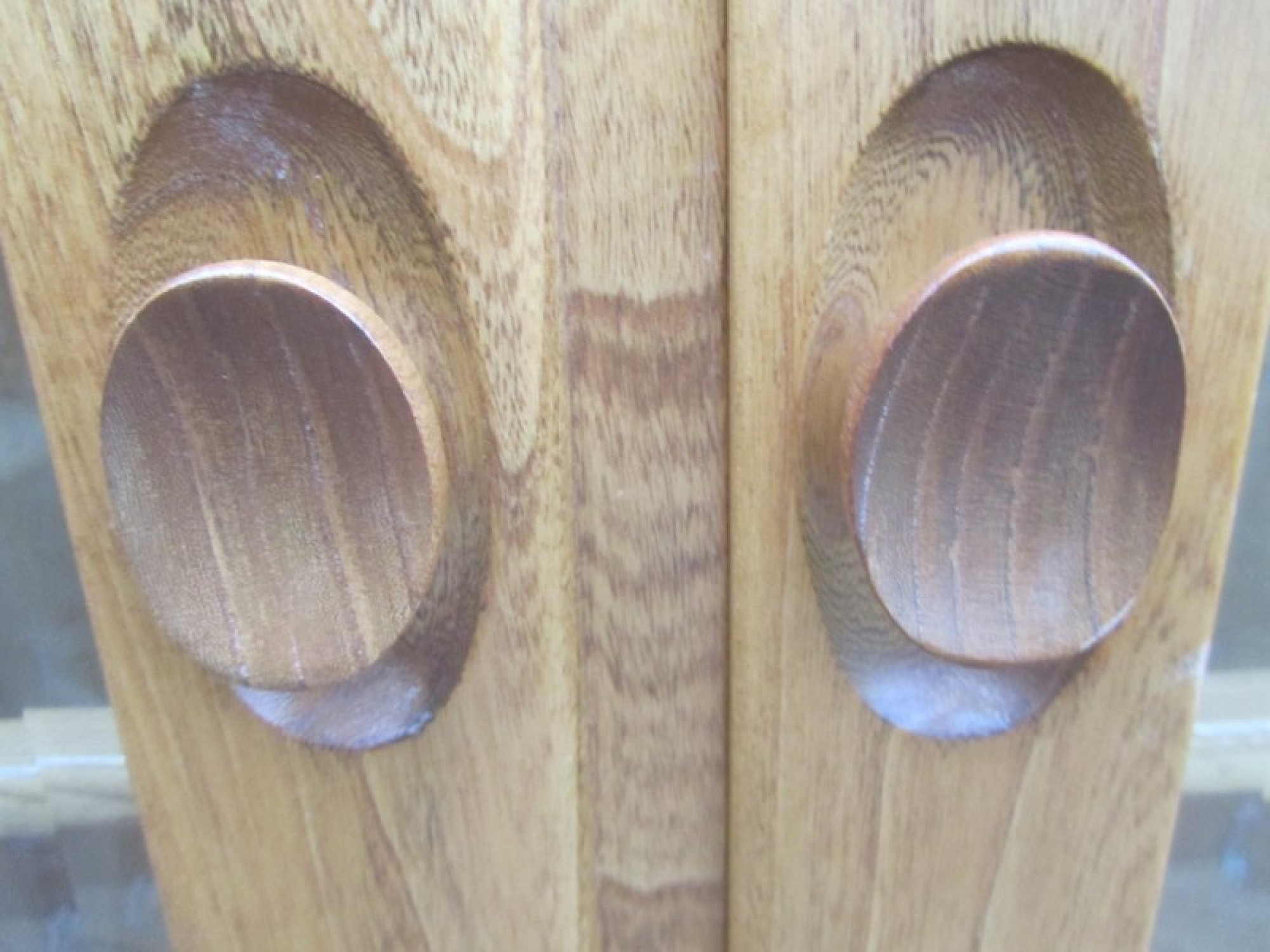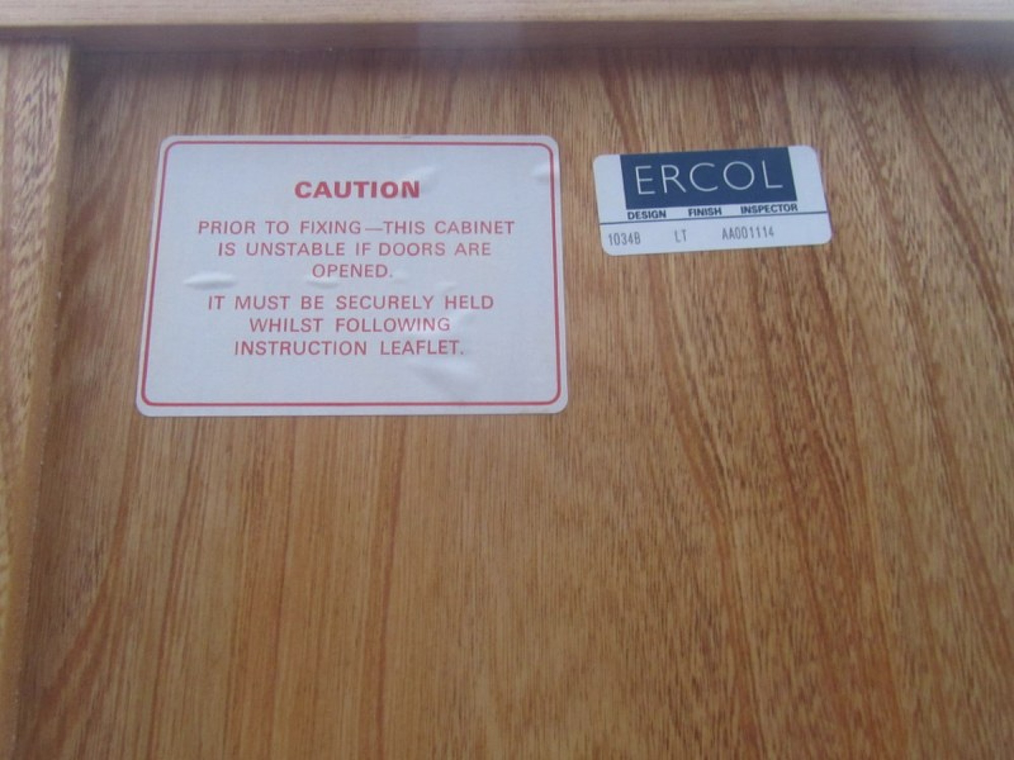 THIS IS A TALL DISPLAY CABINET WITH 2 GLAZED DOORS. MADE BY QUALITY MAKERS 'ERCOL'. MADE IN SOLID WOOD, GOOD CLEAN CONDITION THERE IS A DENT AT THE TOP OF THE RIGHT HAND EDGE. COST £3000 WHEN NEW.