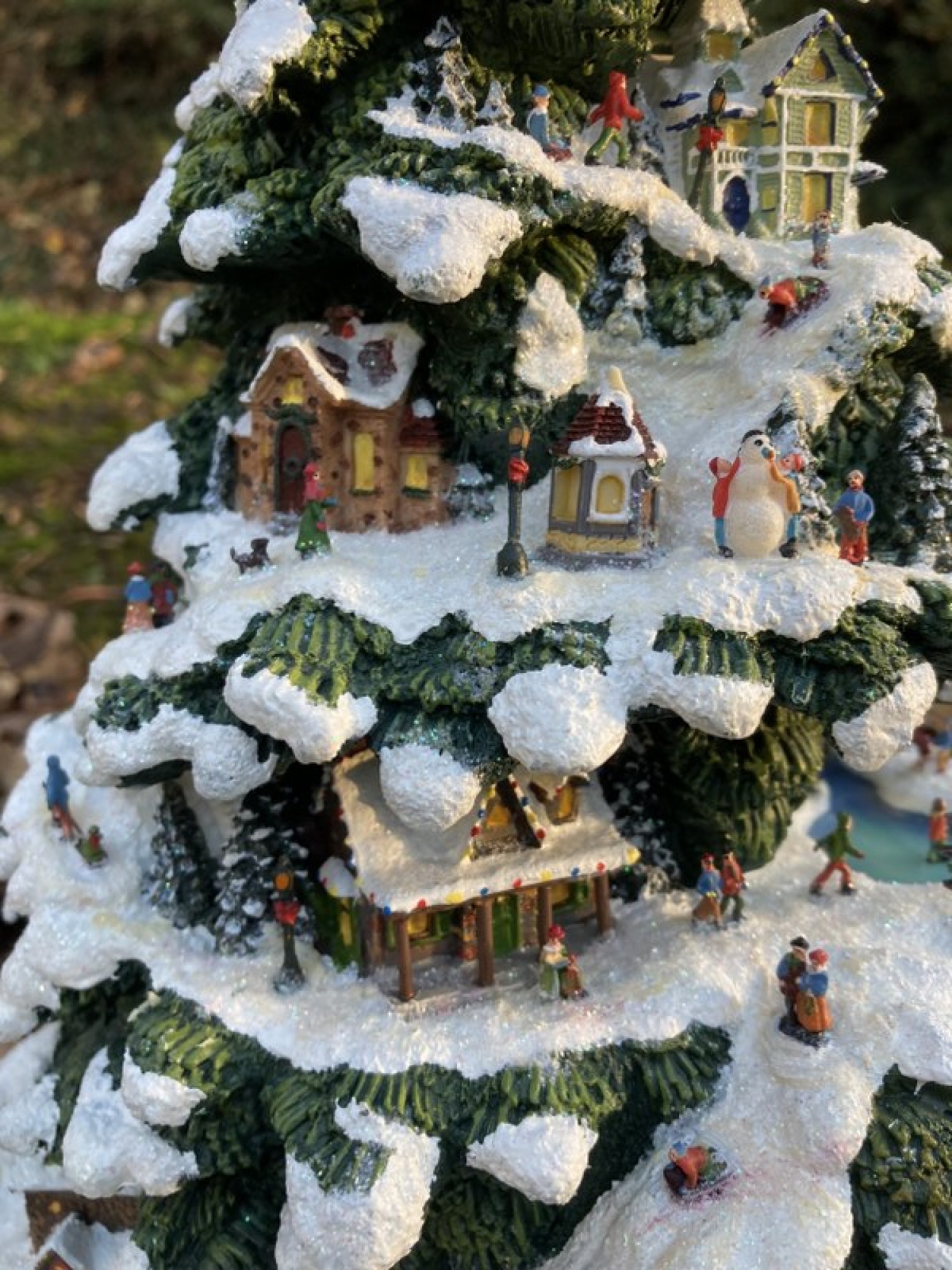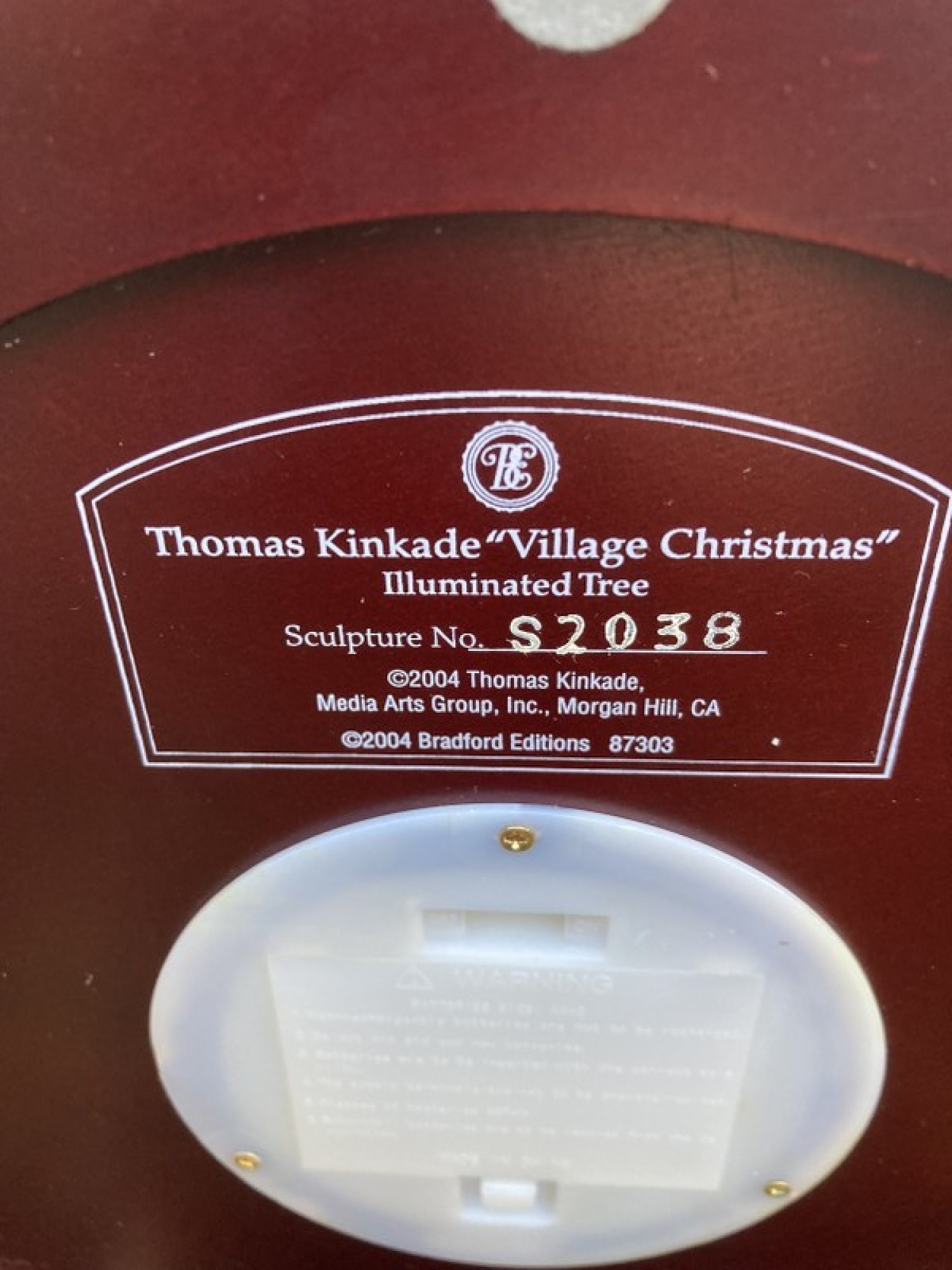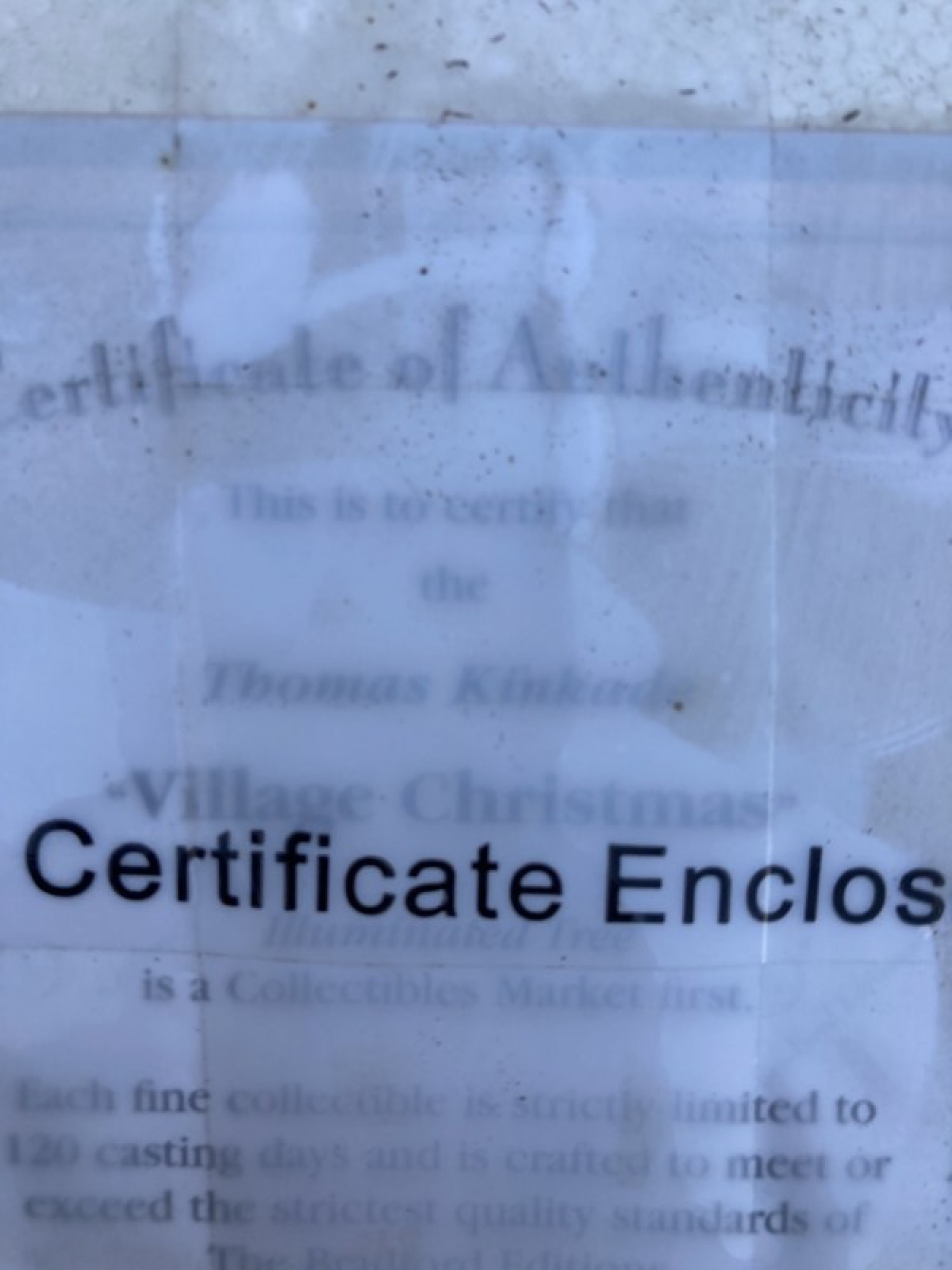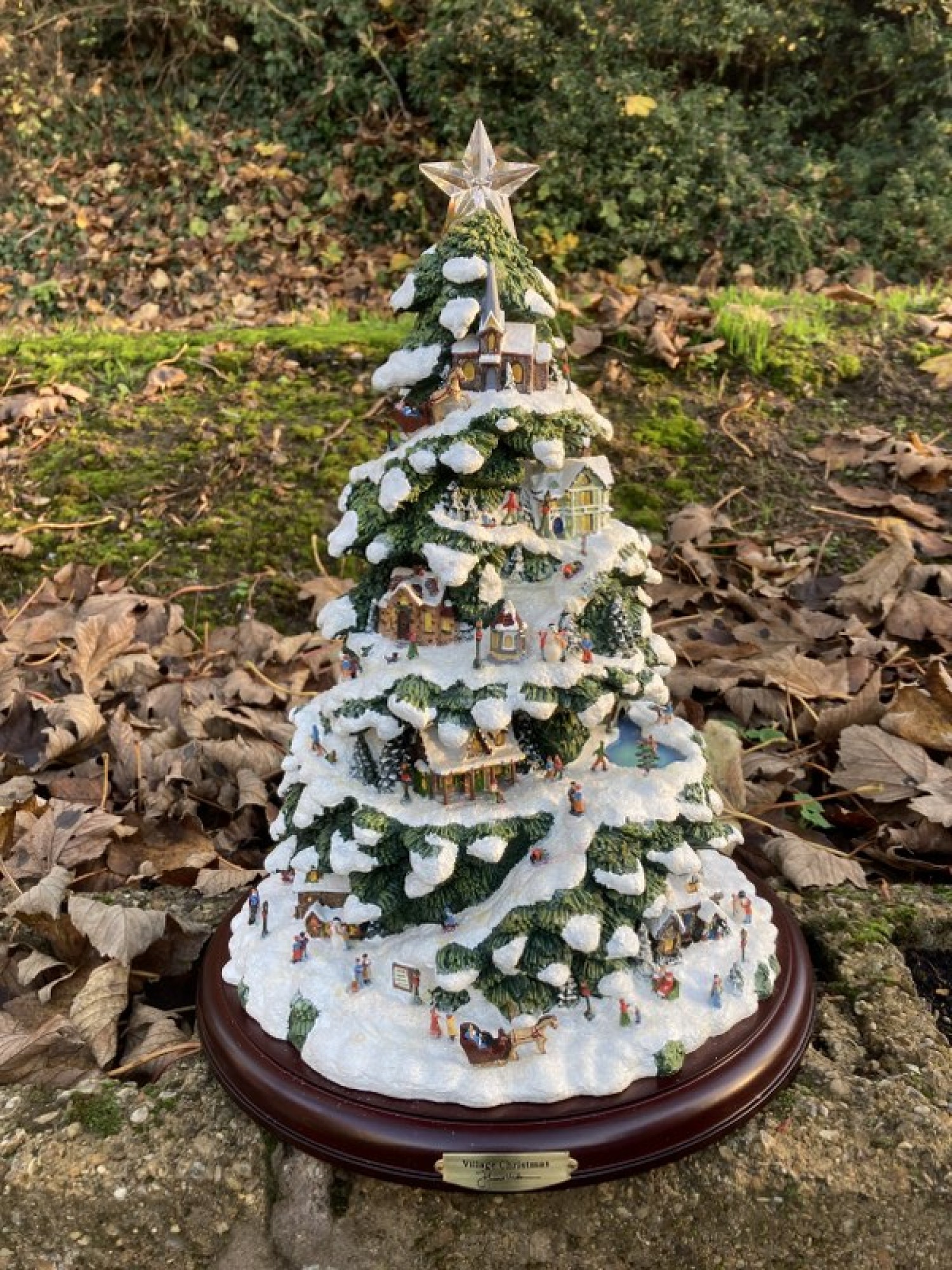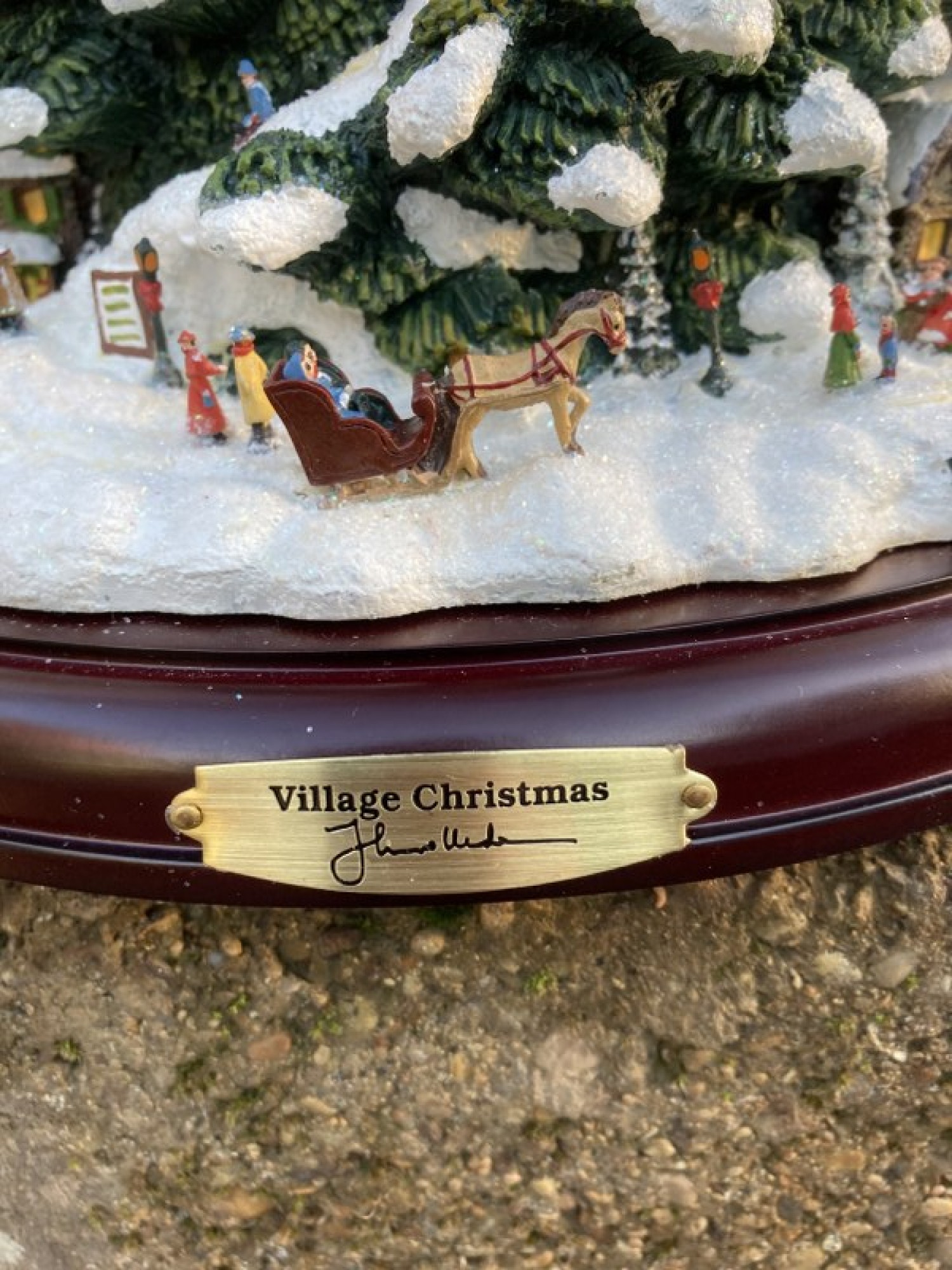 A LIGHT UP CHRISTMAS TREE. DESIGNED BY THOMAS KINKADE, MODEL IS 'VILLAGE CHRISTMAS', IT IS THE 2004 BRADFORD EDITION WITH CERTIFICATE. IN GOOD CONDITION, WORKING ORDER. A COUPLE OF THE TINY FIGURES ARE MISSING, IT IS VERY DELICATE.