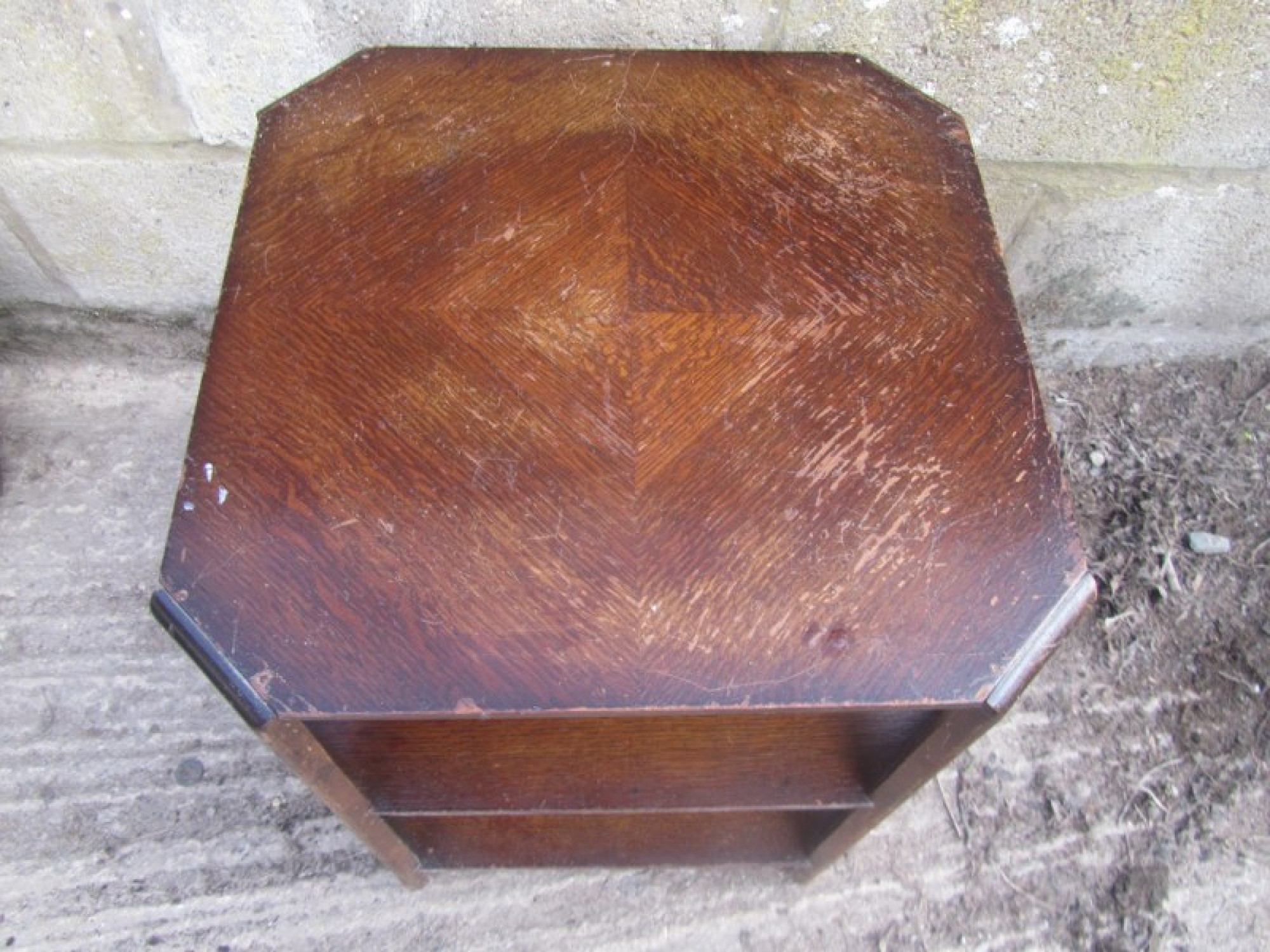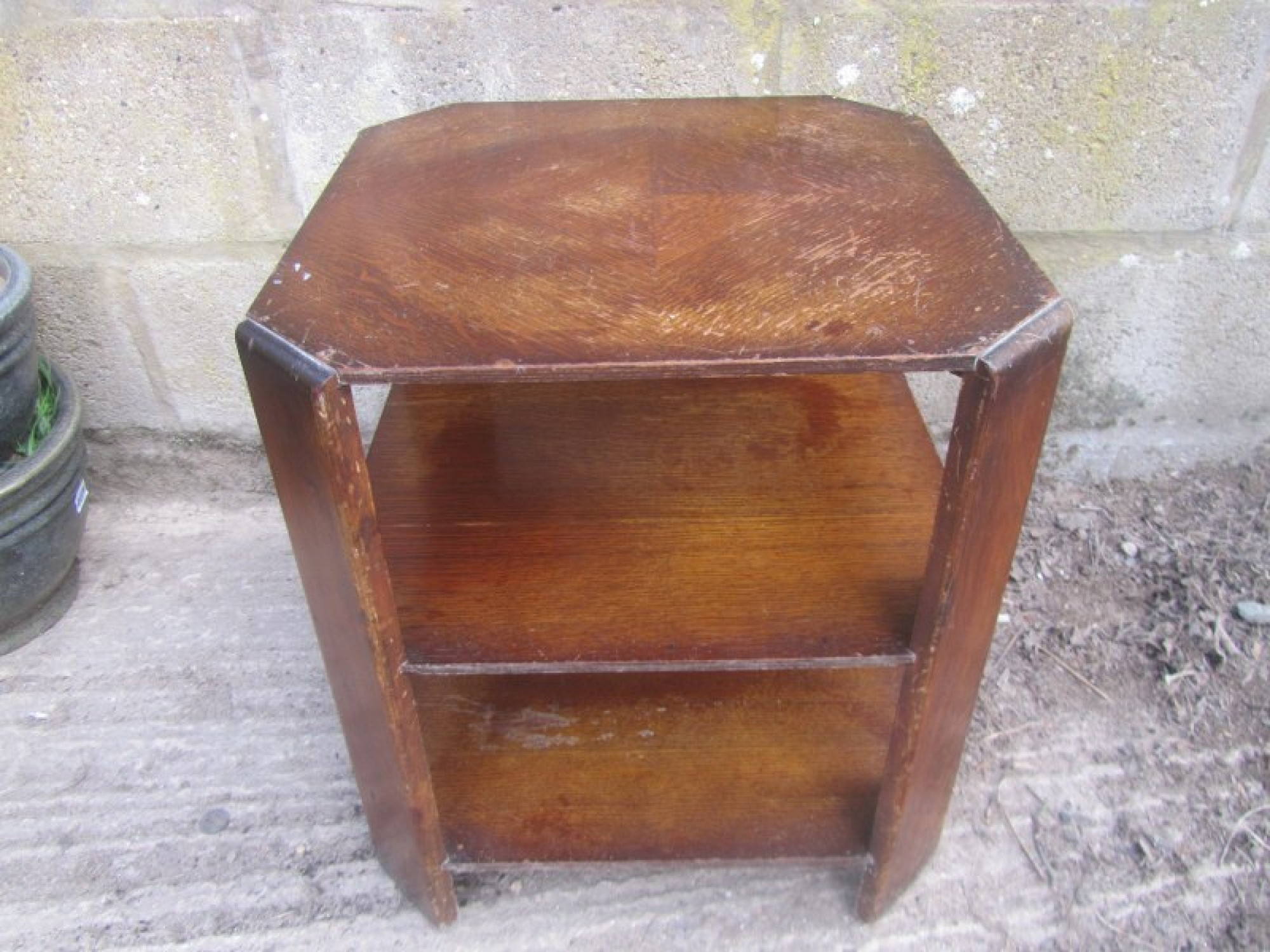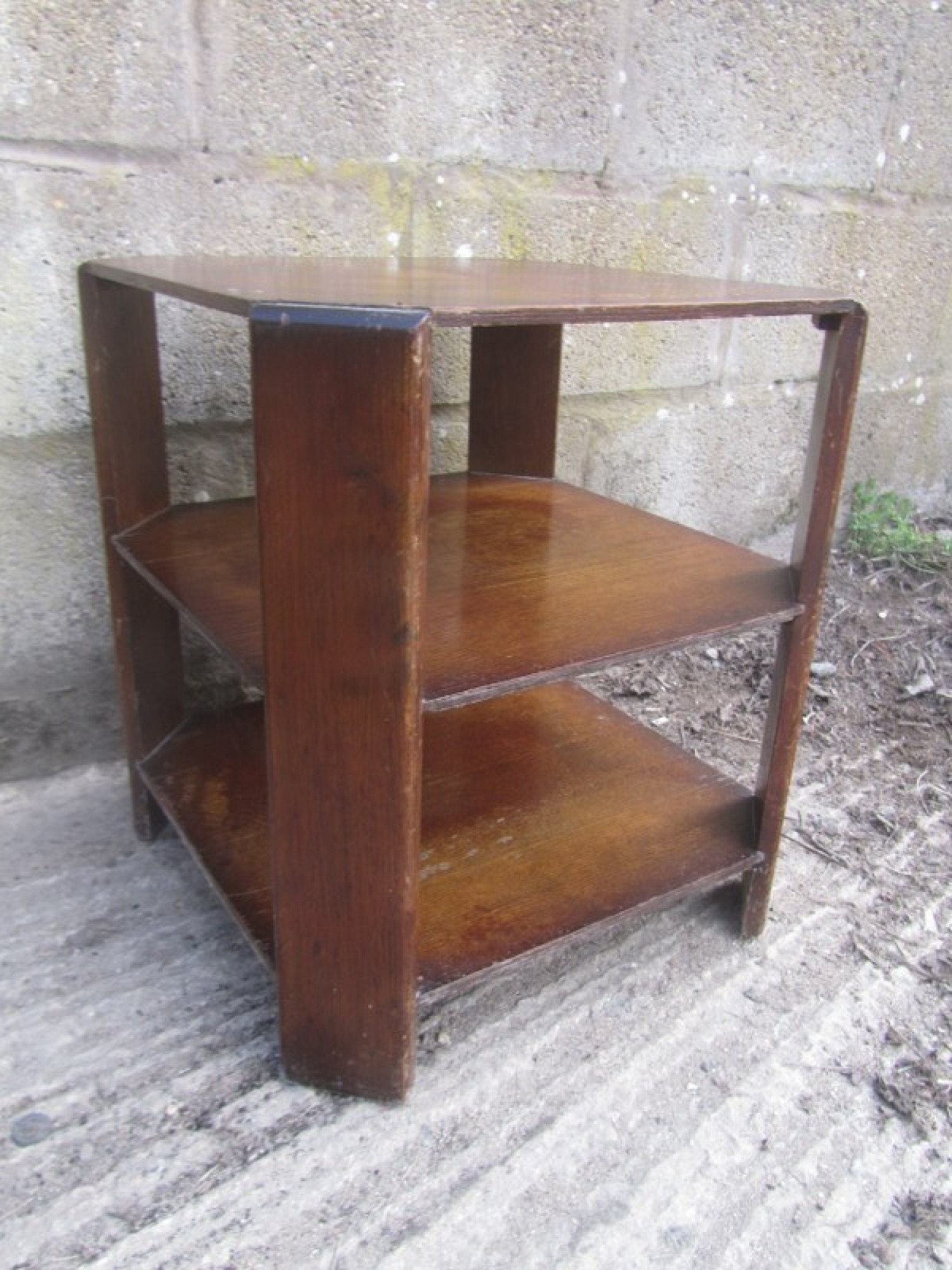 A SMALL OAK VENEERED TABLE WITH 3 TIERS, STRONG AND STURDY. A STYLISH ART DECO PIECE OF FURNITURE FOR ANYWHERE IN THE HOME. SCUFFS AND WEAR.