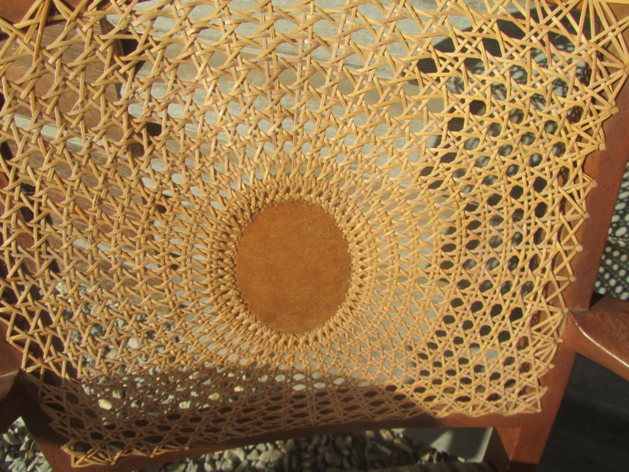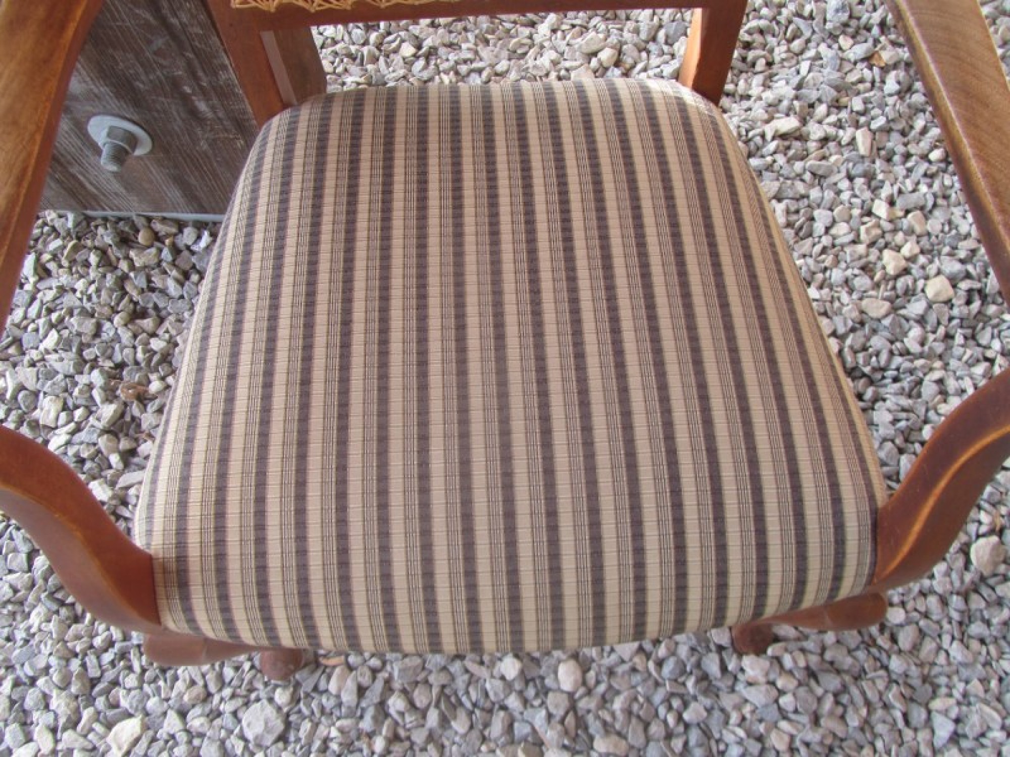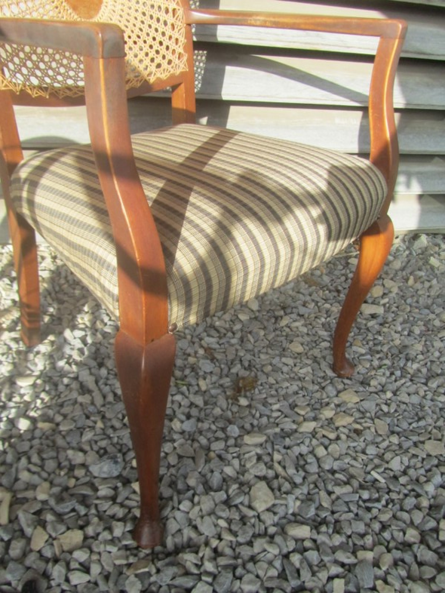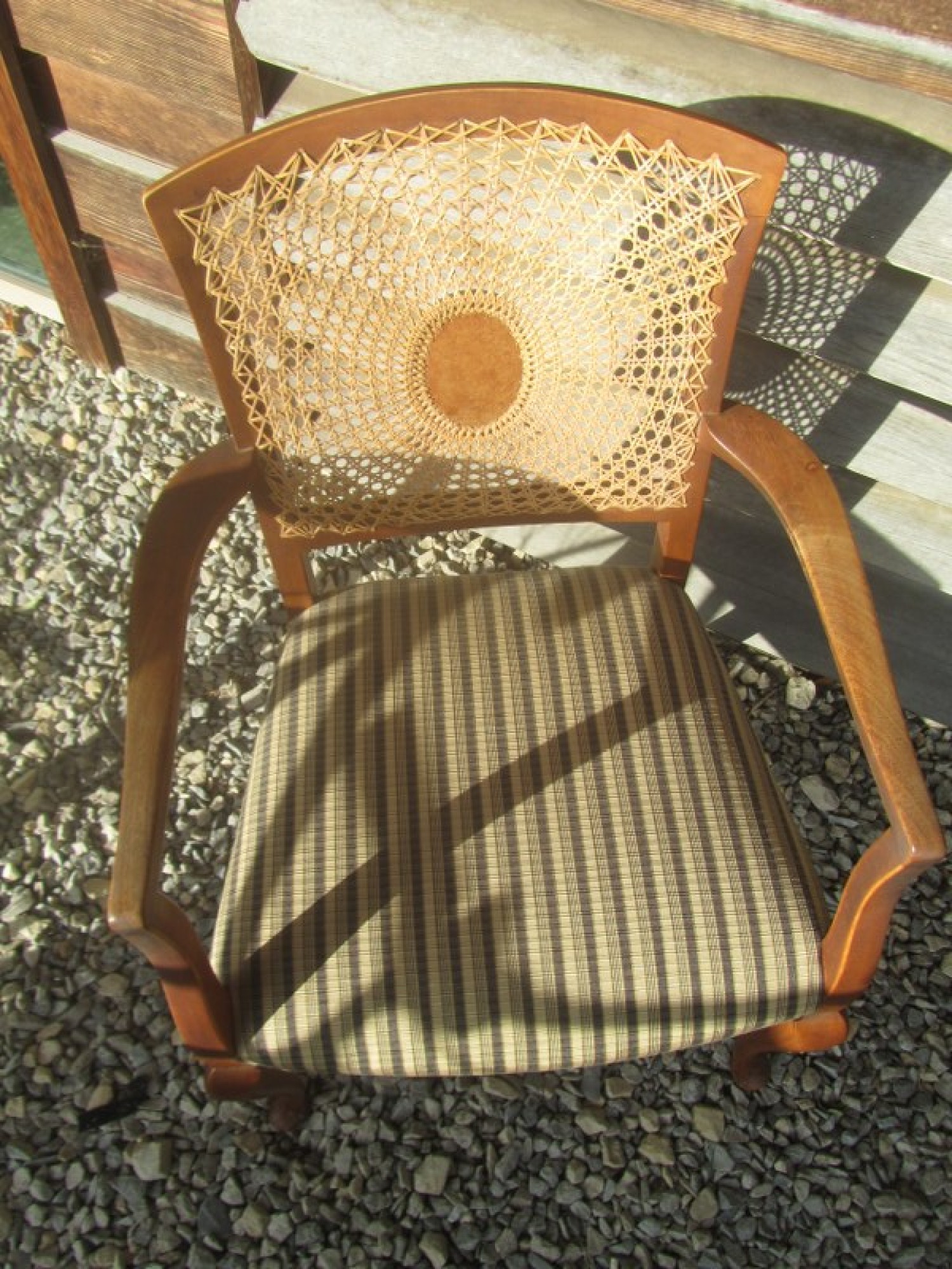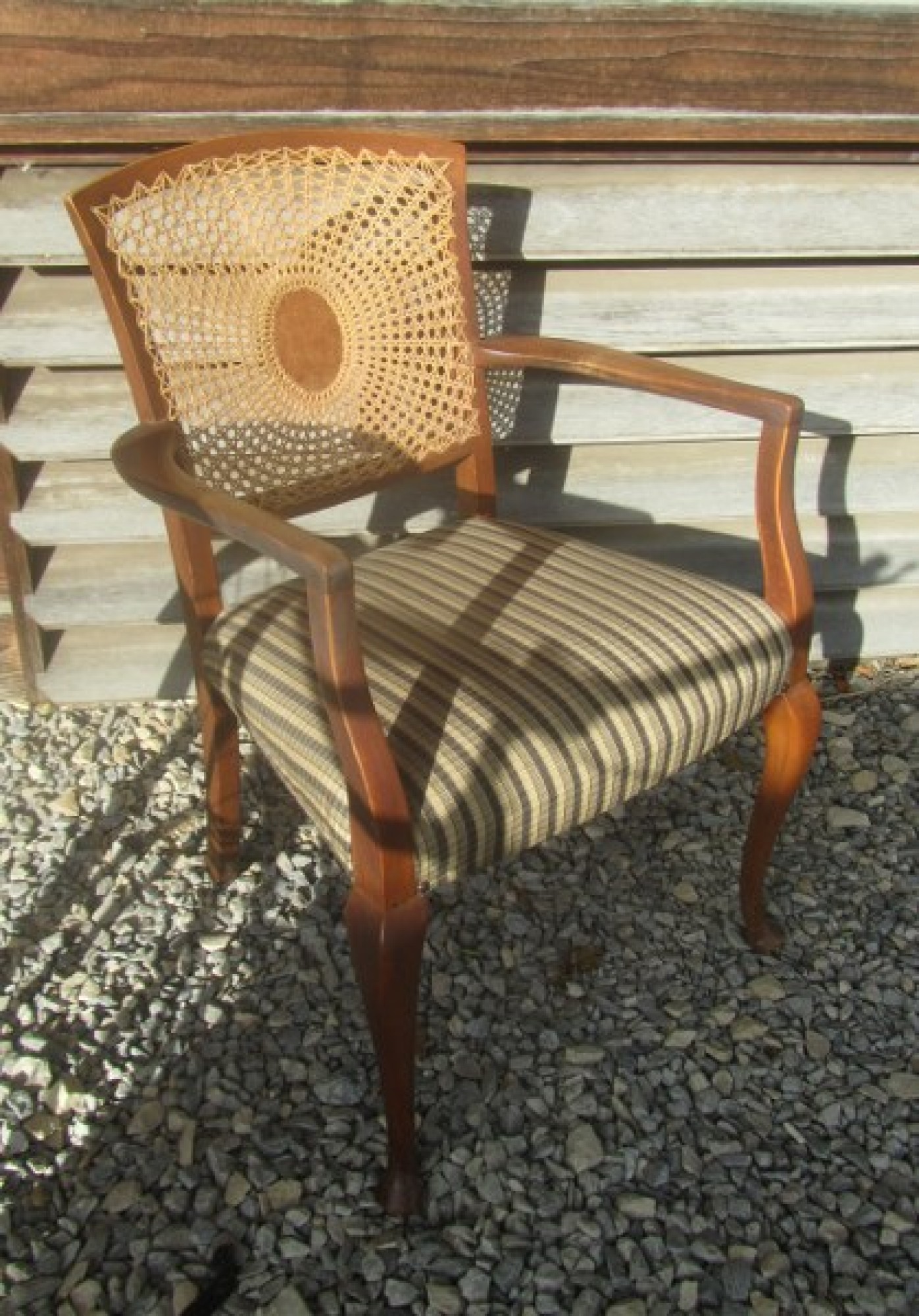 THIS IS A WALNUT ARMCHAIR, PADDED SEAT. A SIMPLE STYLISH CHAIR WITH WOVEN BACK REST. THIS DATES FROM AROUND THE 1940s. THE CHAIR IS IN AVERAGE CONDITION, HEIGHT TO SEAT - 44cm.