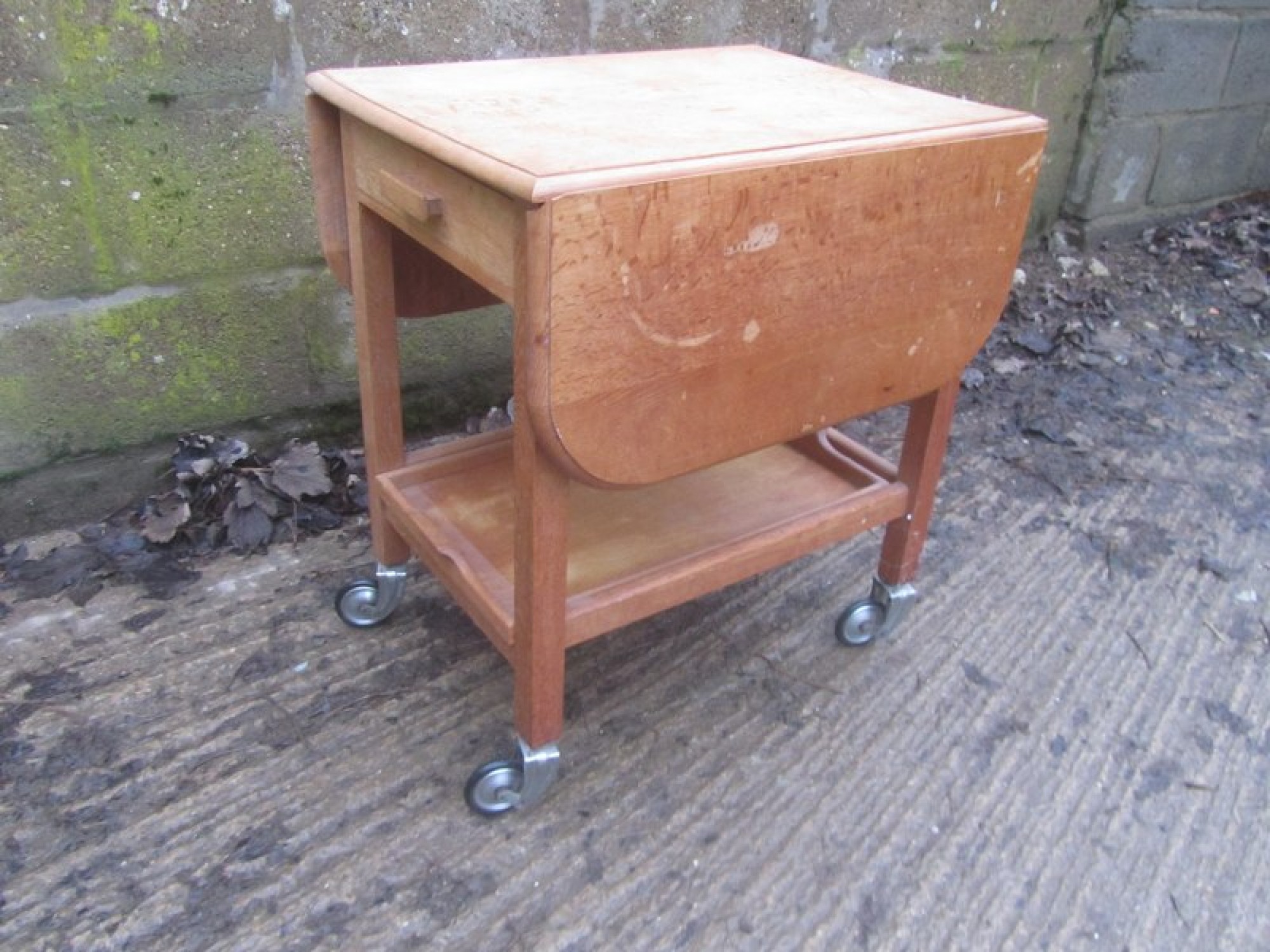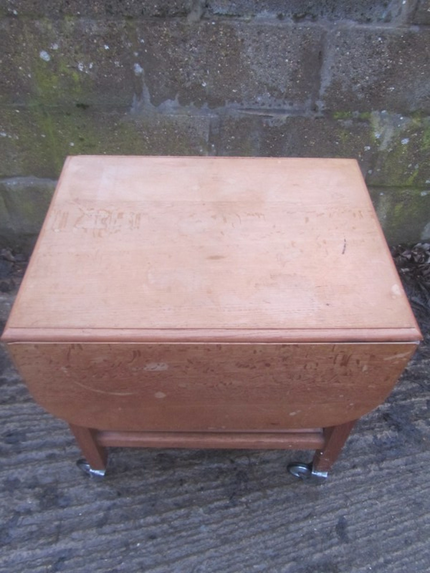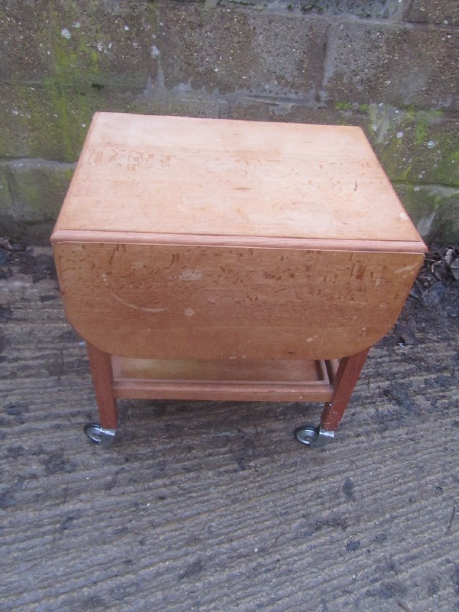 THIS IS A VINTAGE TEA TROLLEY. IT IS SOLID OAK. THERE ARE CASTORS ON THE END OF THE LEGS. THE TABLE TOP HAS DROP LEAVES EACH SIDE WHICH CAN BE PUT UP TO MAKE A LARGER TABLE TOP. IT IS IN AVERAGE CONDITION. STRUCTURALLY IT IS STRONG AND STURDY. DRAWER BELOW.