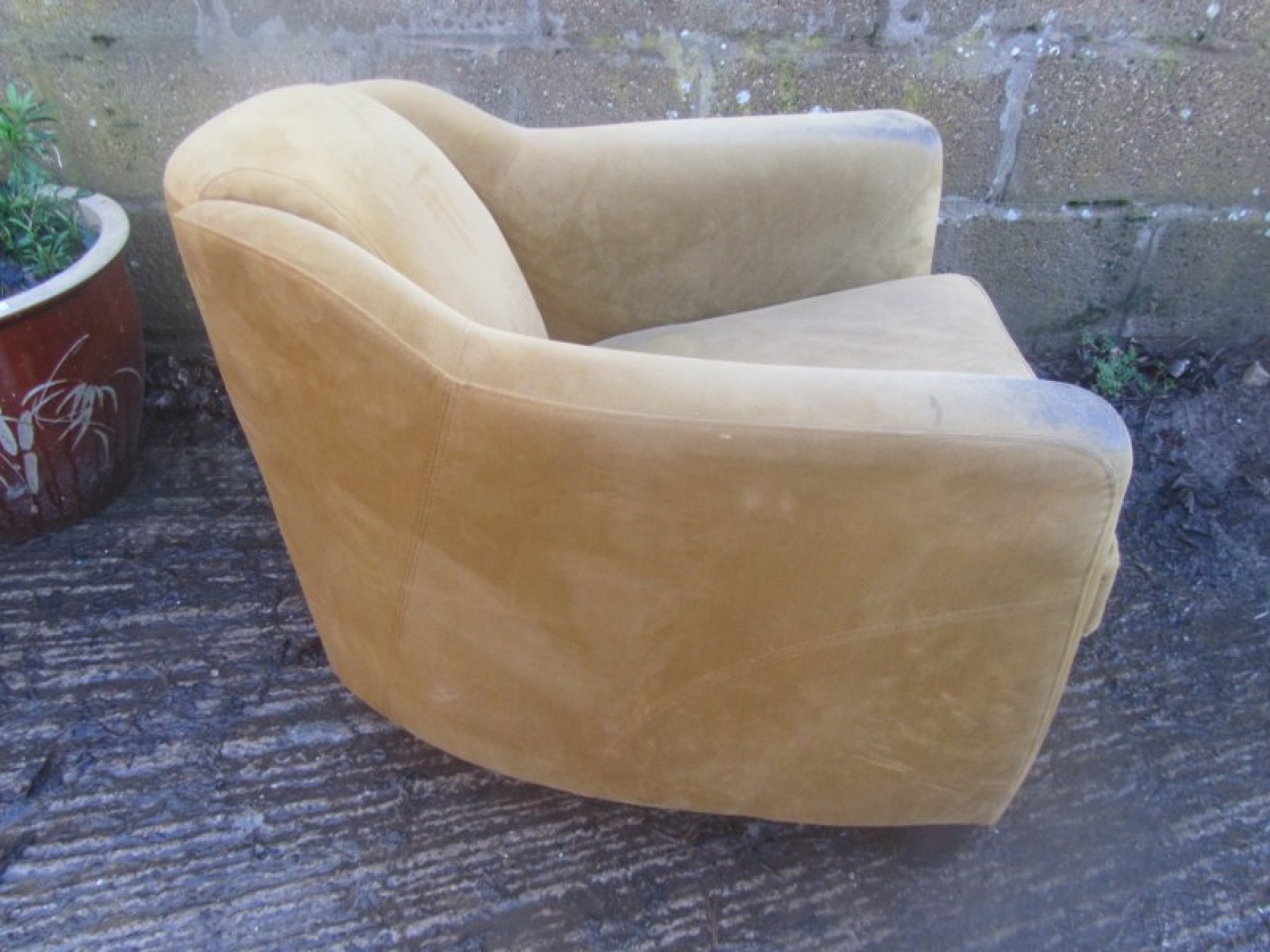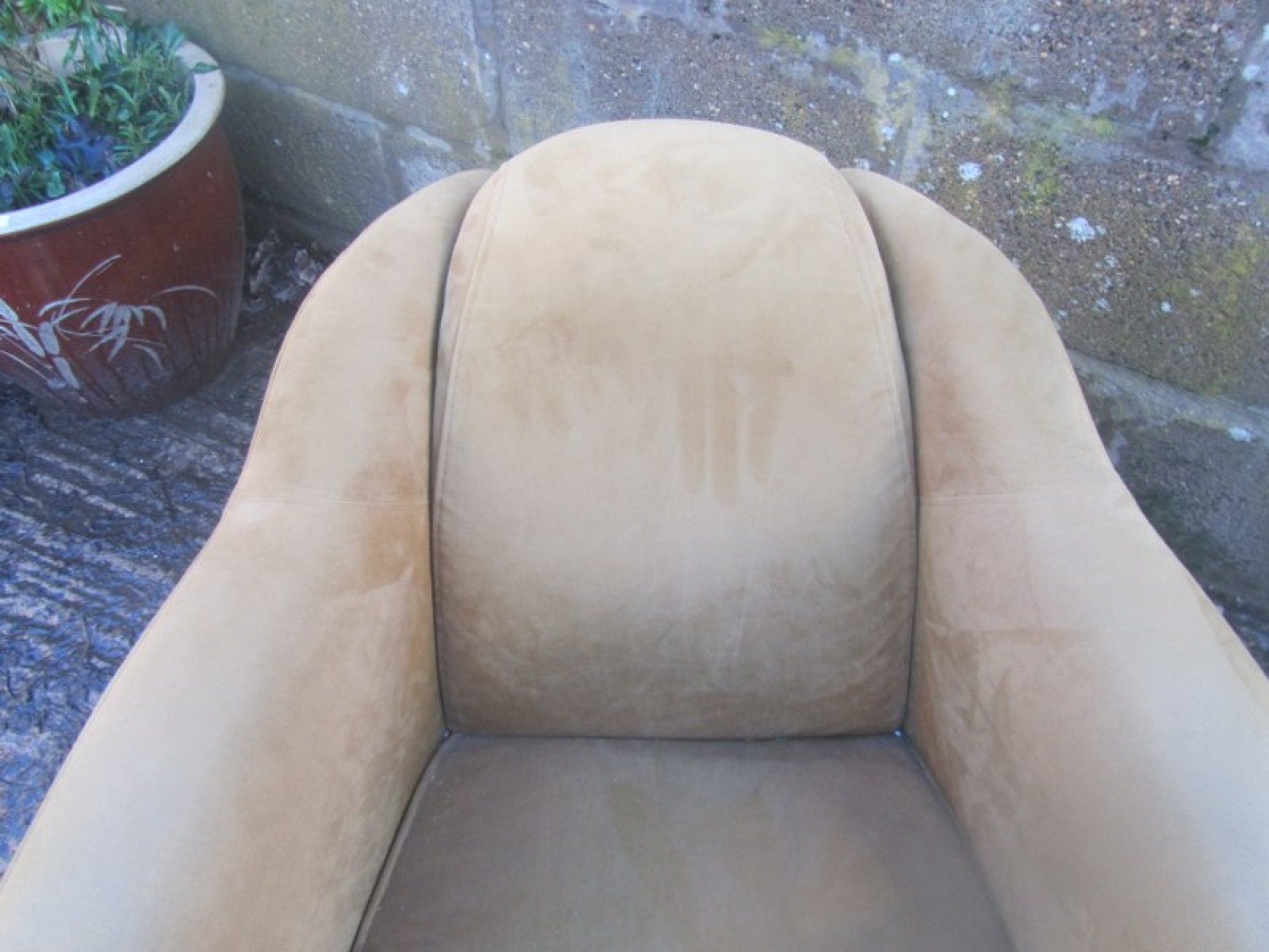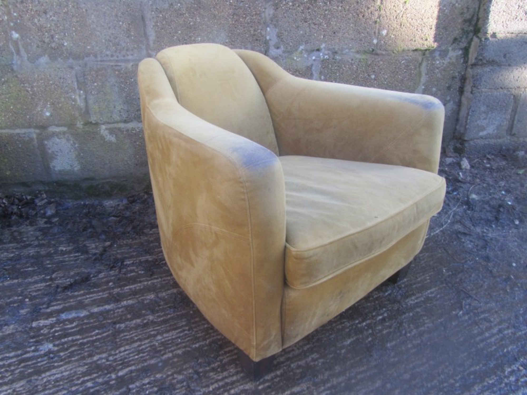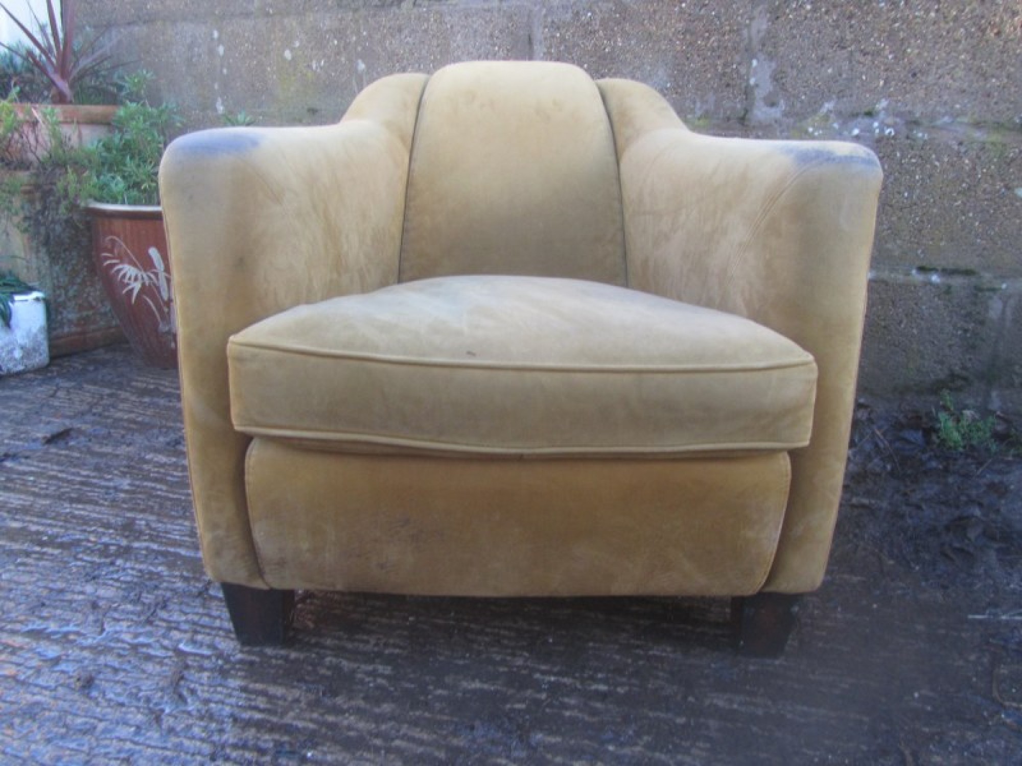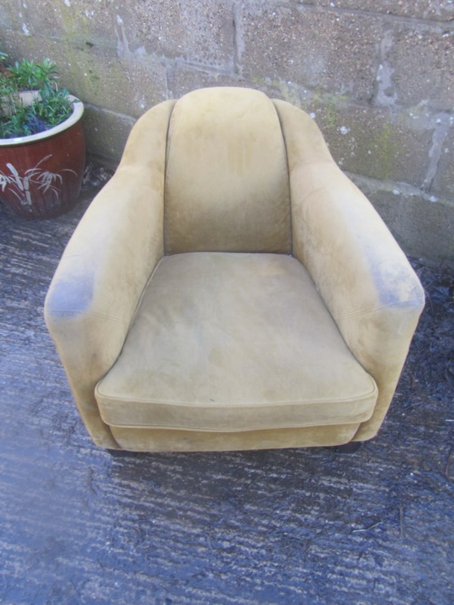 THIS IS A COMFORTABLE MODERN ARMCHAIR IN AN ART DECO STYLE. THE FRAME IS STURDY, IT TAPERS AT THE BACK AND STANDS ON 3 LEGS. THE UPHOLSTERY IS WORN AND STAINED, IDEAL PROJECT. IDEAL FOR THE LIVING ROOM, CONSERVATORY, OFFICE OR BEDROOM. A COMFORTABLE STURDY CHAIR.