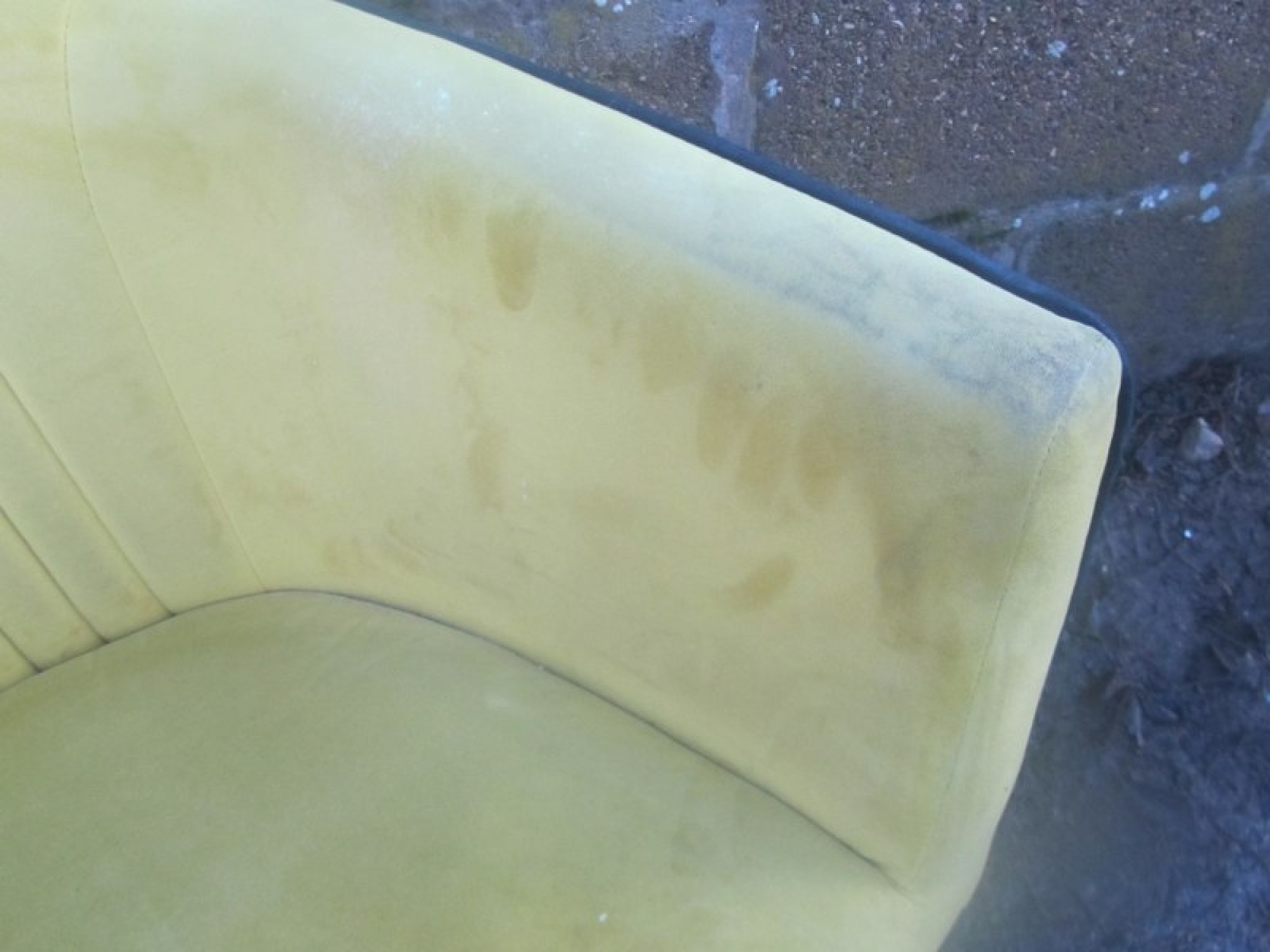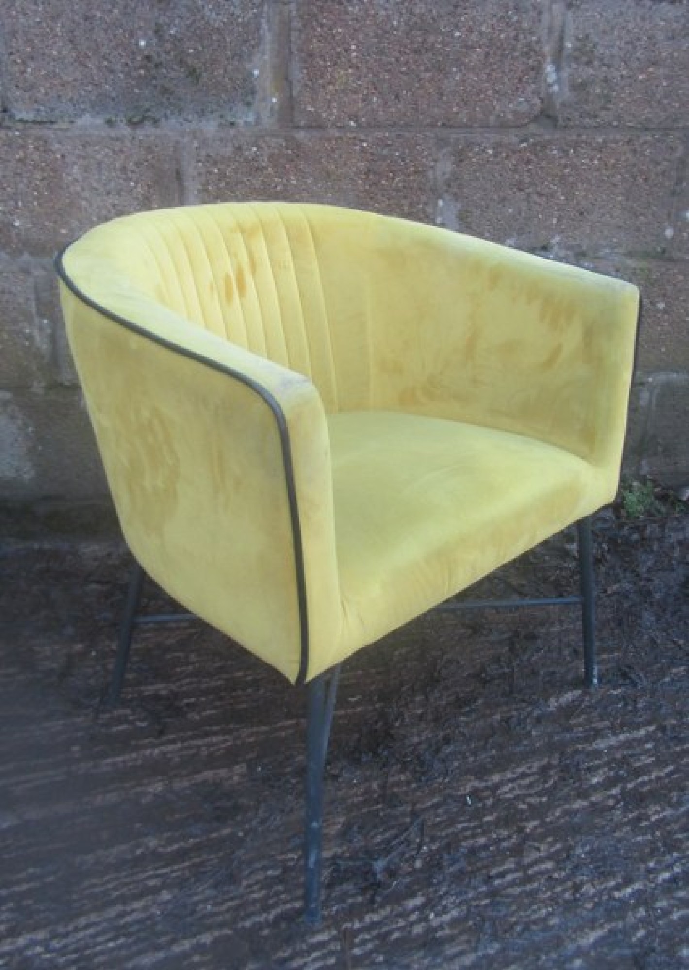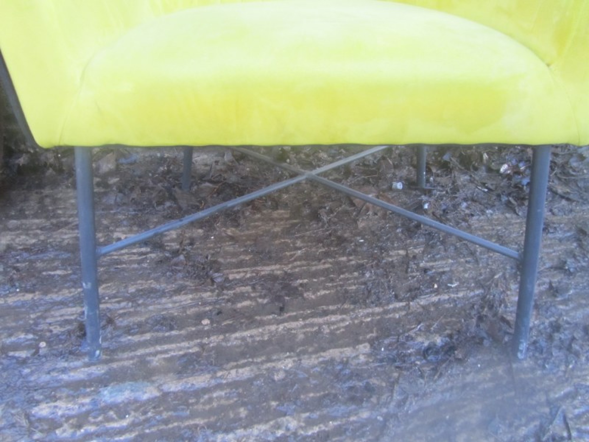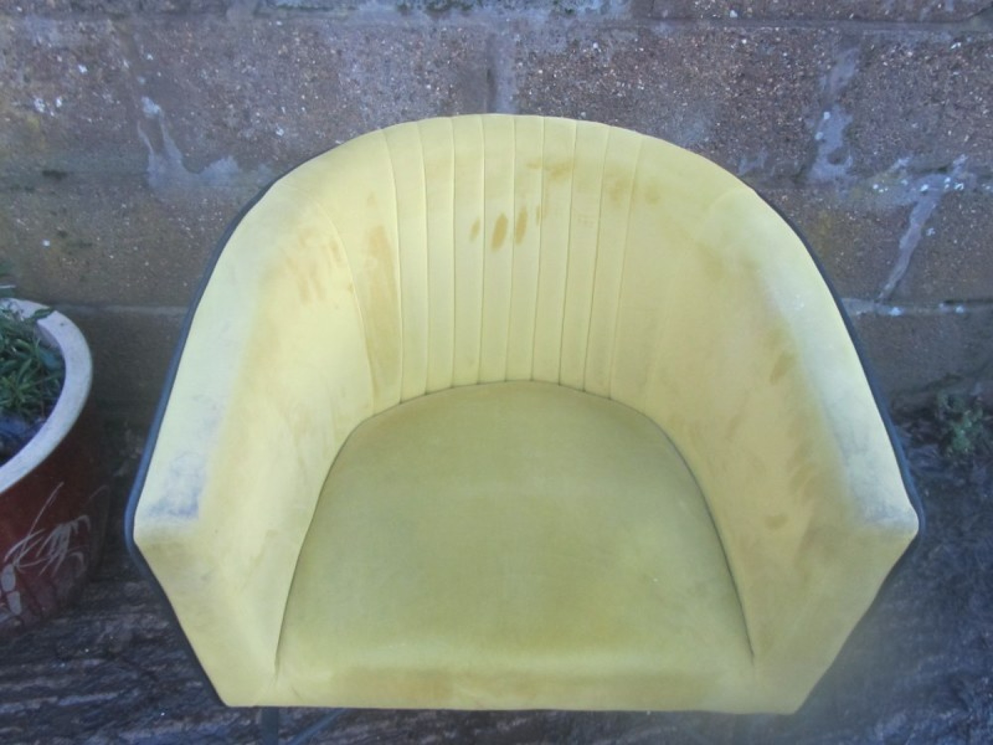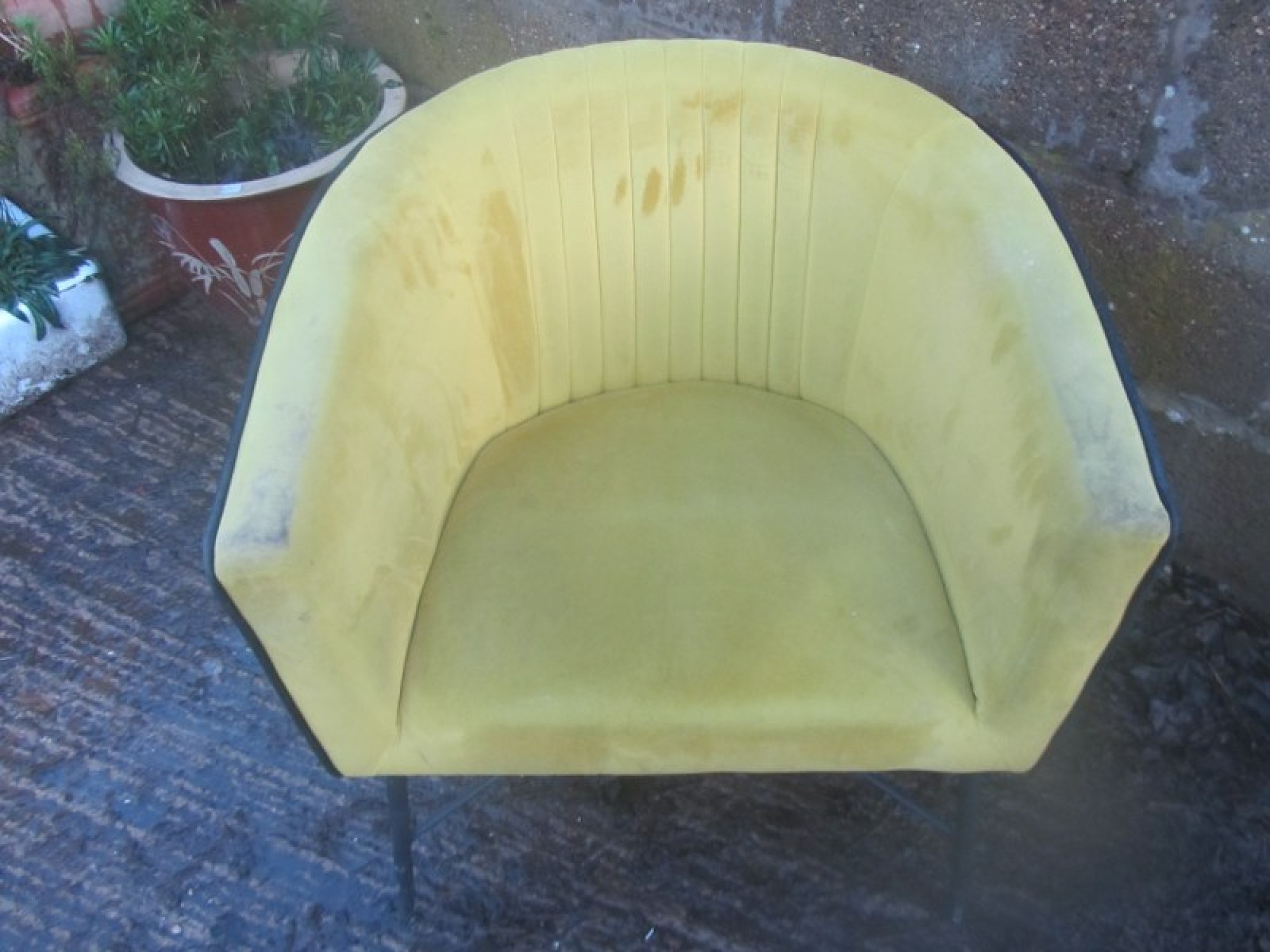 THIS IS A COMFORTABLE MODERN ARMCHAIR IN AN ART DECO STYLE. THE FRAME IS STURDY, METAL FRAME. THE UPHOLSTERY IS WORN AND STAINED, IDEAL PROJECT. IDEAL FOR THE LIVING ROOM, CONSERVATORY, OFFICE OR BEDROOM. A COMFORTABLE STURDY CHAIR.