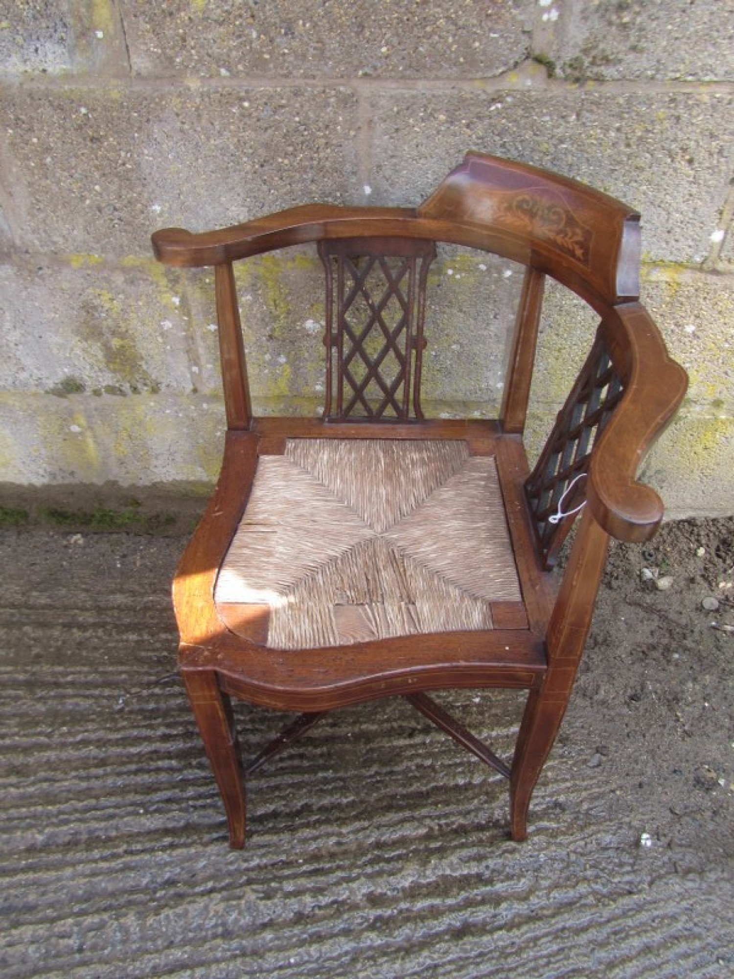 THIS IS AN ANTIQUE CORNER CHAIR. MADE FROM SOLID MAHOGANY. THE SEAT IS WOVEN, SOME IS DAMAGED AND MISSING. IDEAL FOR ANYWHERE IN THE HOME, COULD BE USED AS BEDROOM OR HALL CHAIR. HEIGHT TO SEAT IS 43cm.