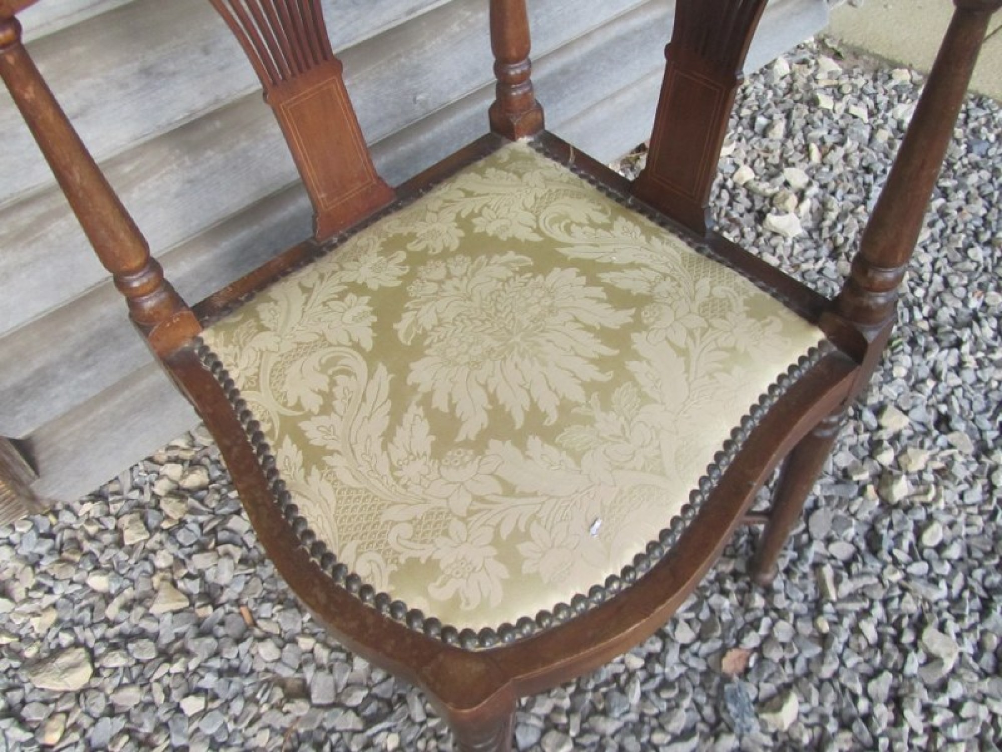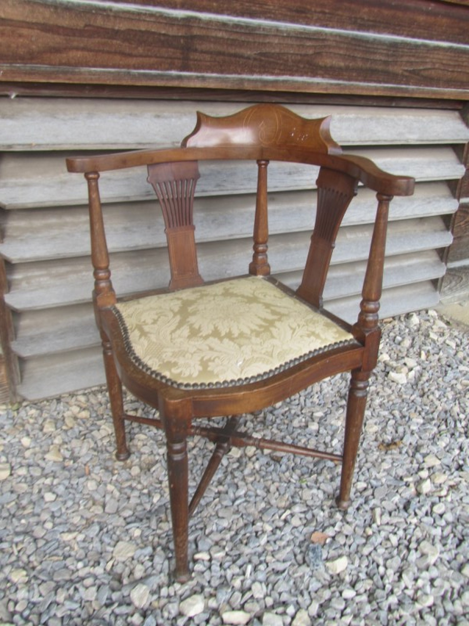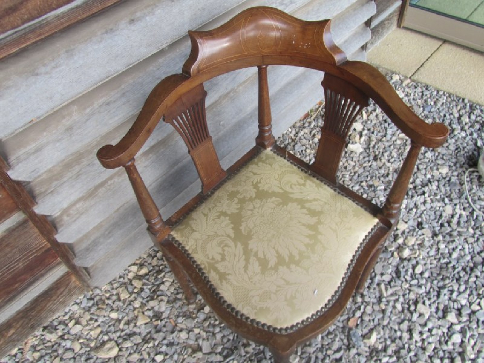 THIS IS AN ANTIQUE CORNER CHAIR. MADE FROM SOLID MAHOGANY. THE SEAT IS PADDED, CLEAN AND IN GOOD CONDITION. IDEAL FOR ANYWHERE IN THE HOME, COULD BE USED AS BEDROOM OR HALL CHAIR. HEIGHT TO SEAT IS 41cm.