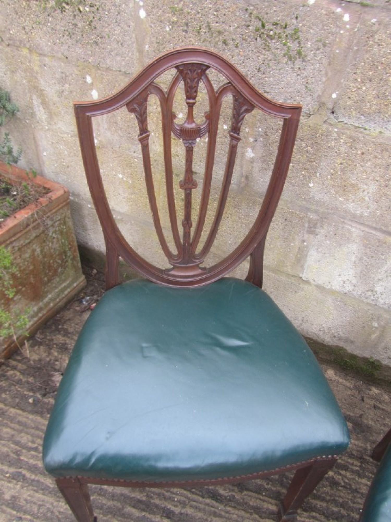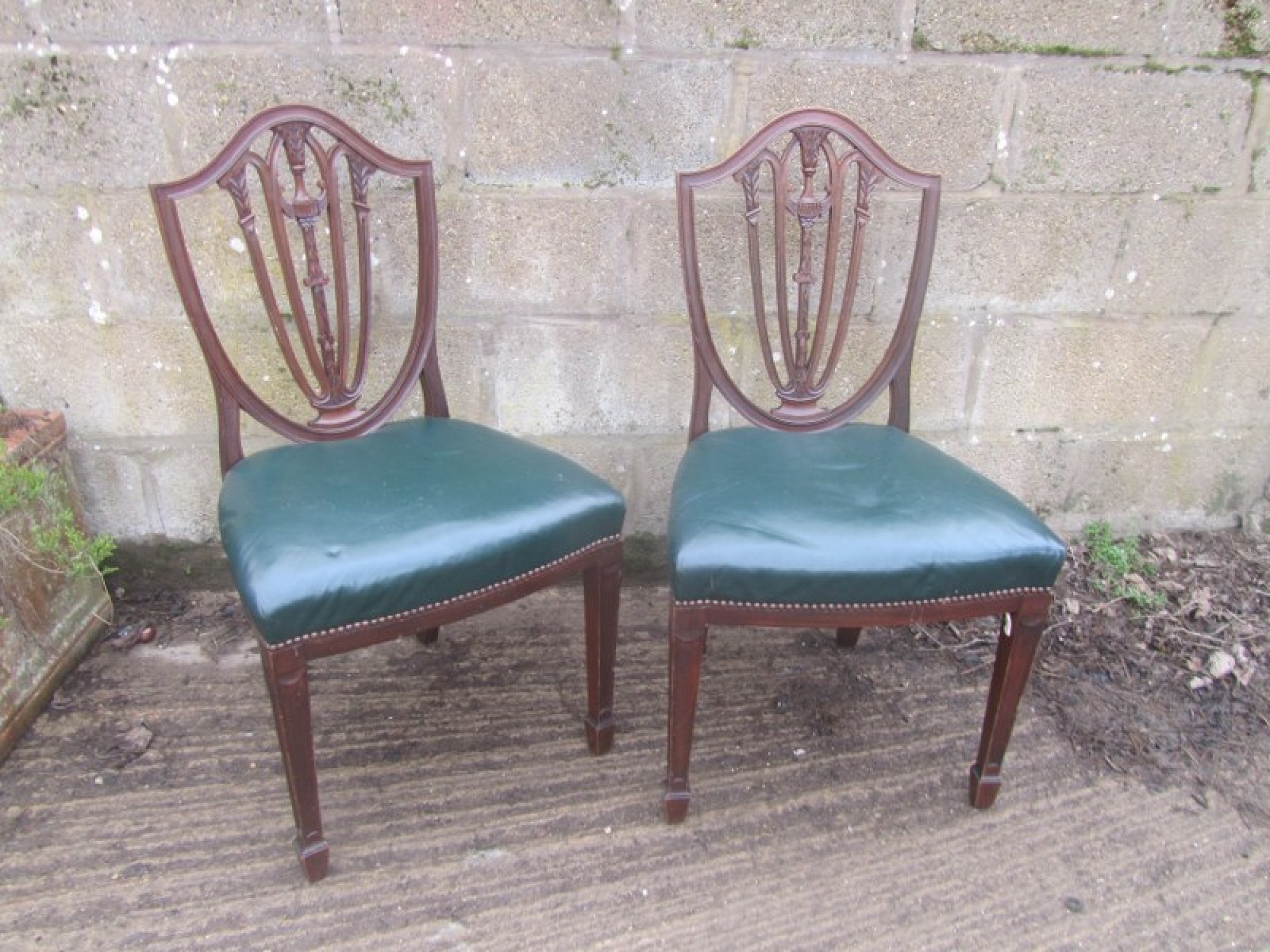 PAIR OF ANTIQUE MAHOGANY DINING / BEDROOM CHAIRS. PADDED SEATS, COVERED IN GREEN LEATHER.