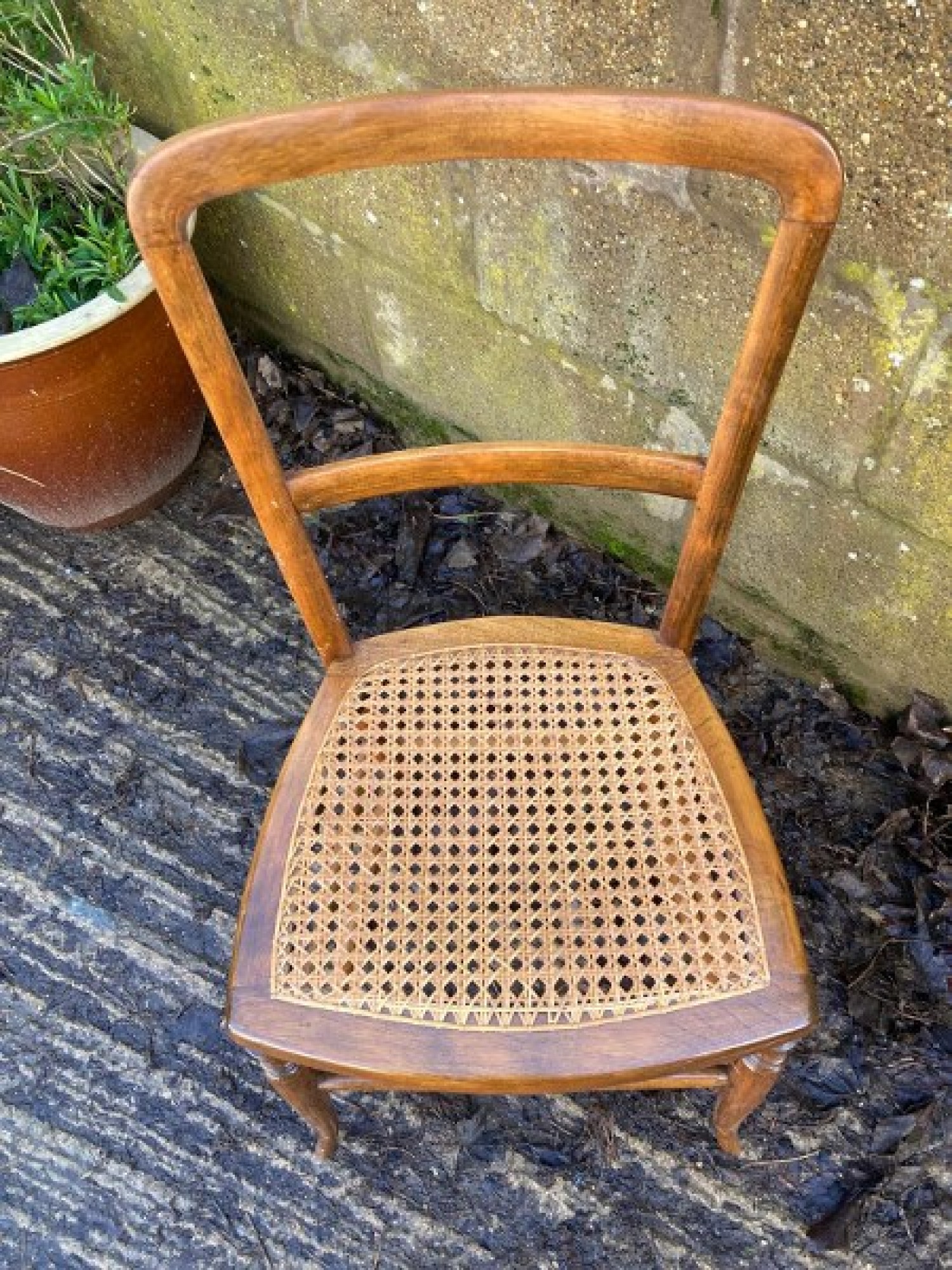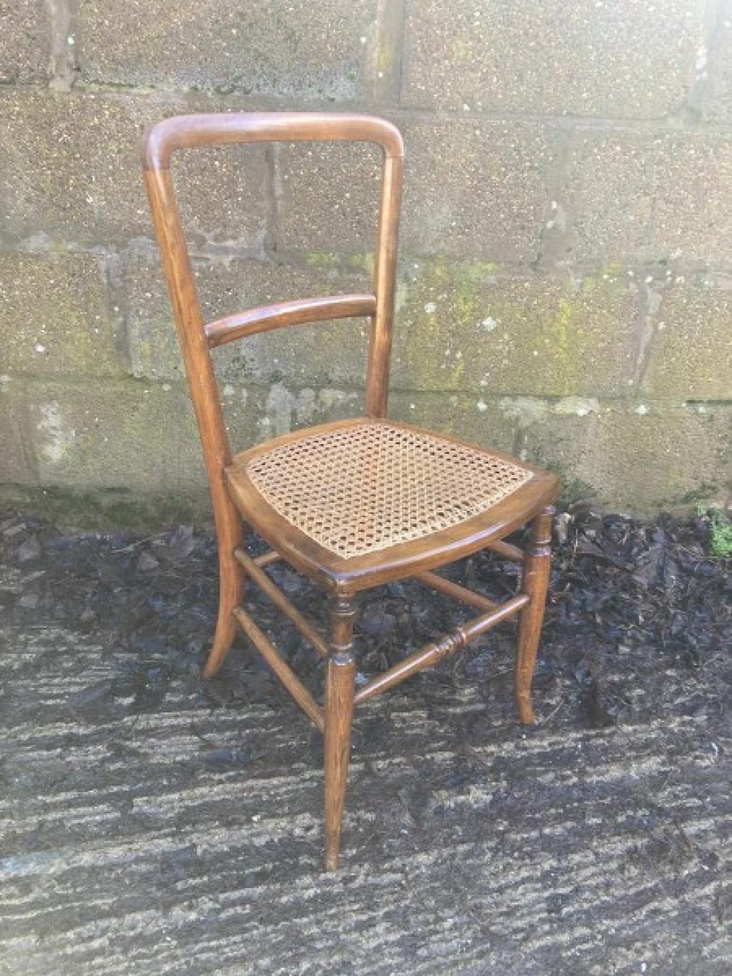 A SMALL BEDROOM CHAIR IN SOLID MAHOGANY. THE SEAT IS WOVEN CANE. SEAT HEIGHT IS 43cm.
