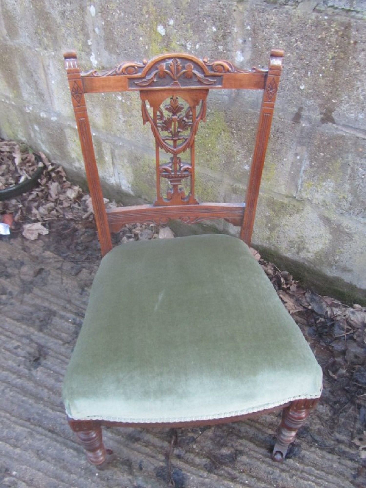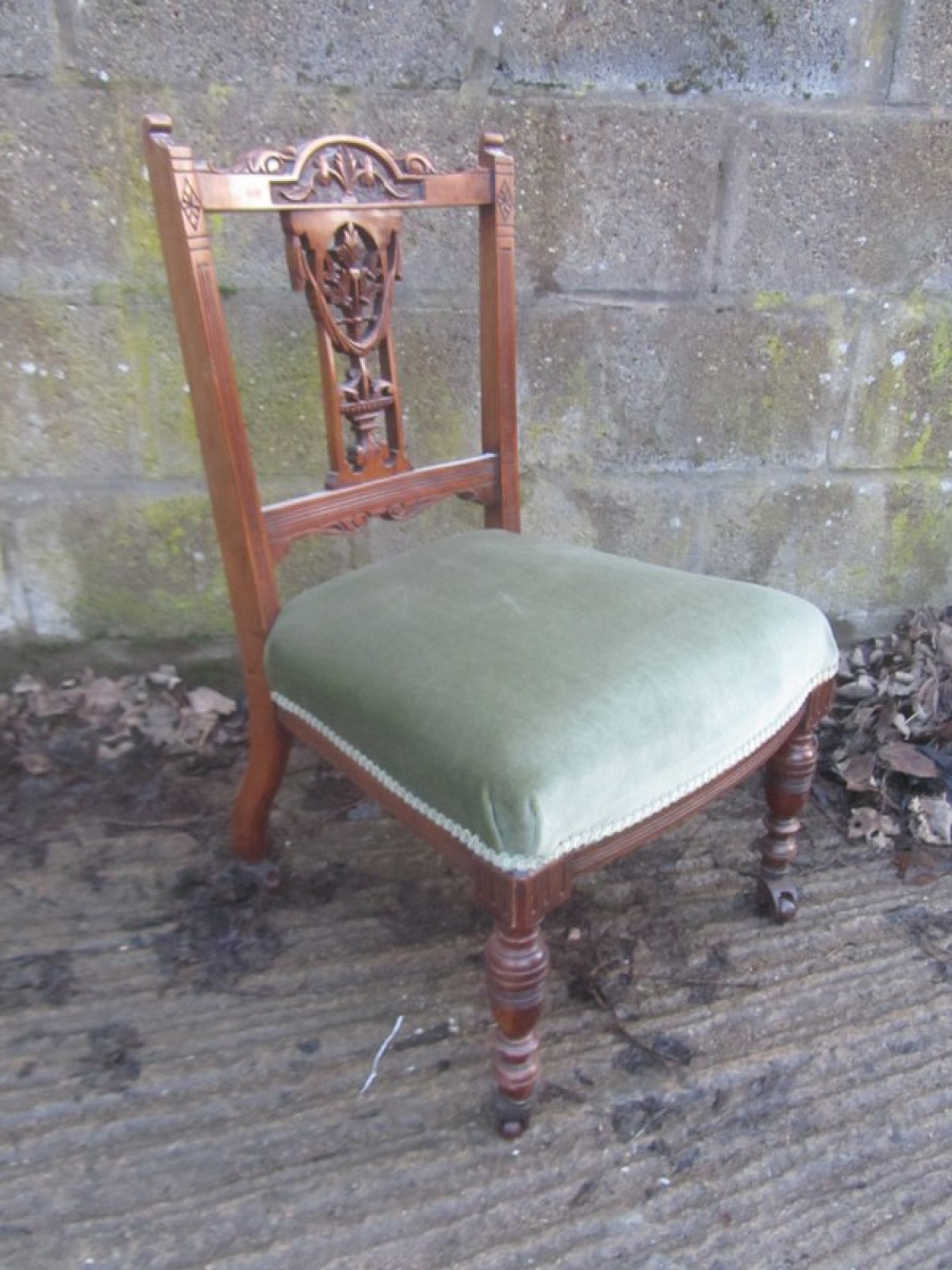 THIS IS A LOW NURSING CHAIR. IT DATES FROM AROUND THE 1880s. THERE IS DECORATIVE DETAIL ON THE BACK REST. THE FRAME IS STURDY. IN GOOD CONDITION. IDEAL FOR ANYWHERE IN THE HOME. MINOR WEAR AND TEAR. HEIGHT TO SEAT IS 40cm.
