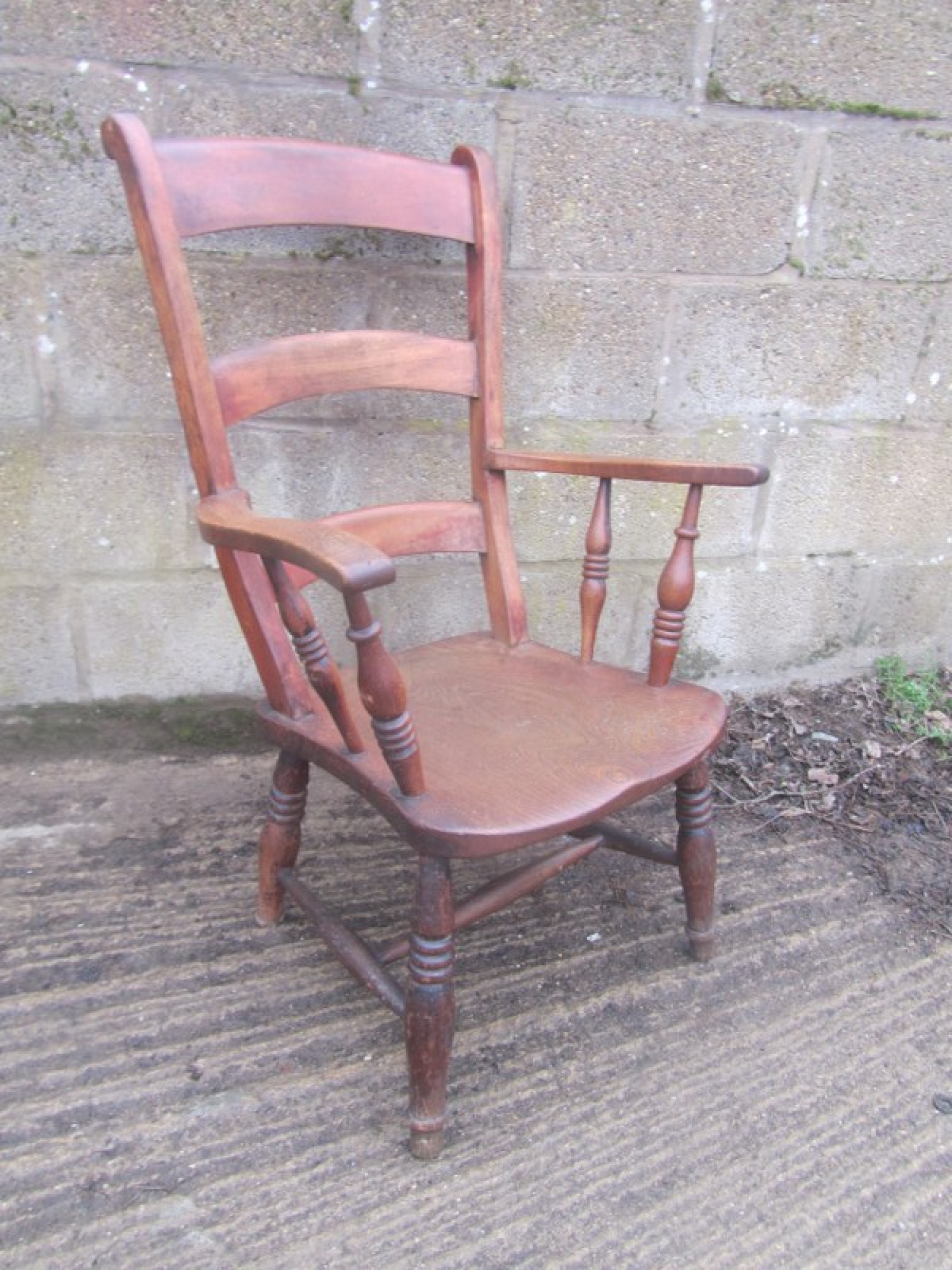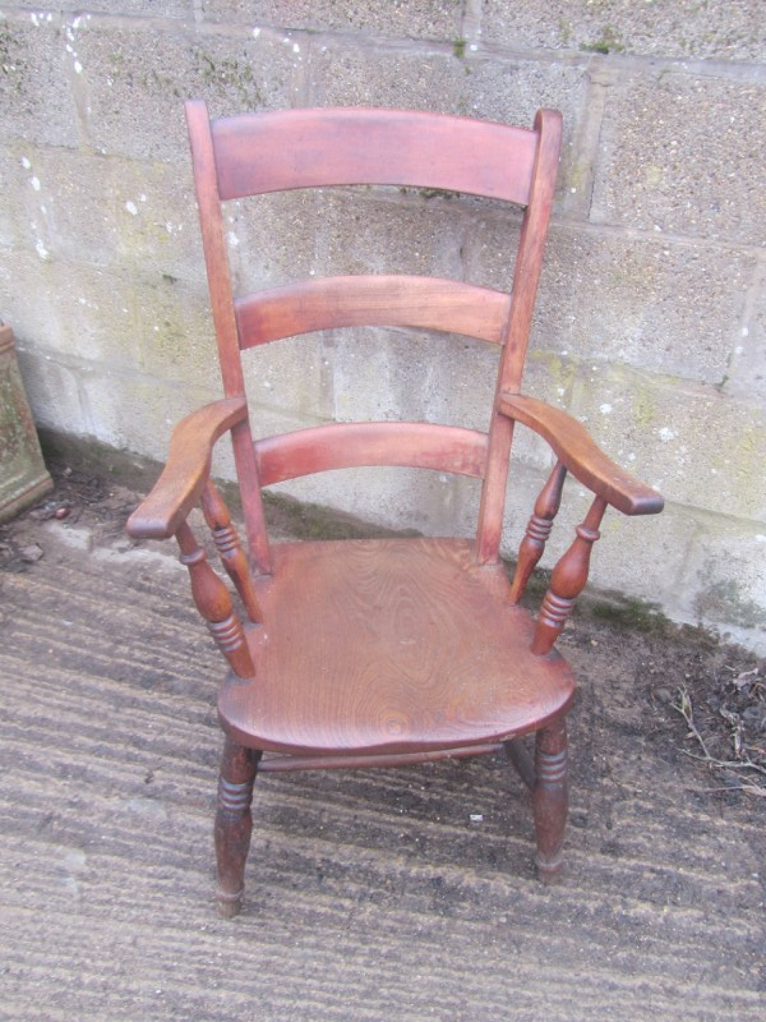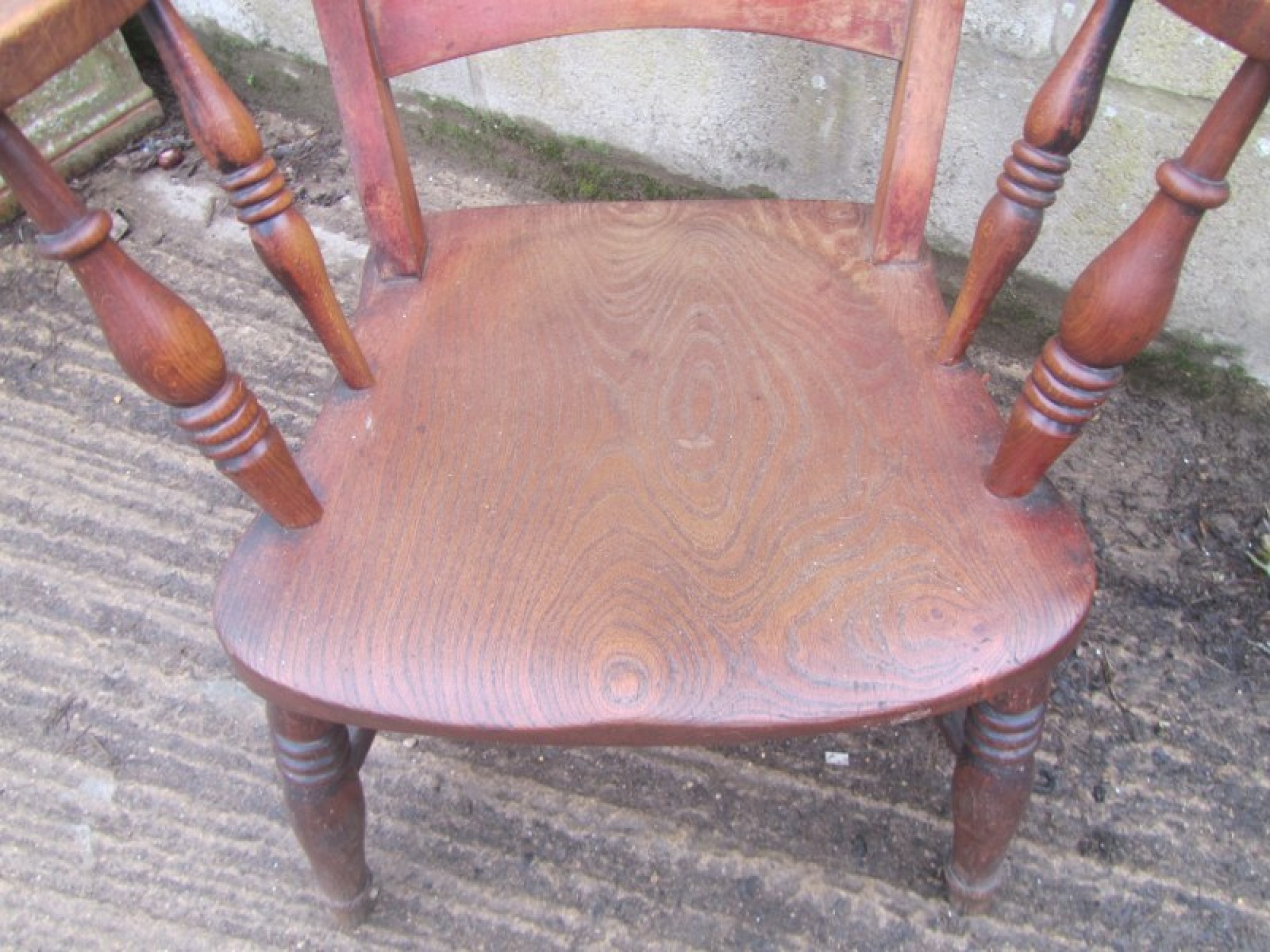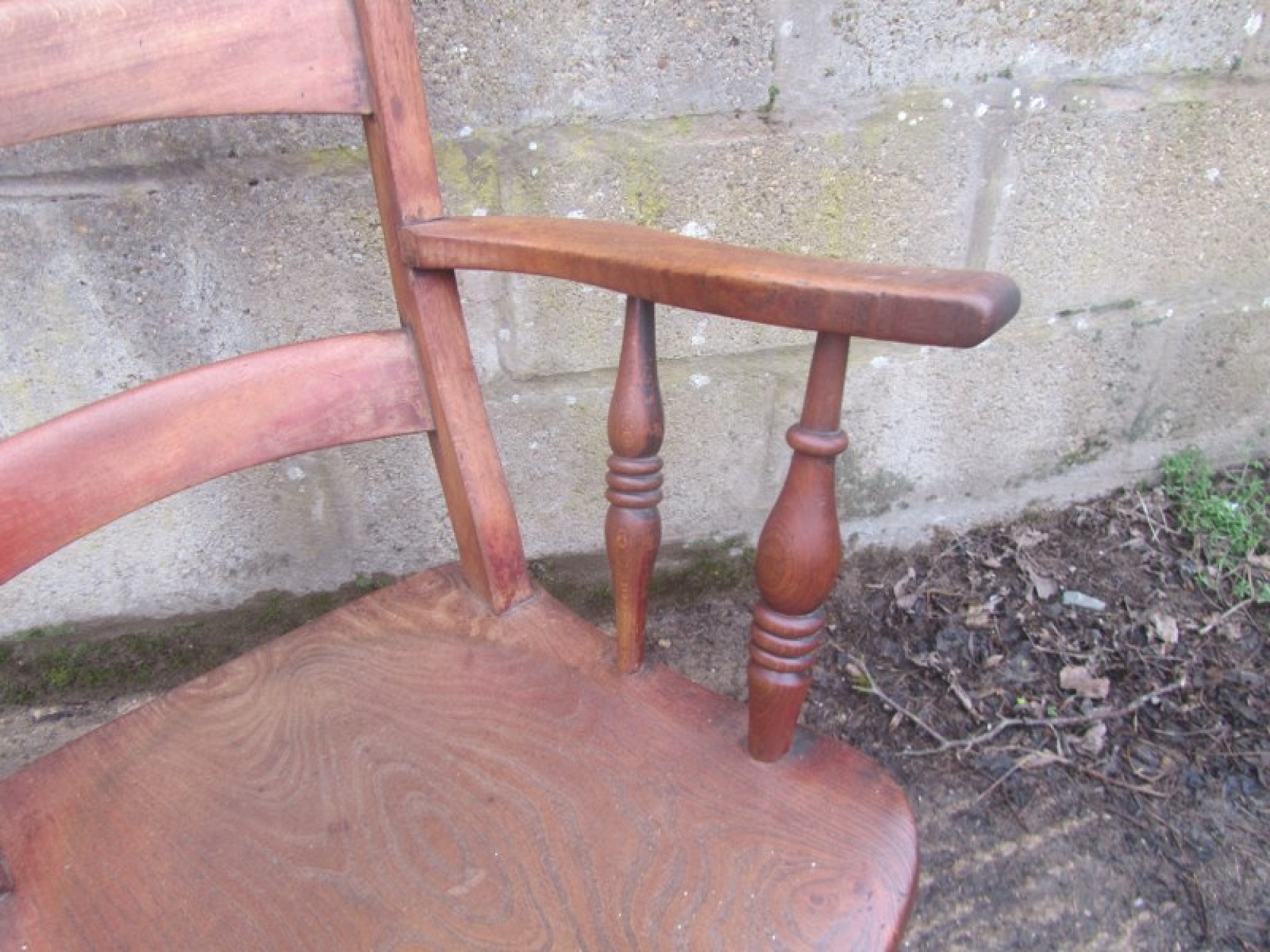 THIS IS A GRANDFATHER CHAIR. IT HAS A SOLID BEECH FRAME AND ELM SEAT, AN ATTRACTIVE CHAIR FOR ANYWHERE IN THE HOME. THE WOOD IS IN AVERAGE CONDITION FOR ITS AGE, SOME WEAR AND TEAR, GOOD PATINA.