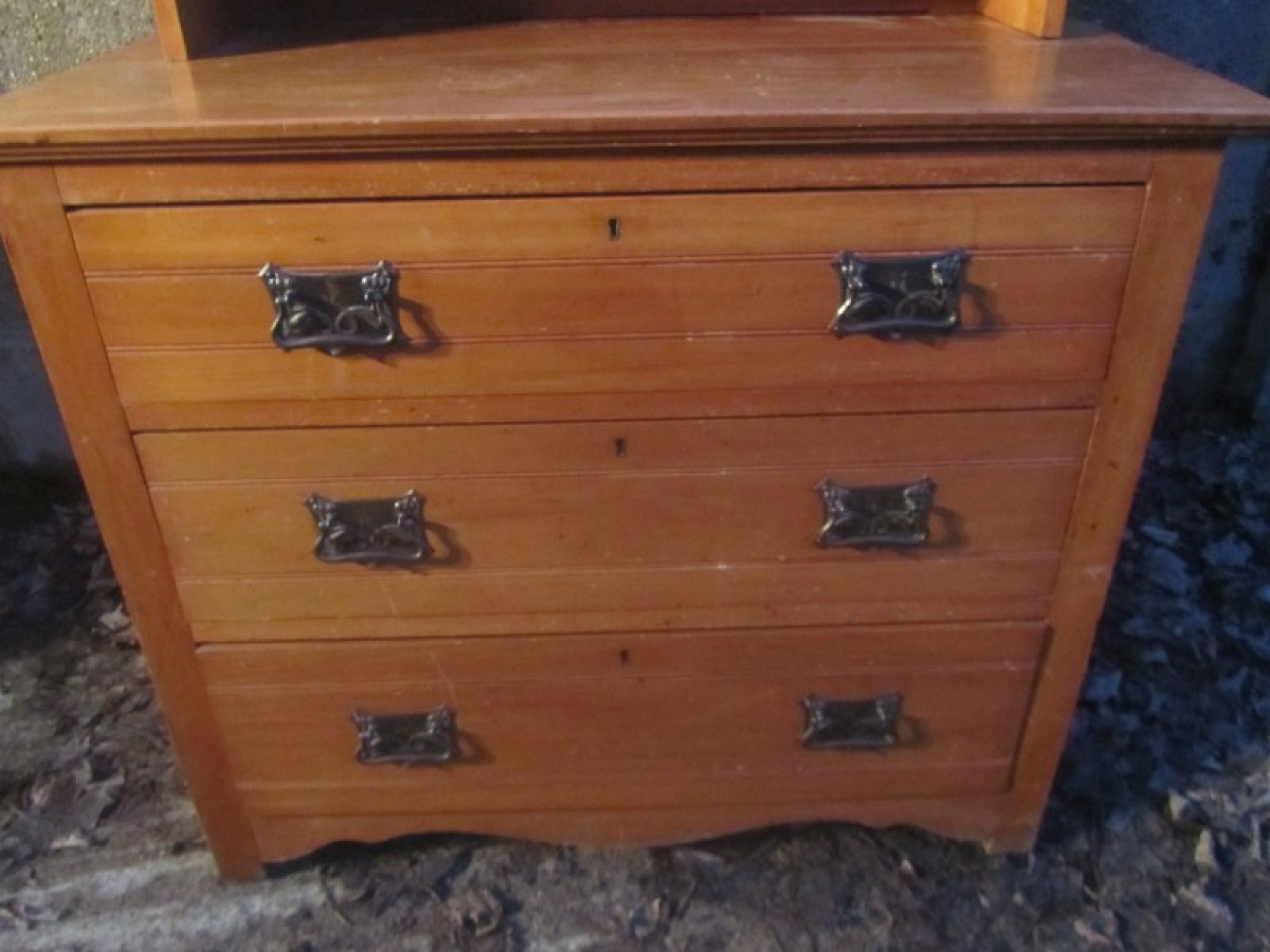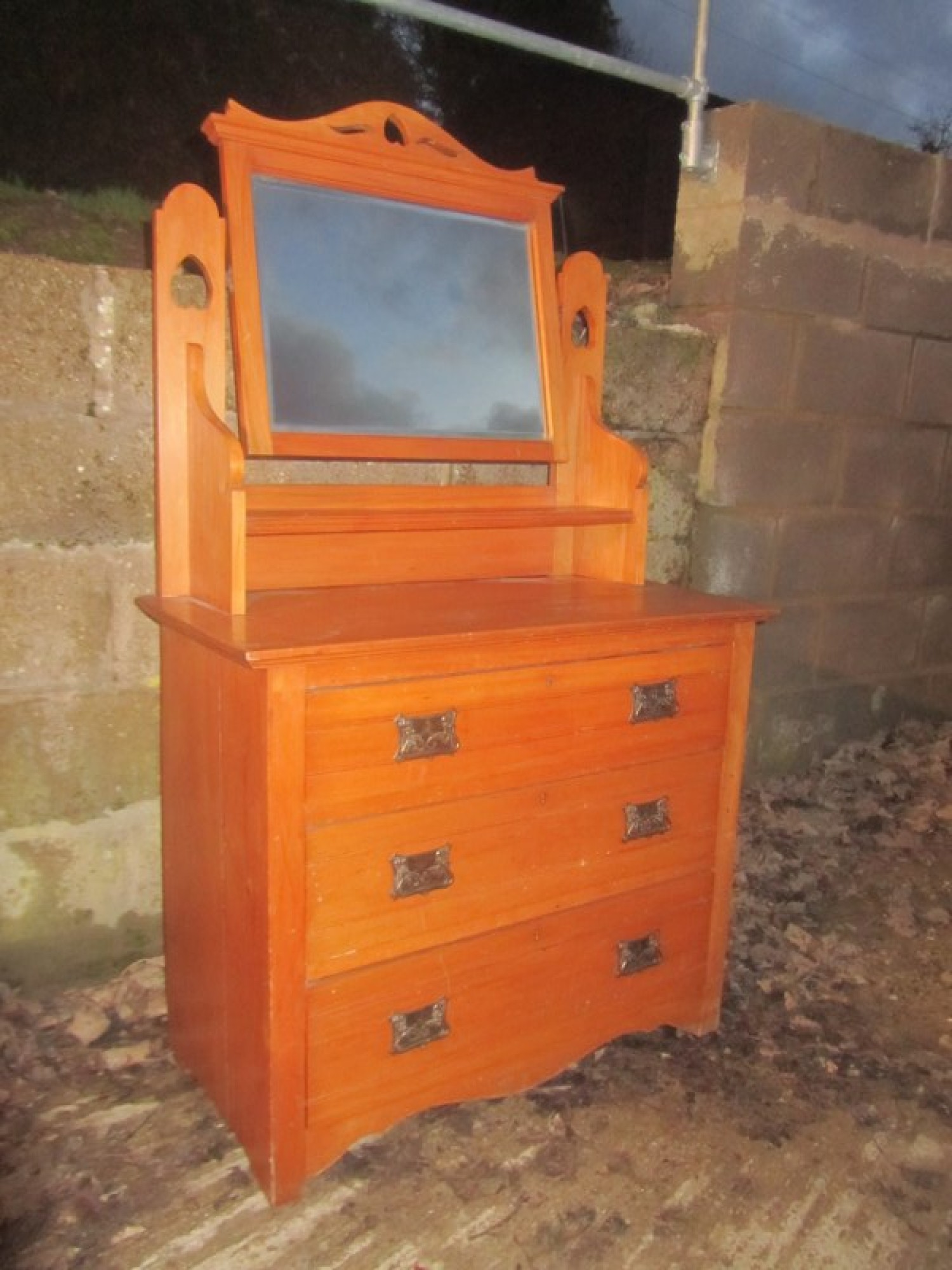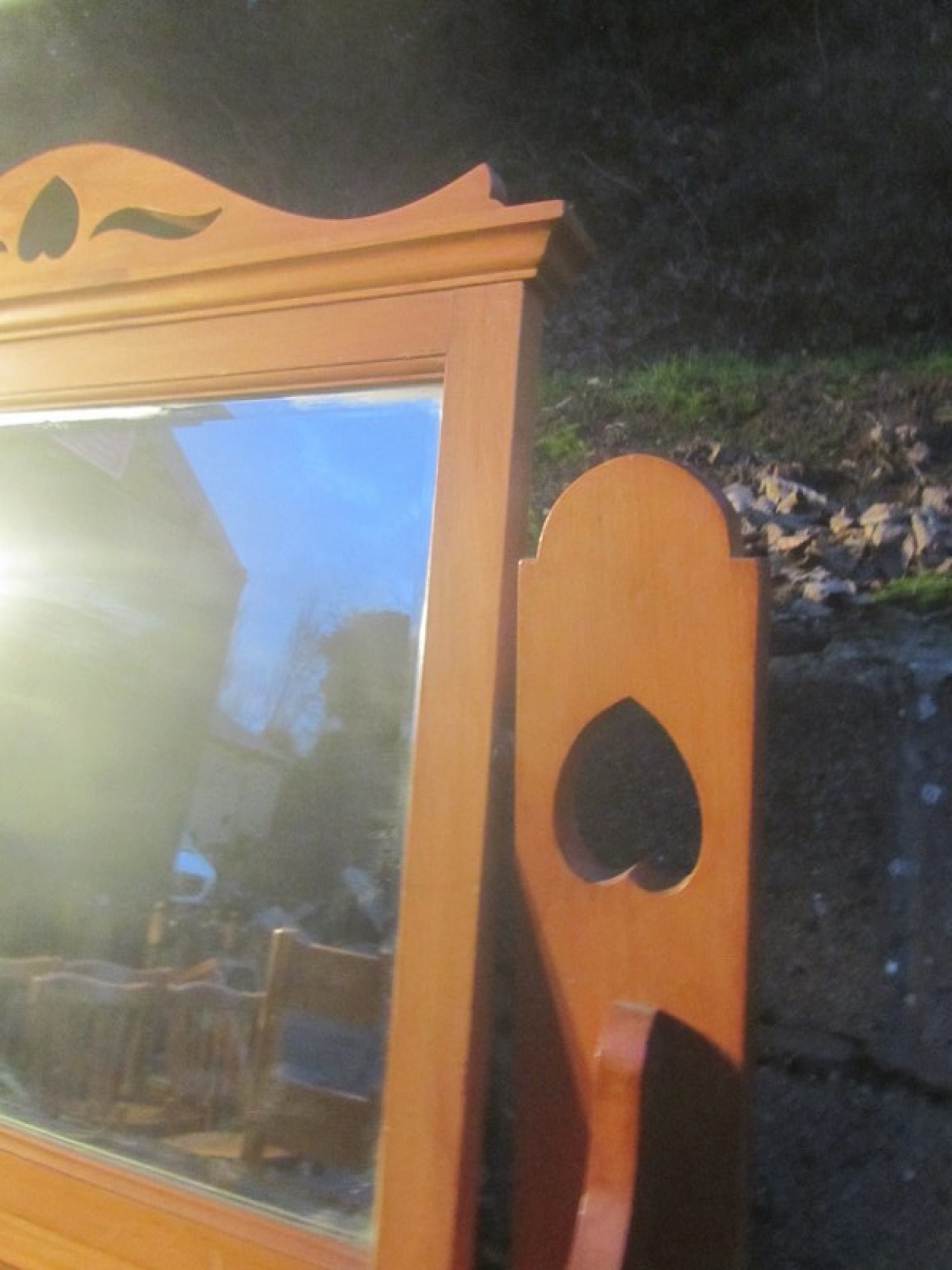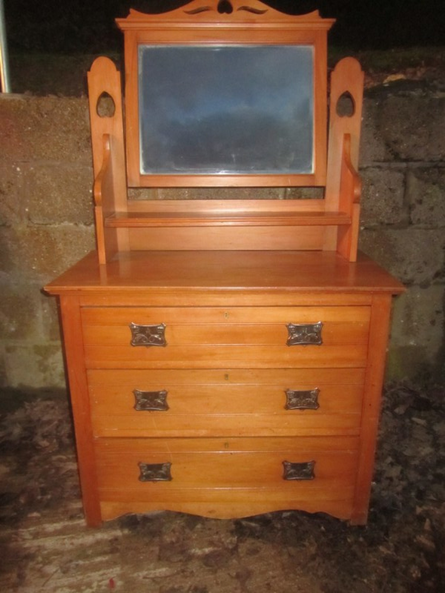 THIS IS A STYLISH ANTIQUE SATINWOOD DRESSING TABLE, THE DRAWERS ARE DOVETAILED. GOOD QUALITY. IT IS STRONG AND STURDY. MIRROR ABOVE. SPLIT ON THE LEFT HAND SIDE, STILL STURDY.
