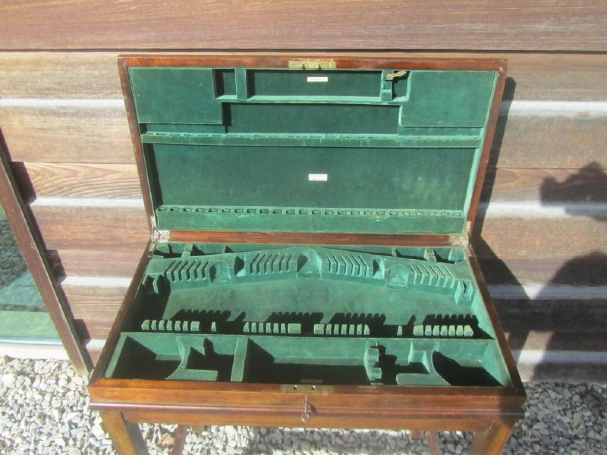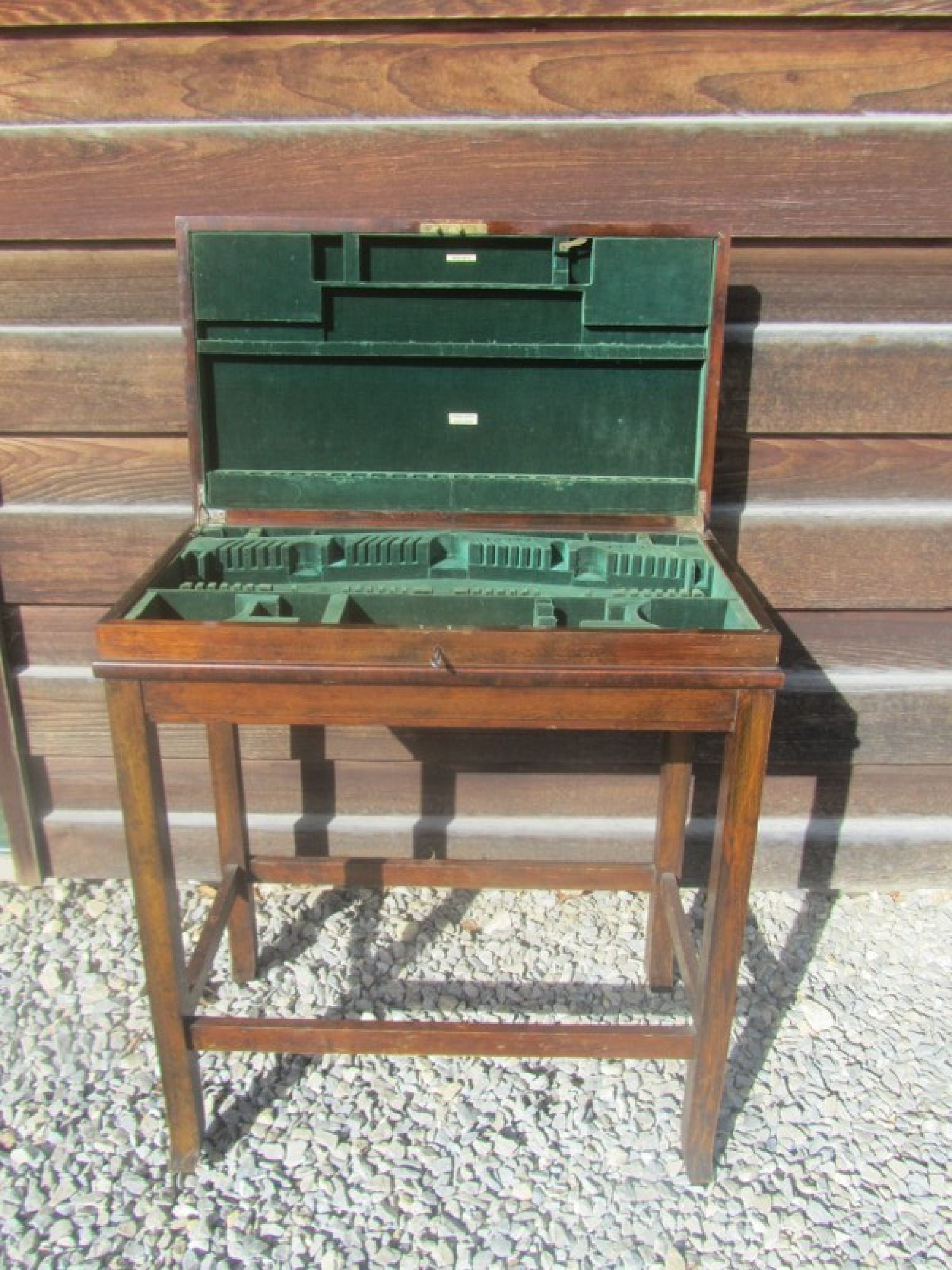 Items for Sale ANTIQUE WALNUT CUTLERY CANTEEN CABINET / TABLE Share: View Larger Image View Larger Image View Larger Image View Larger Image View Larger Image Select to enlarge Swipe £ 40 A WALNUT CABINET, A COMPACT SIZE. WITH LOCK & KEY. INSIDE THERE IS STORAGE SPACE FOR A LARGE CANTEEN OF CUTLERY. THE INTERIOR IS FITTED WITH GREEN BAIZE. METAL PLAQUE ON TOP (INSCRIBED) SOME WEAR AND TEAR. CUTLERY NOT INCLUDED. ADDITIONAL DETAILS RESERVE ITEM Condition:AVERAGE Manufacture Date:1930s Height:75 cms Length:67 cms Depth:38 cms Quantity:1 Item Number:41382 * Please complete all the fields below to send an enquiry about this product. Please reserve this item for me… Reset Send