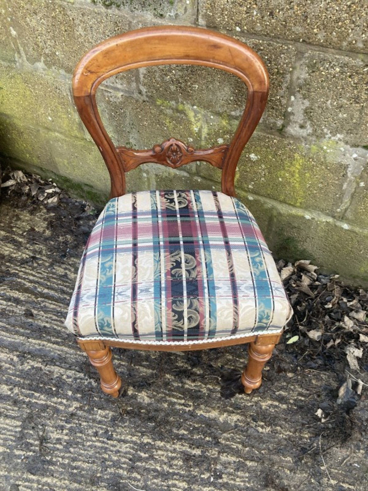 A CHAIR FROM THE LATE VICTORIAN PERIOD. MADE FROM MAHOGANY. BALLOON BACK WITH TURNED LEGS. THE SEAT IS COVERED IN MATERIAL, EASY TO RECOVER. HEIGHT TO SEAT IS 50cm.
