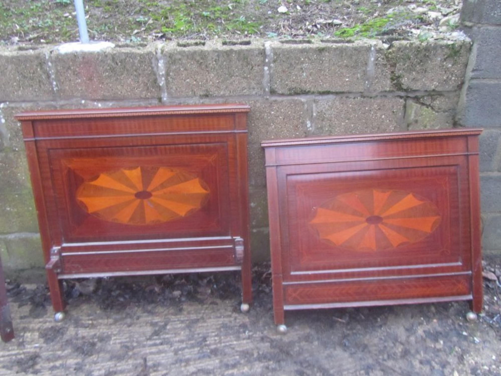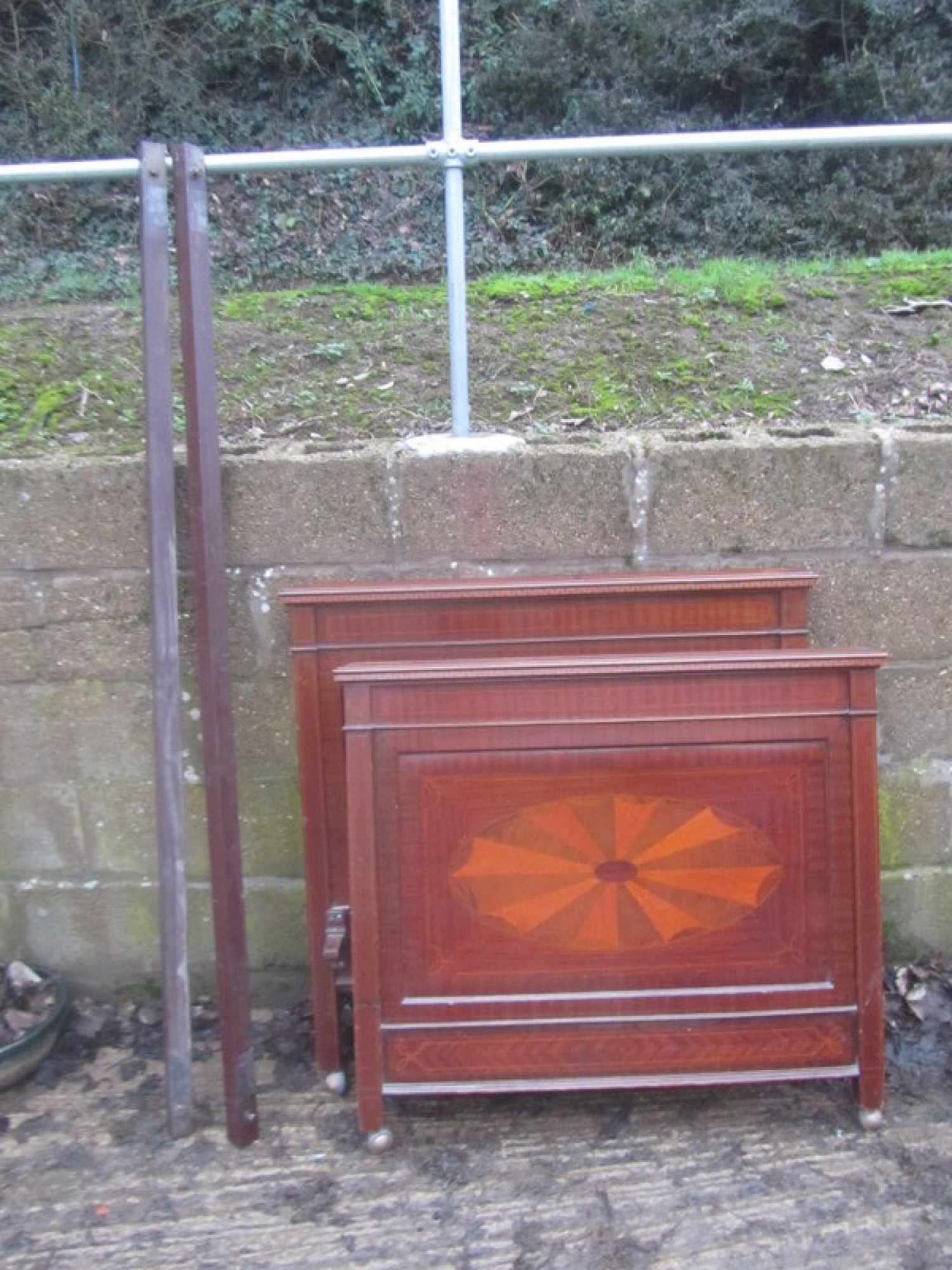 THIS IS A STURDY SINGLE 3' BED FRAME FROM THE 1900s. THE ENDS ARE MAHOGANY VENEERED WITH WEAR AND TEAR. INLAID DESIGN. INCLUDES A SET OF METAL BED RAILS. THERE IS NO BED BASE OR SPRINGS. SOME FADING AND WEAR.