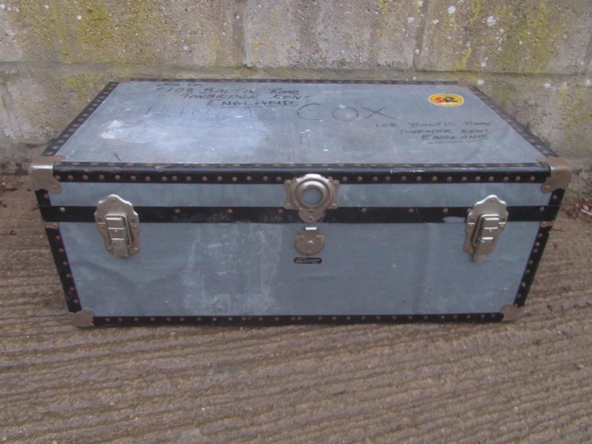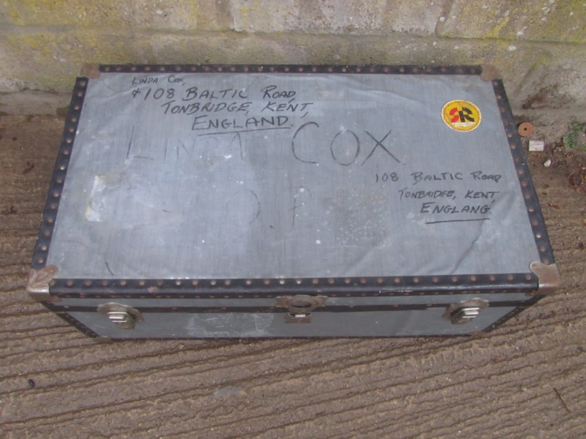 AN ANTIQUE METAL TRUNK WITH METAL HANDLES EACH SIDE. THIS WAS PROBABLY A CHEST FOR SOMEONE IN THE NAVY / ARMY etc. IT WOULD BE A GREAT CHEST FOR STORAGE OF TOYS, SHOES etc.