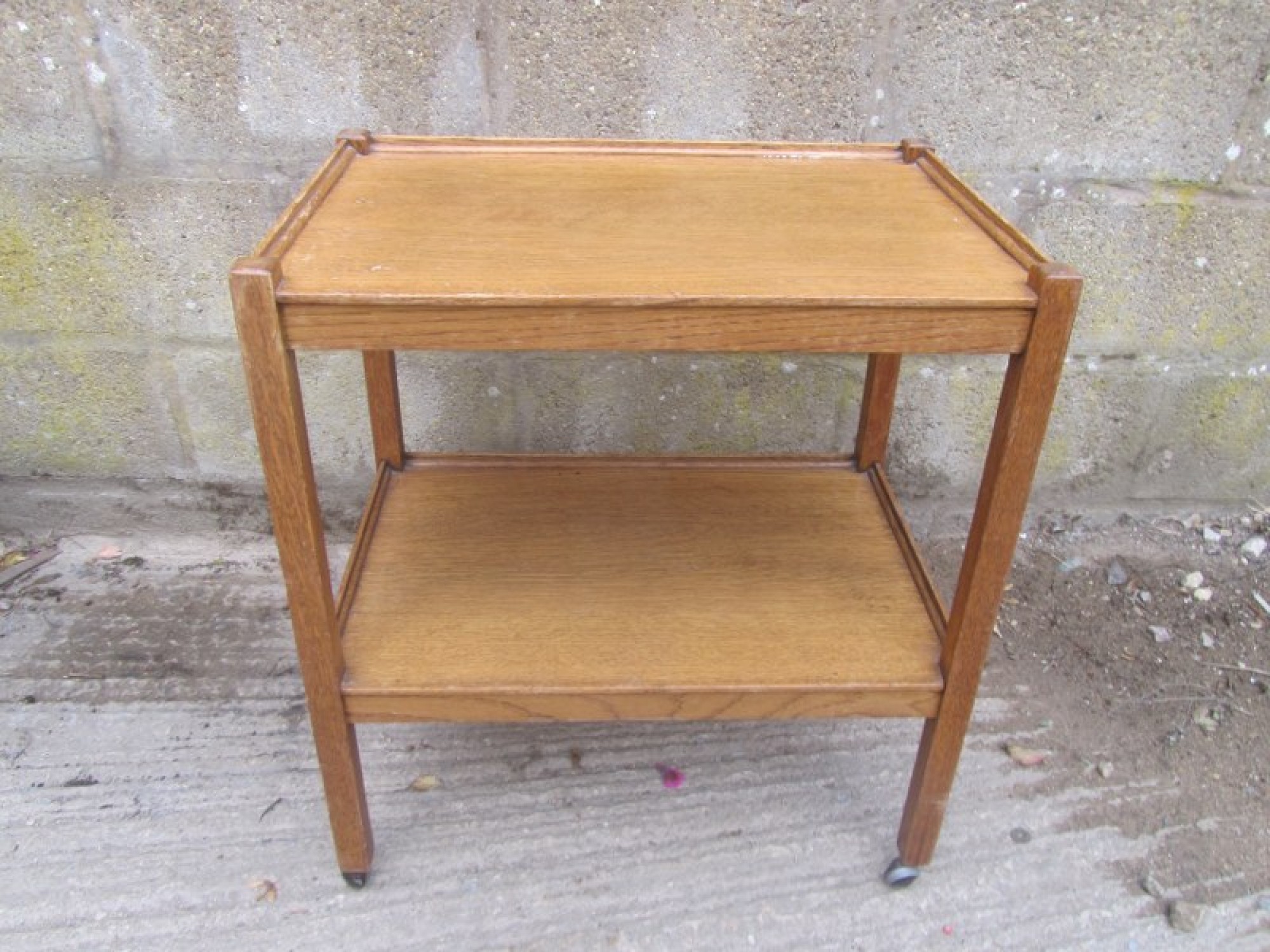 THIS IS A VINTAGE TROLLEY FROM THE 1940s. IT IS OAK, SOLID & VENEER. THERE ARE CASTORS ON THE END OF THE LEGS. IT IS IN GOOD CONDITION, SOME MINOR WEAR AND TEAR.