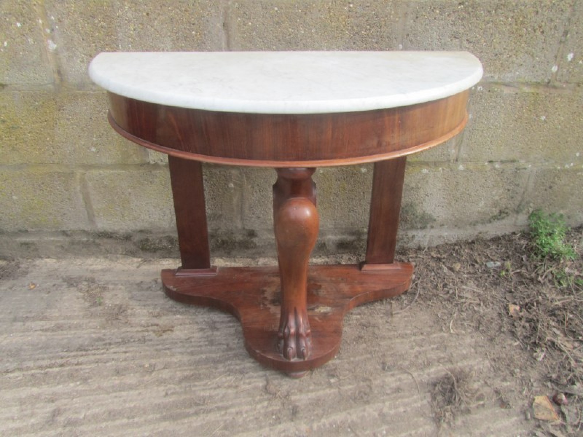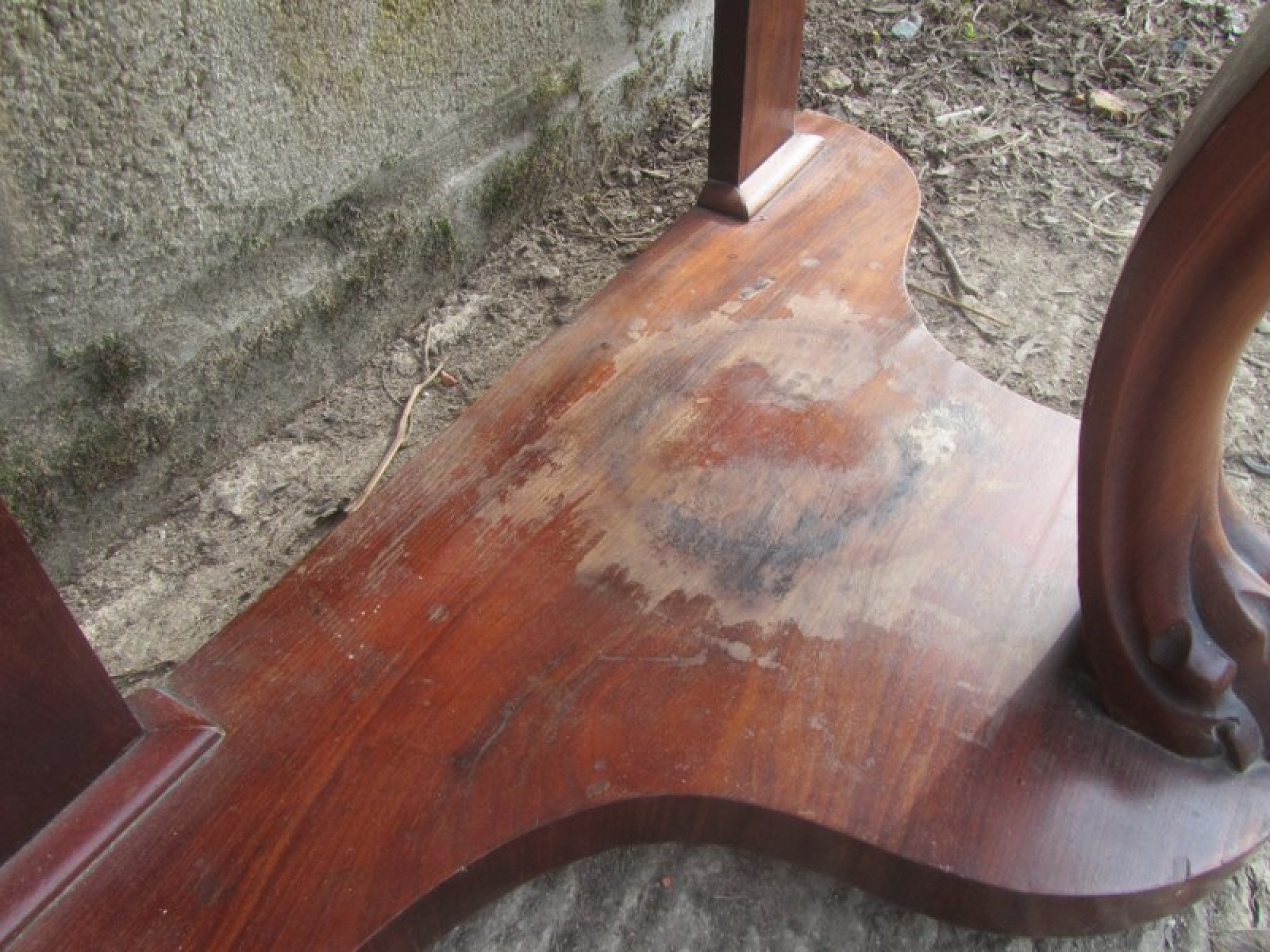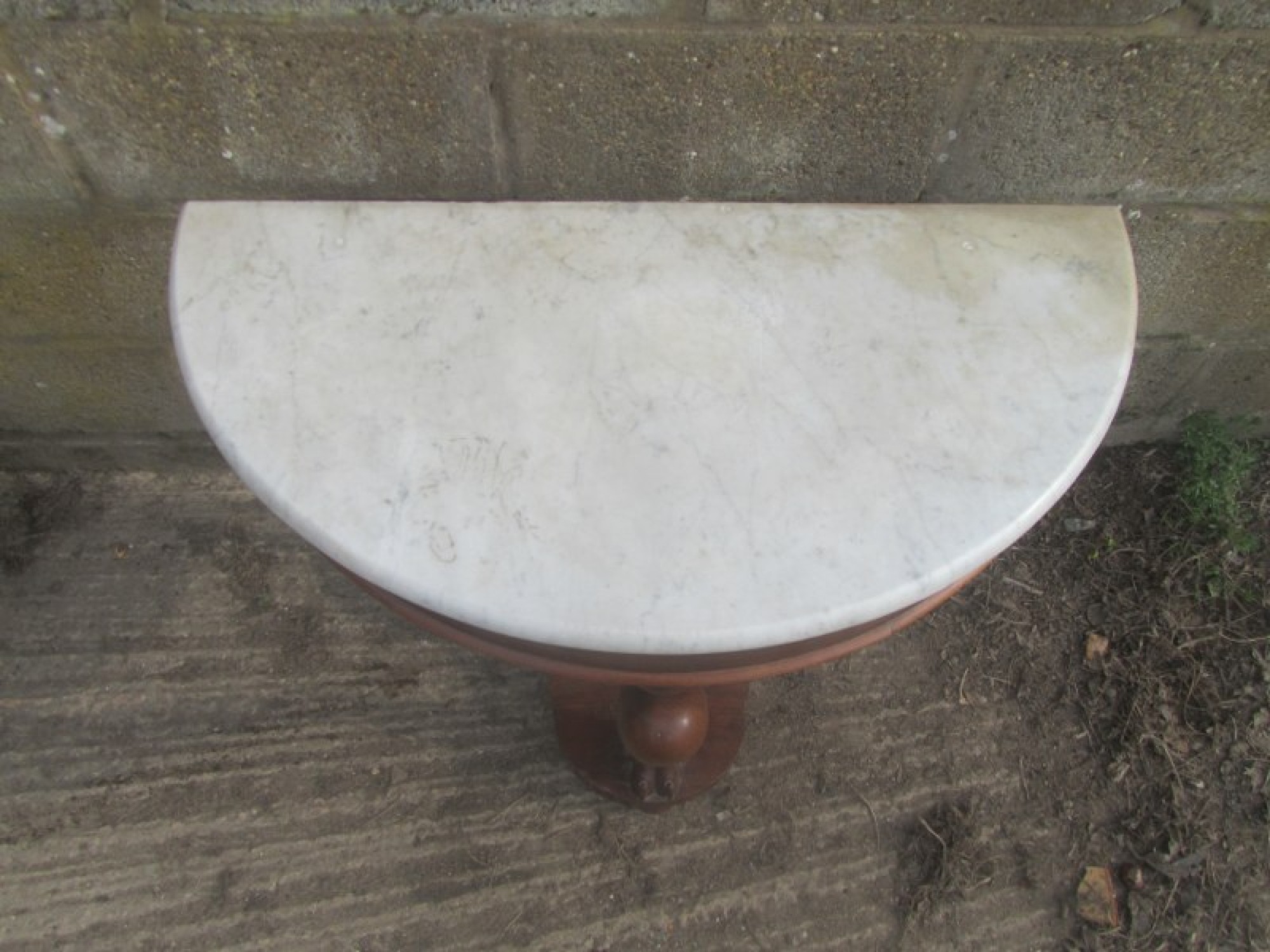 A MAHOGANY TABLE OR WASH STAND. WITH A MARBLE TOP. STAINED AT THE BASE.