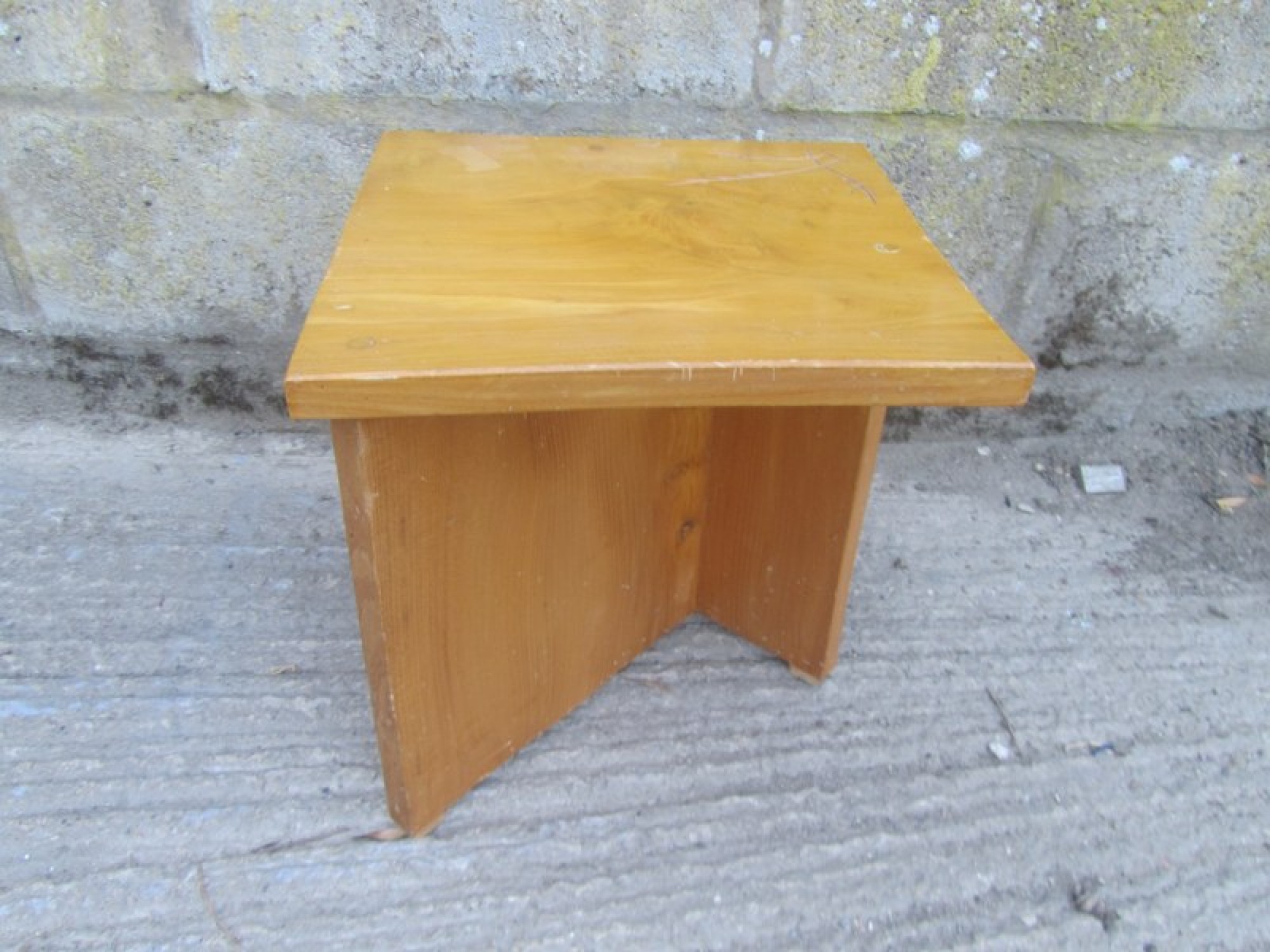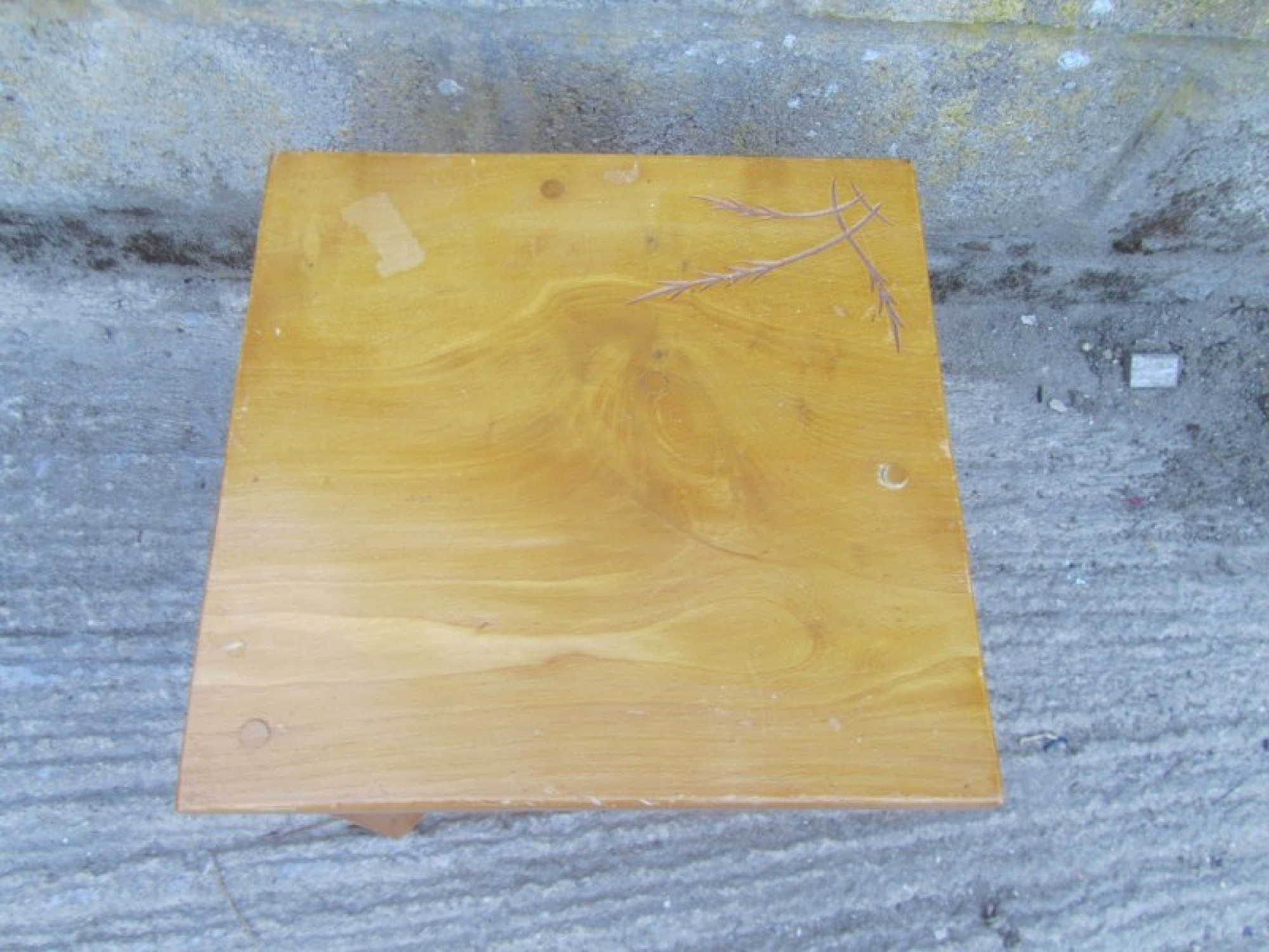 A SMALL TABLE, SOLID OAK. STURDY. CARVED MOTIVE ON THE TABLE TOP.