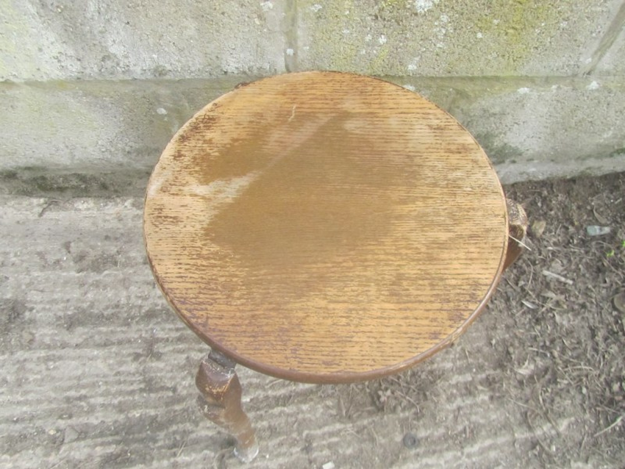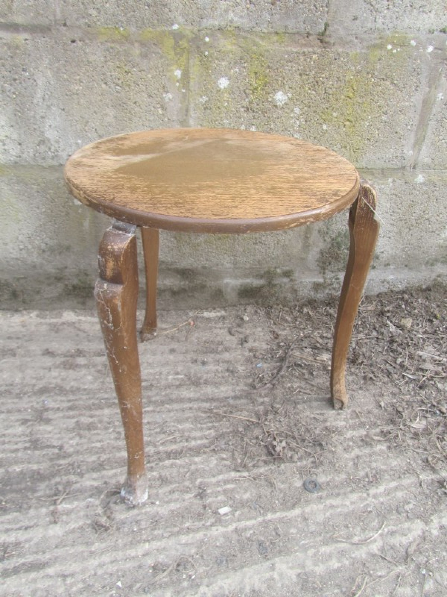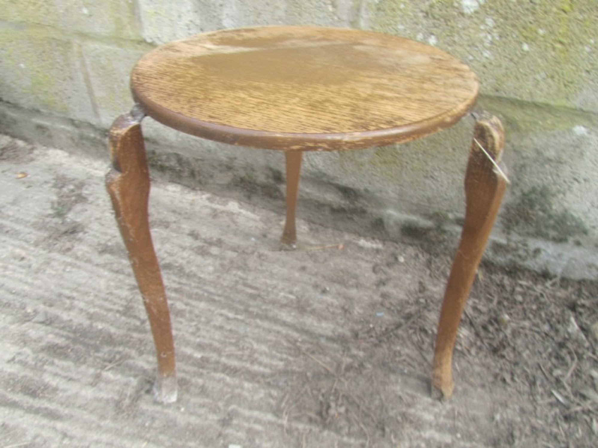 A SMALL TABLE, OAK VENEERED. WEAR AND MARKS. TOP IS FADED AND WORN, IDEAL PROJECT.