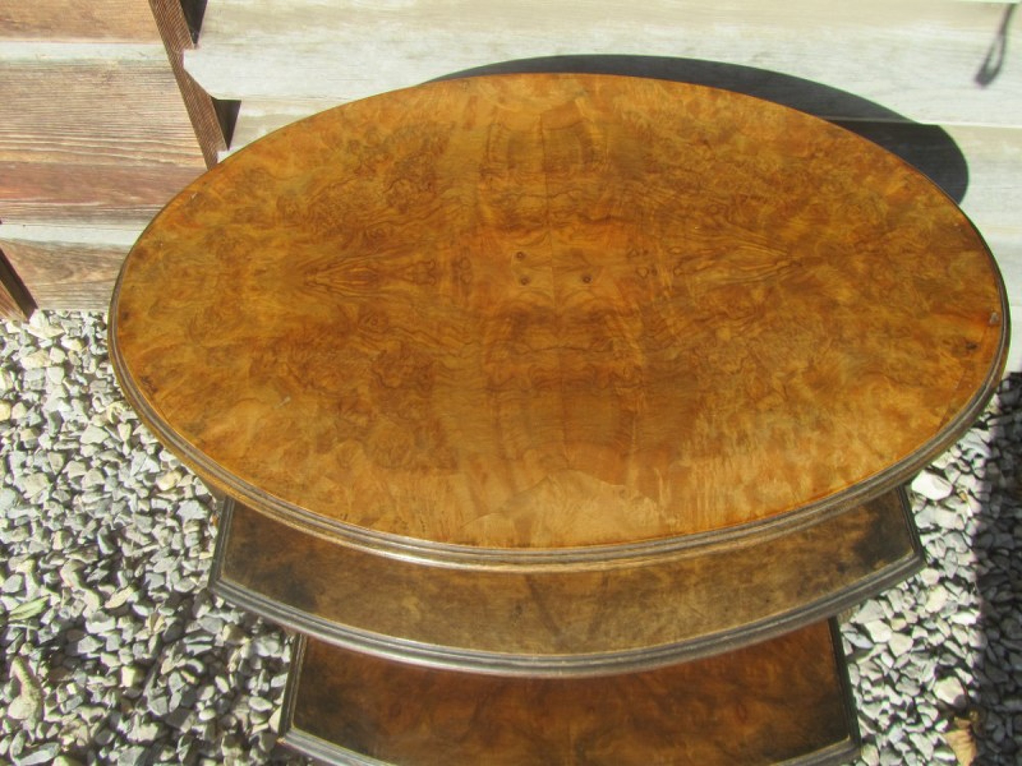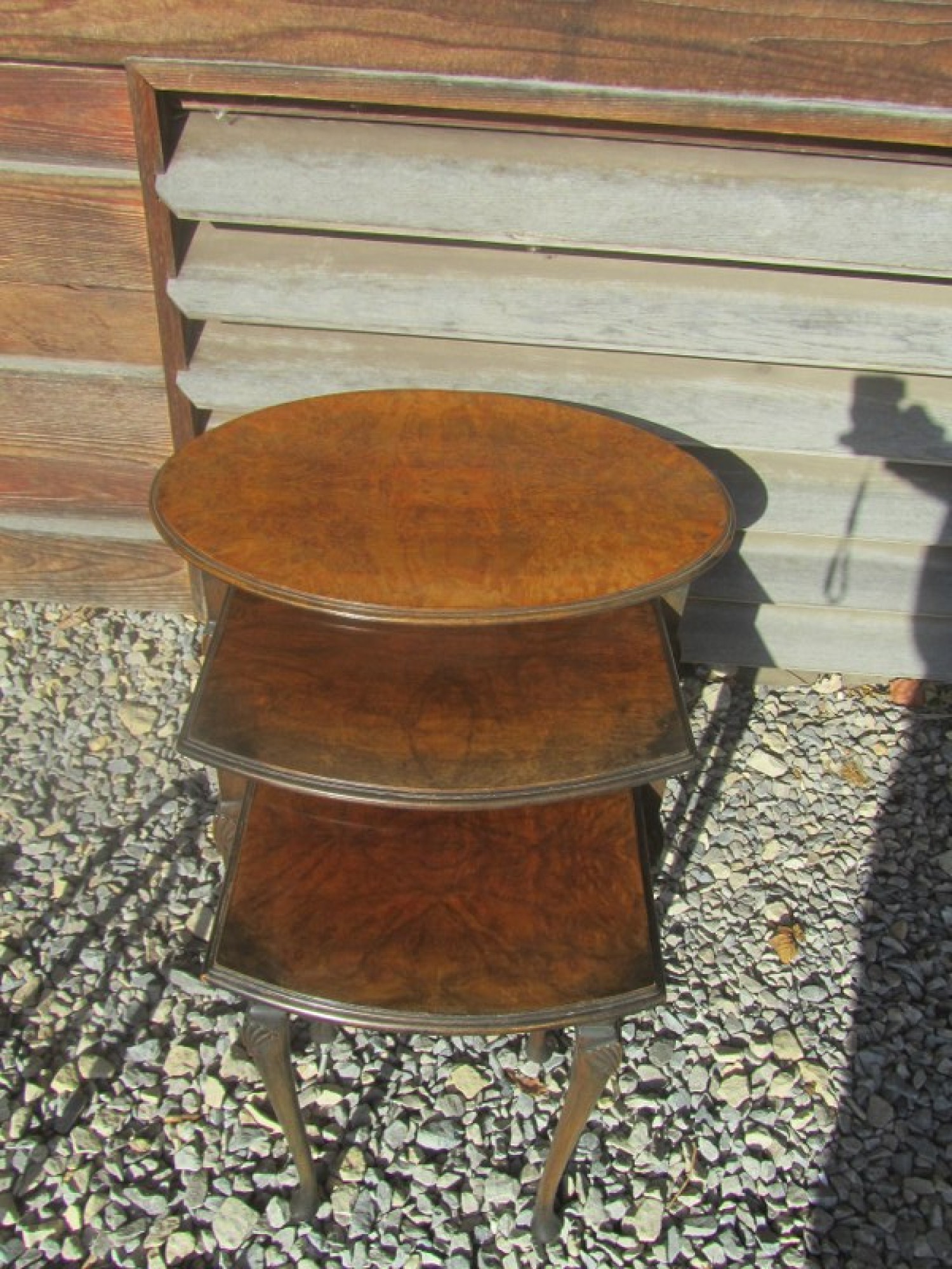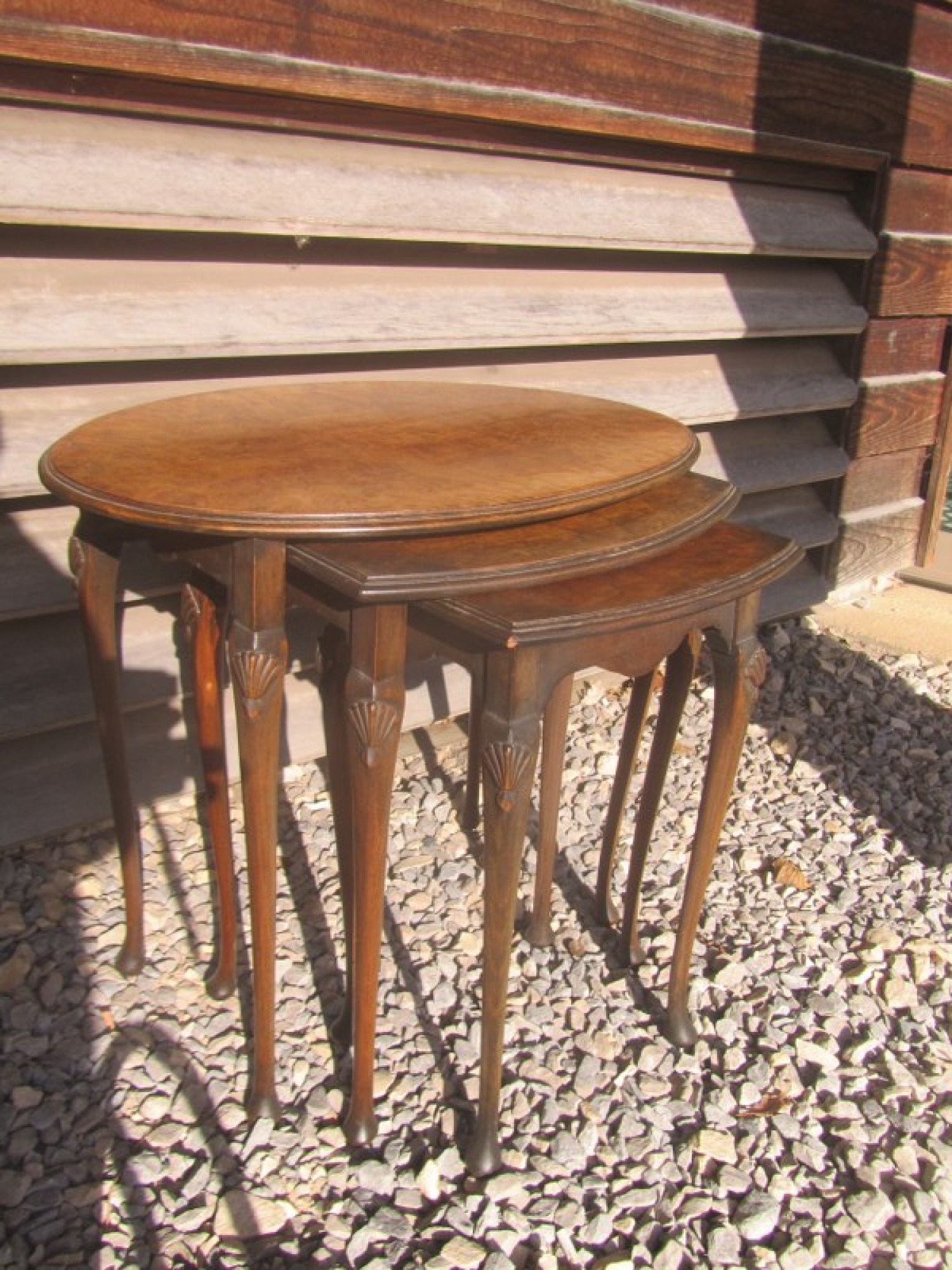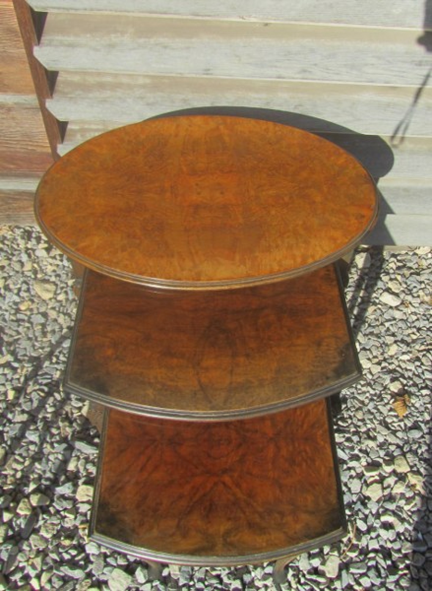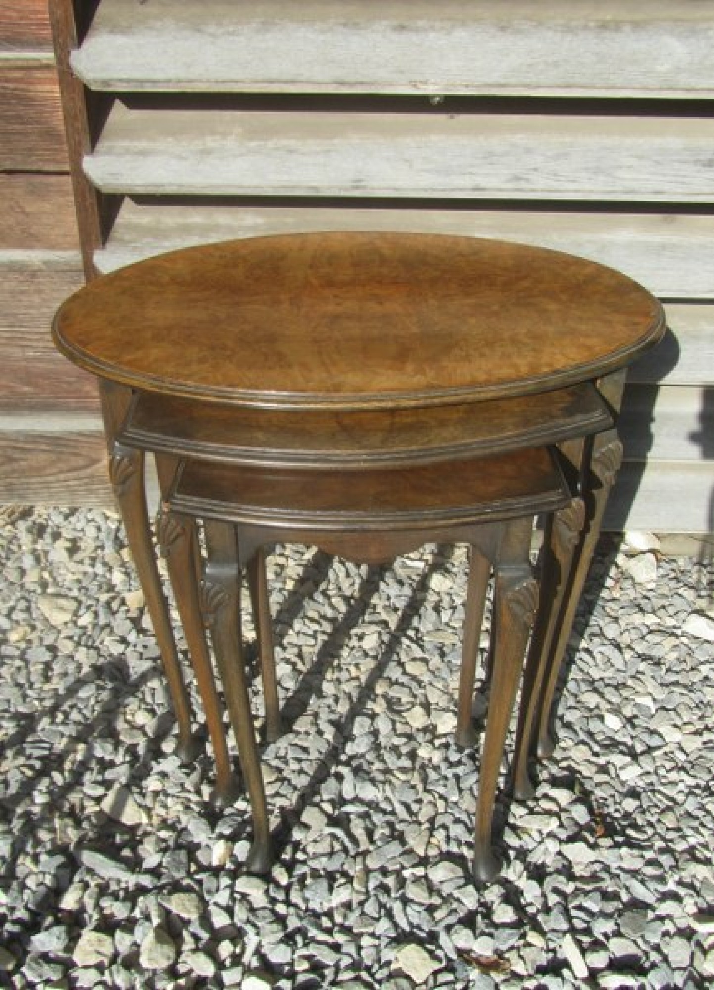 THIS IS A NEST OF 3 TALL WALNUT VENEERED TABLES. THEY ARE A GREAT SET FROM THE 1930s/40s. IDEAL AS COFFEE TABLES, OR OCCASIONAL TABLES. THEY ARE IN AVERAGE CONDITION. THE 2 SMALL TABLES NEATLY SIT INSIDE THE LARGE TABLE, SO DONT TAKE UP MUCH SPACE WHEN NOT IN USE.