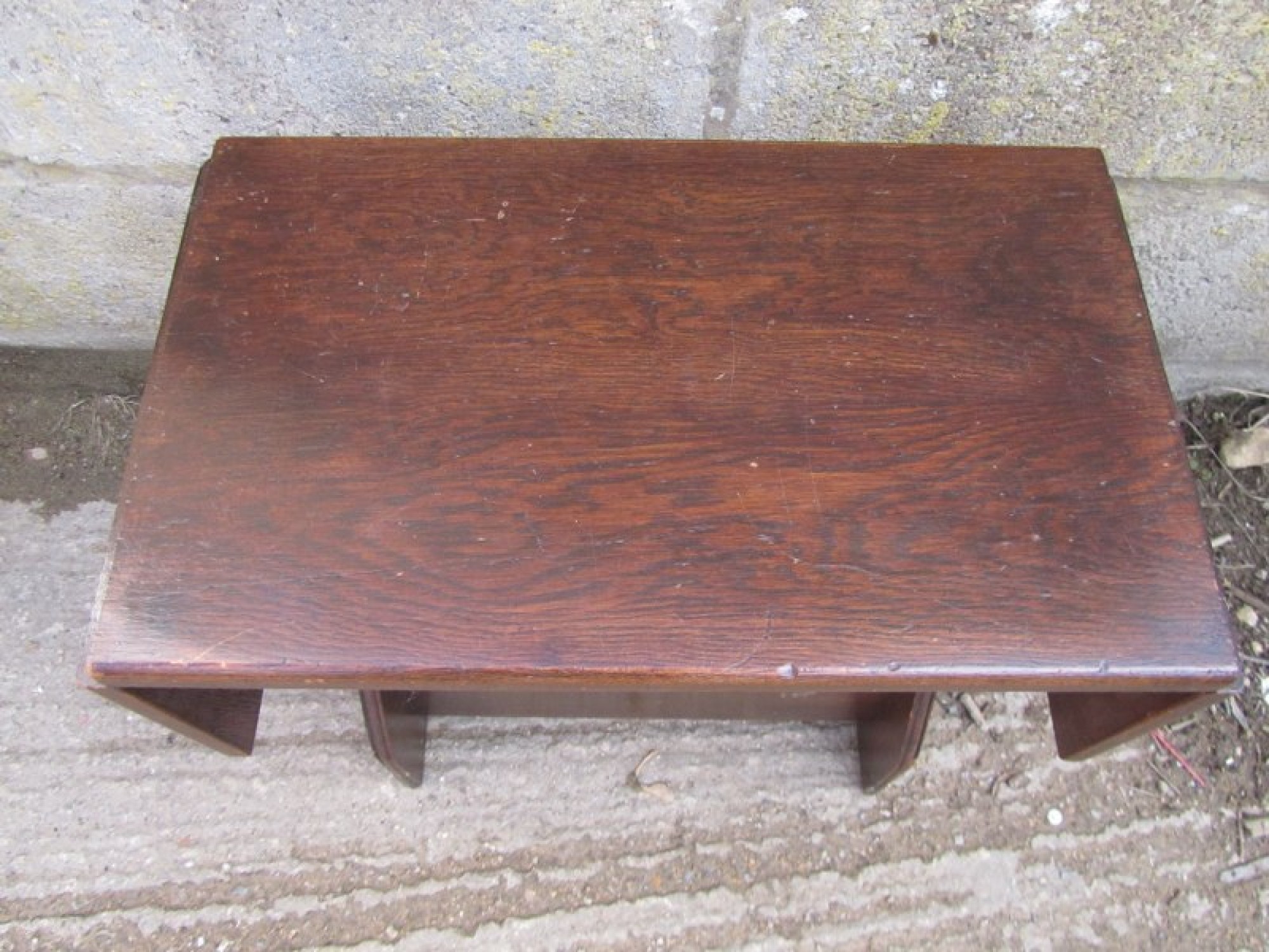 AN ANTIQUE MAHOGANY MAGAZINE RACK WITH TABLE ABOVE, SOME WEAR.
