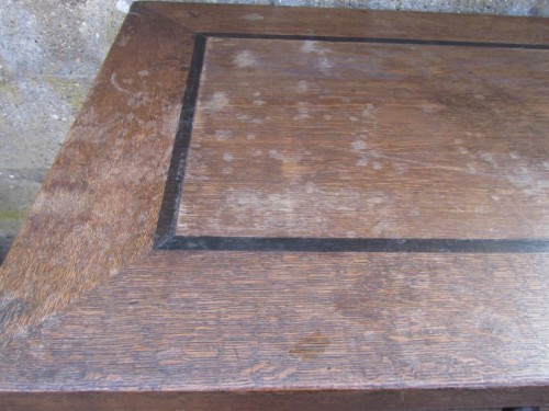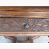 THIS IS A SOLID OAK SIDE TABLE. THE TABLE TOP HAS A DECORATIVE CARVED PATTERN. DRAW LEAF TABLE TOP. SOME OLD WOOD WORM HOLES. STRONG AND STURDY.