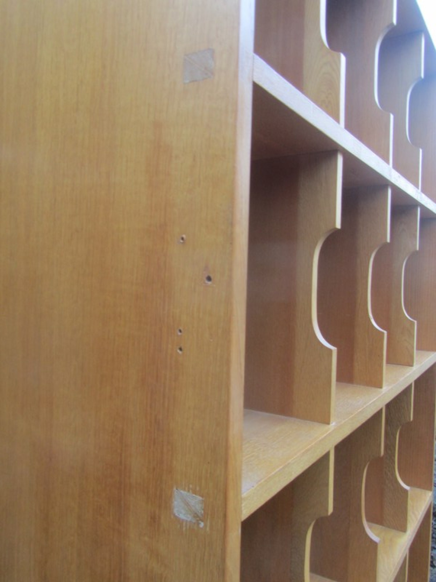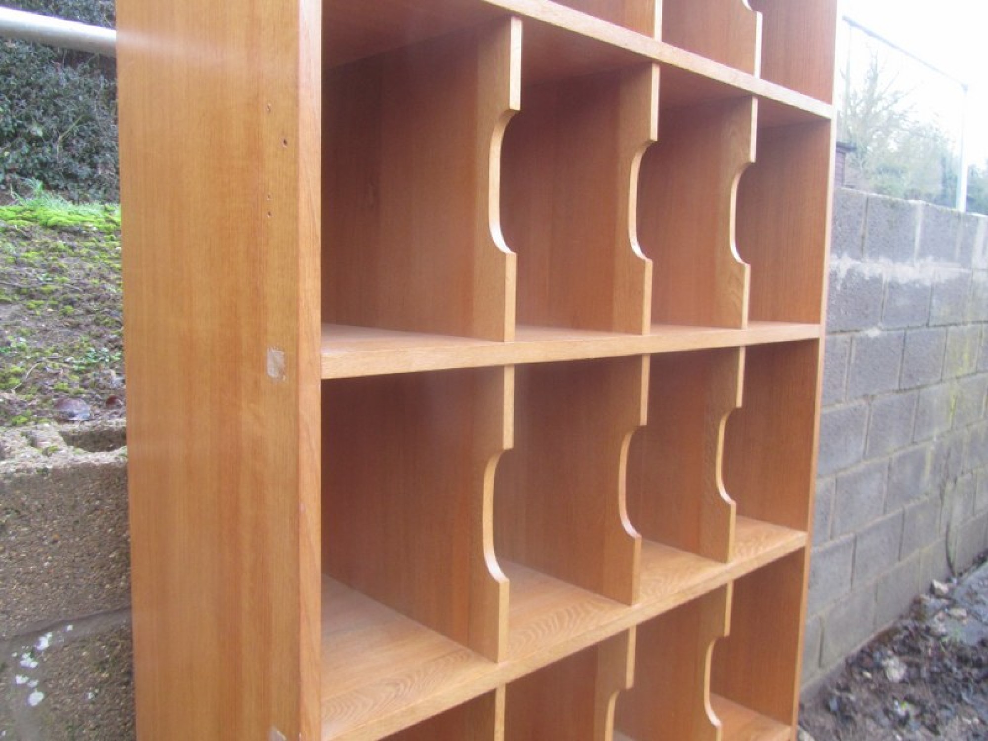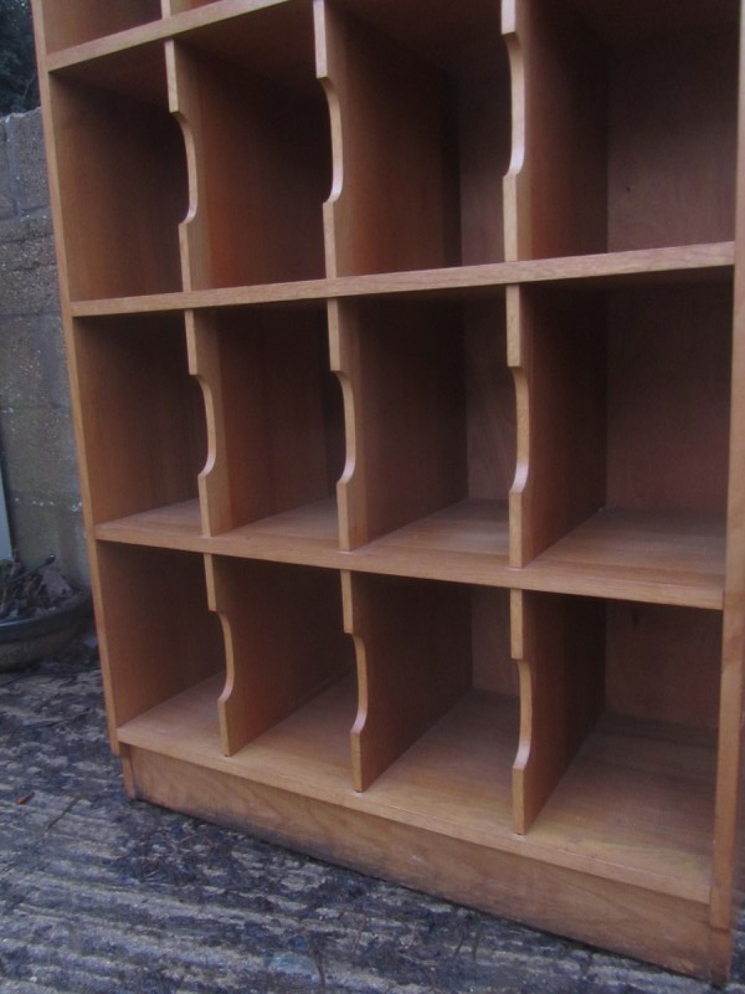 SHELVES MADE FROM SOLID OAK. A LARGE ANTIQUE SHELVING CABINET. FROM AN OFFICE, (POSSIBLY FROM THE LAND REGISTRY OFFICE). STRONG AND STURDY. SOME SCREW HOLES IN THE SIDES. GENERAL WEAR.