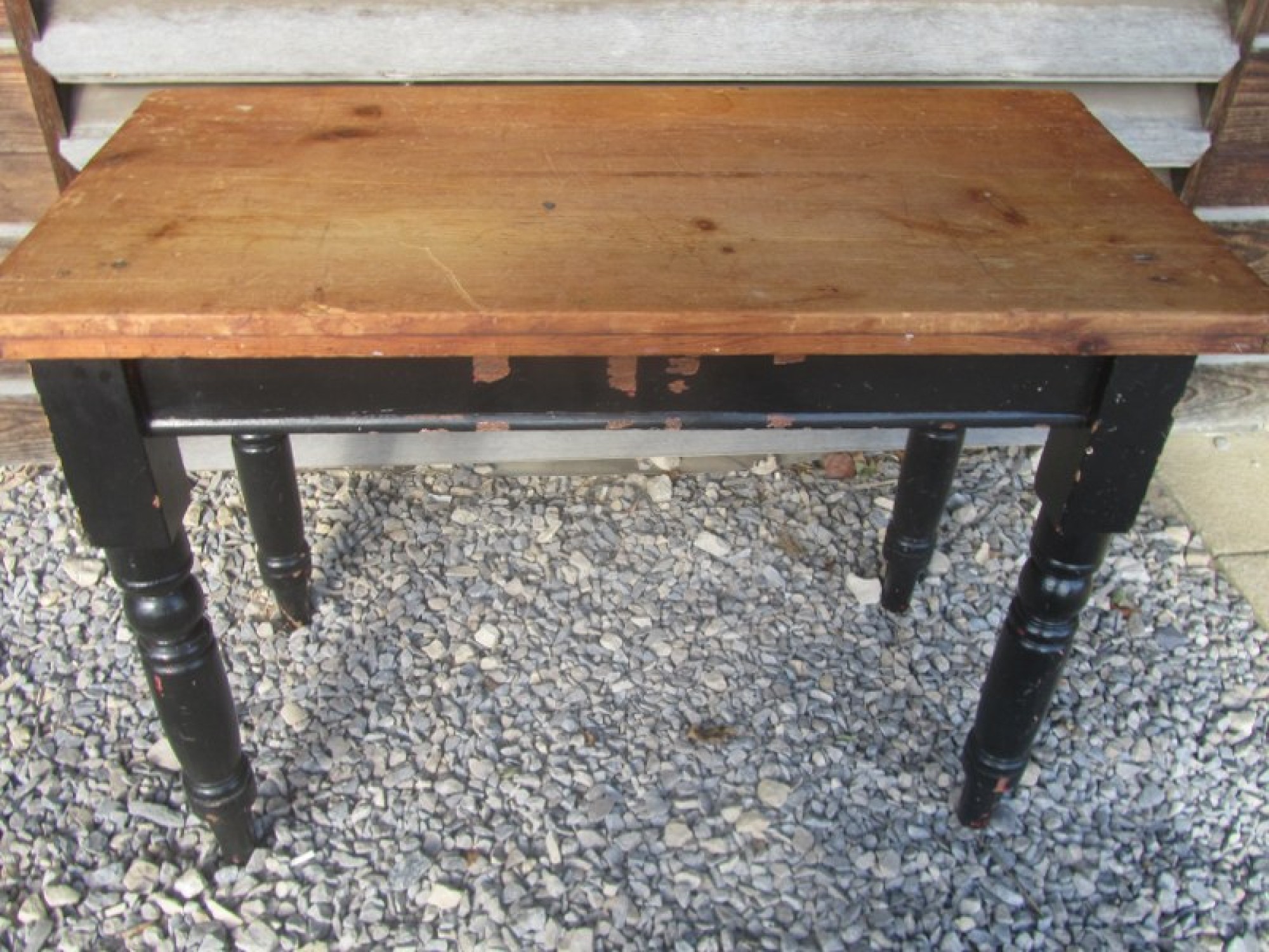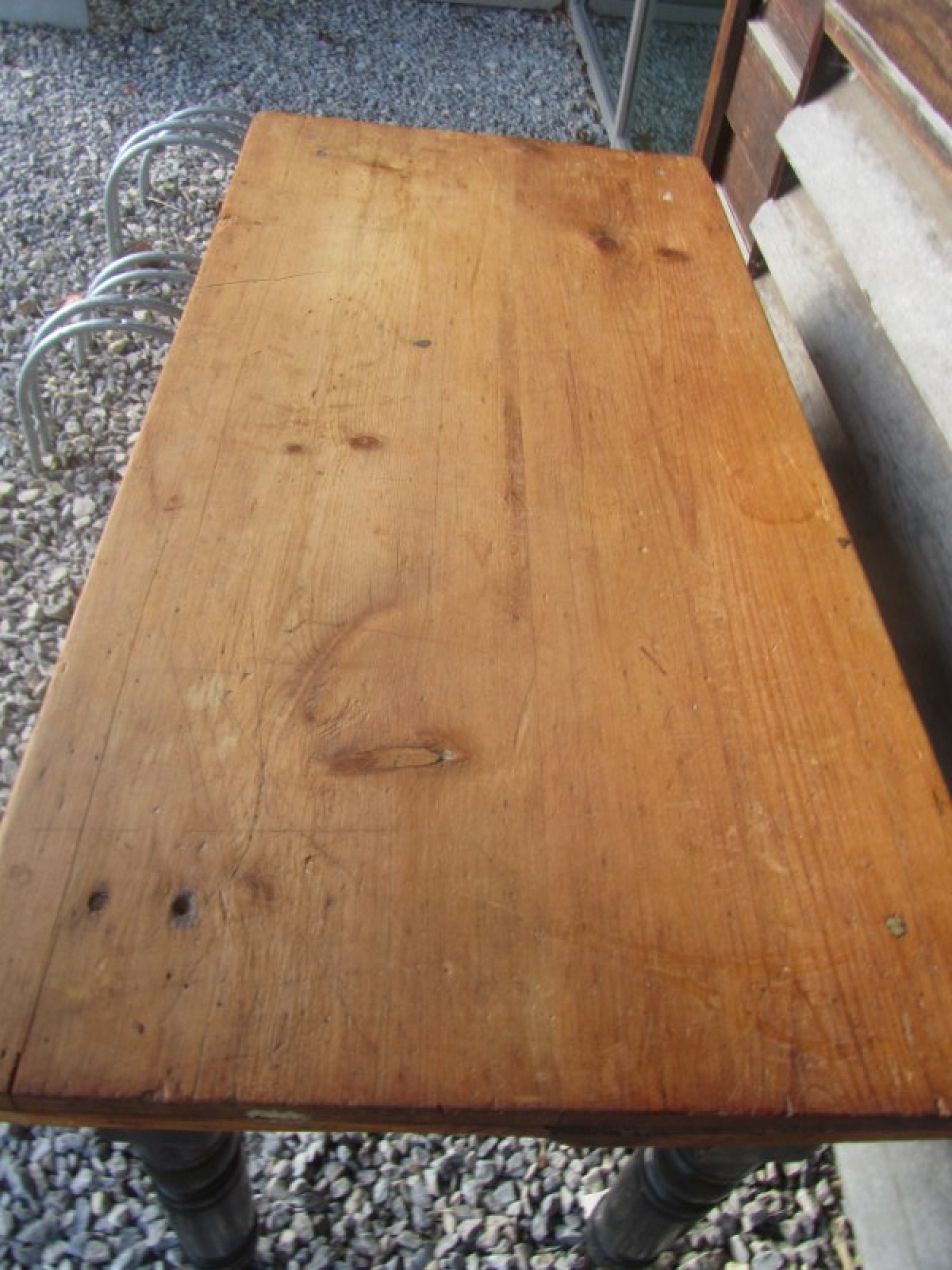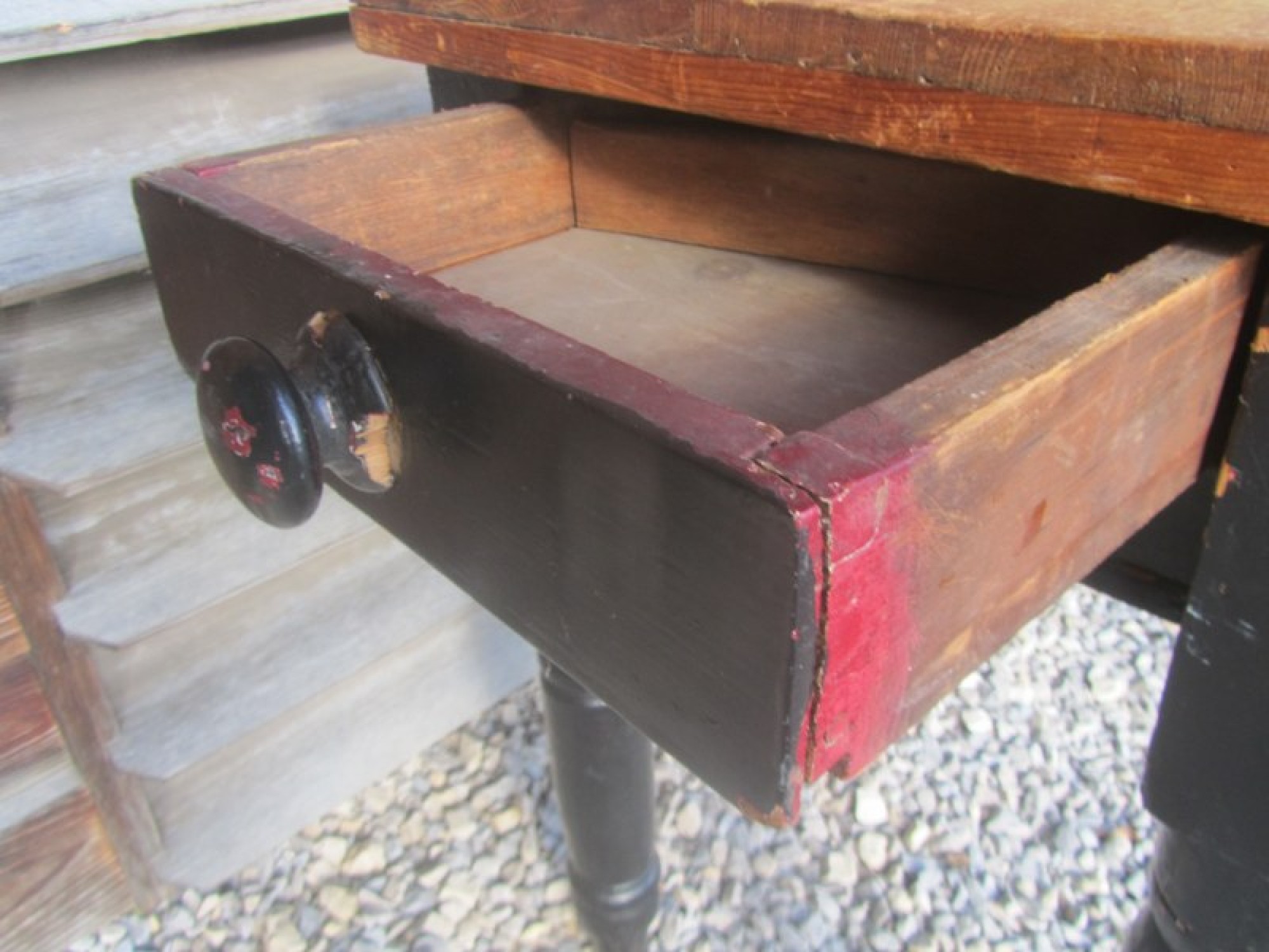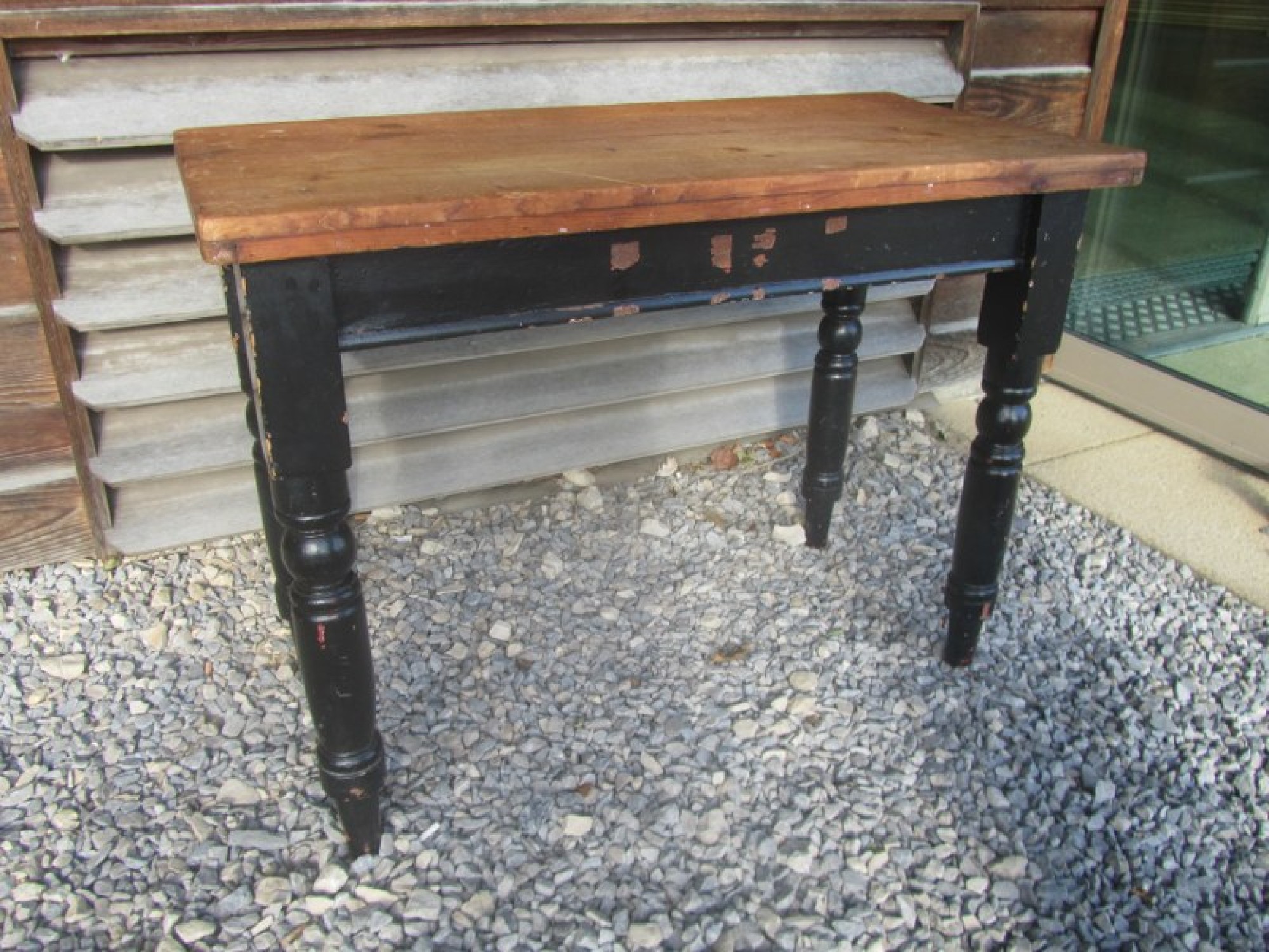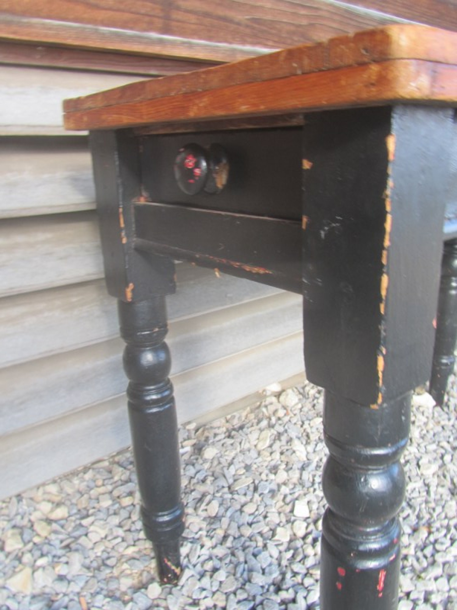 A SMALL ANTIQUE VICTORIAN SOLID PINE DINING TABLE. THE BASE IS PAINTED BLACK AND DISTRESSED. THE TABLE TOP IS SOLID PINE, THERE ARE MARKS, SCRATCHES AND WEAR TO THE TABLE TOP. WITH A DRAWER ON ONE END. THE LEGS ARE FITTED, THEY DO NOT REMOVE. THIS IS A VICTORIAN KITCHEN TABLE AND HAS BEEN USED FOR WELL OVER 100 YEARS, IT IS NATURALLY WORN, A GREAT SHABBY CHIC LOOK.