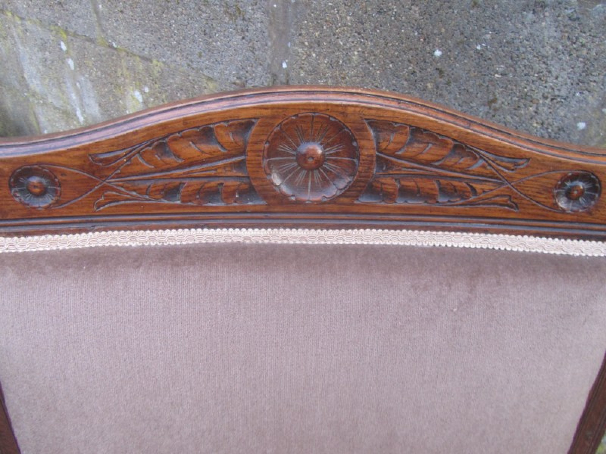 THIS IS A CHAIR FOR THE LIVING ROOM, BEDROOM OR ANYWHERE IN THE HOME. THE FRAME IS IN SOLID OAK, WITH CARVED DETAIL. ON SMALL CASTORS, NOT ORIGINAL. THE BACK REST AND SEAT ARE PADDED AND COVERED IN MATERIAL, SOME LIGHT MARKS.