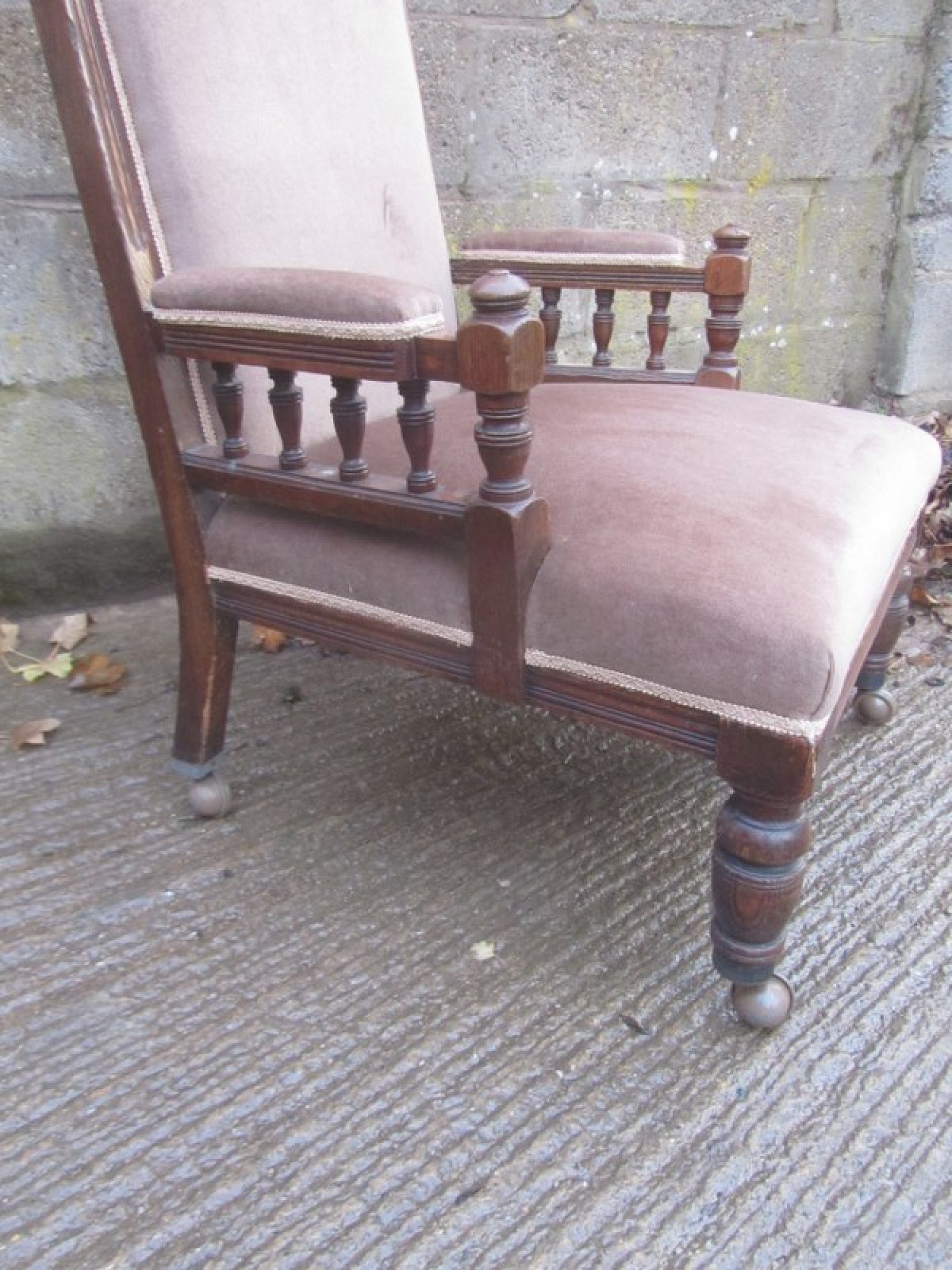 THERE IS DAMAGE TO ONE ARMREST. ONE LEG AND ONE ARM REST HAVE SUFFERED WITH WOOD WORM IN THE PAST, IT IS PROBABLY LONG DEAD! IT HAS BEEN TREATED BUT I WOULD RECOMMEND TREATING IT AGAIN TO BE SURE. IN NEED OF REPAIR.