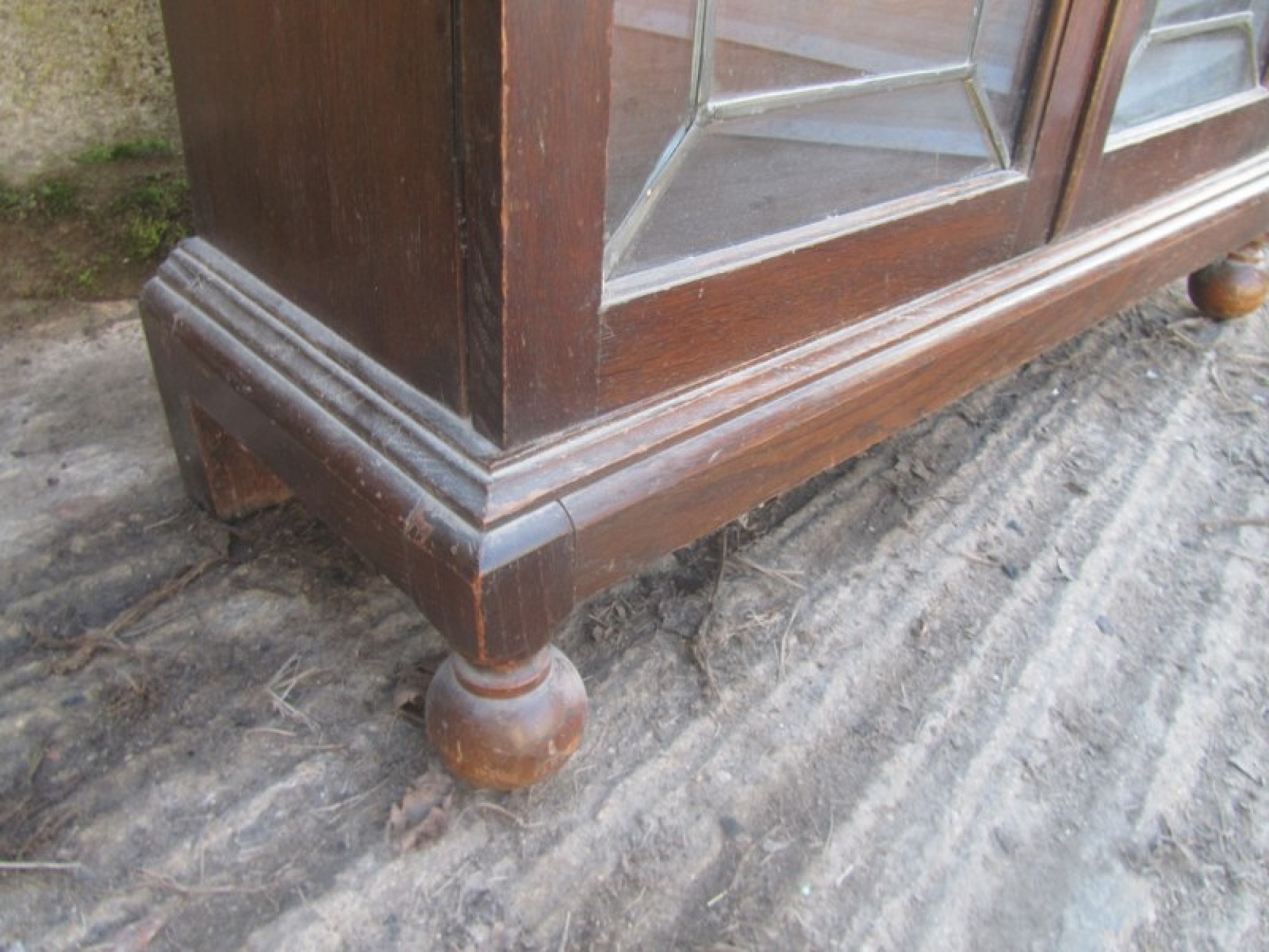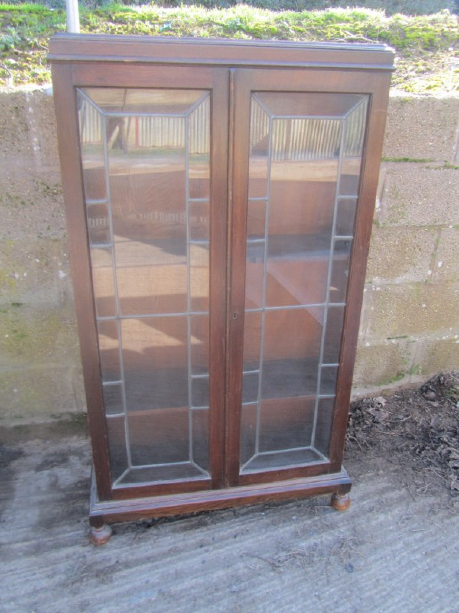 THIS IS AN OAK DISPLAY CABINET FROM THE 1930s. A SIMPLE PIECE WITH LEADED GLAZED DOORS AT THE FRONT WITH GLASS PANELS. INSIDE THERE ARE WOODEN SHELVES.