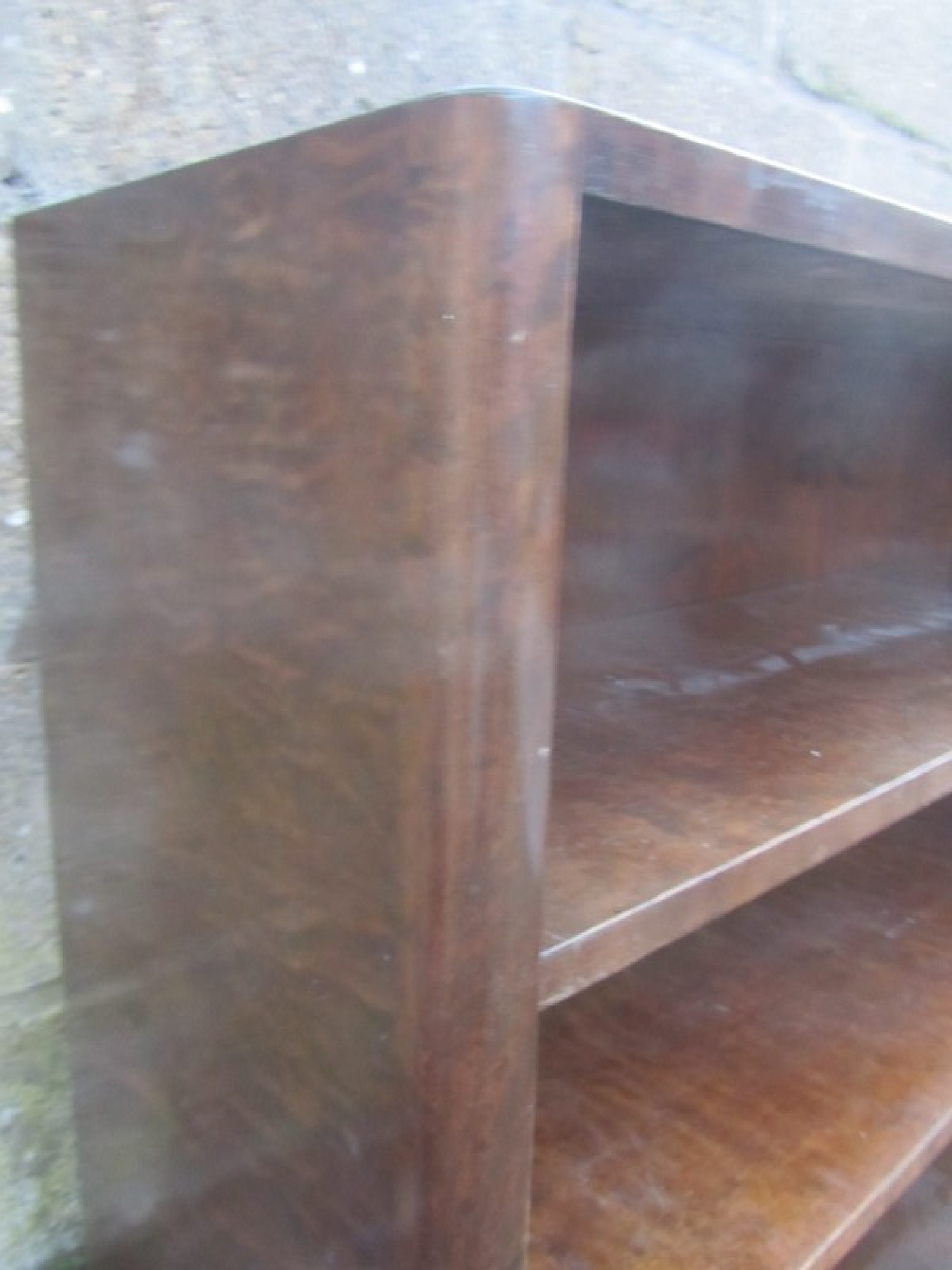 THIS IS A BURR WALNUT VENEERED CABINET. INSIDE THERE ARE WOODEN SHELVES. A SIMPLE PIECE, IDEAL FOR DISPLAYING CHINA, TROPHIES, COLLECTIONS etc. THE VENEER IS FADED AND WORN.