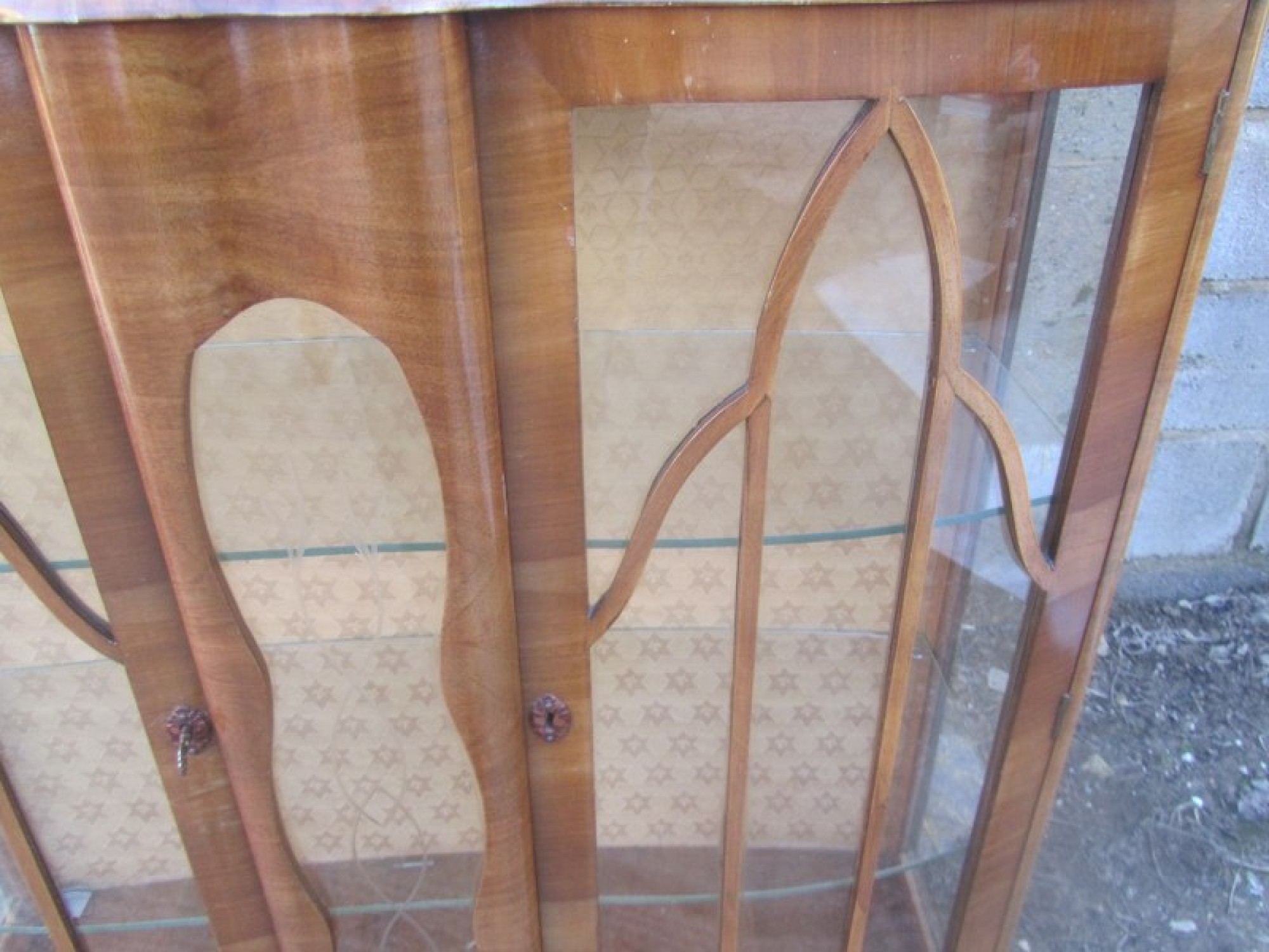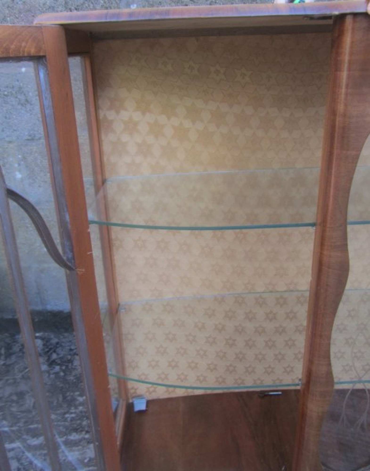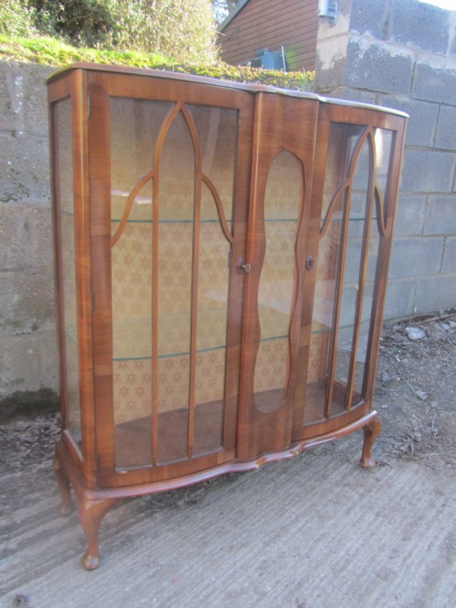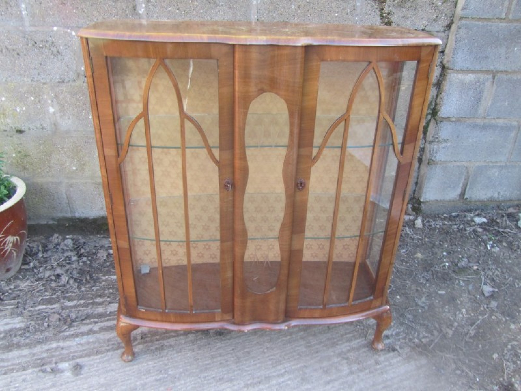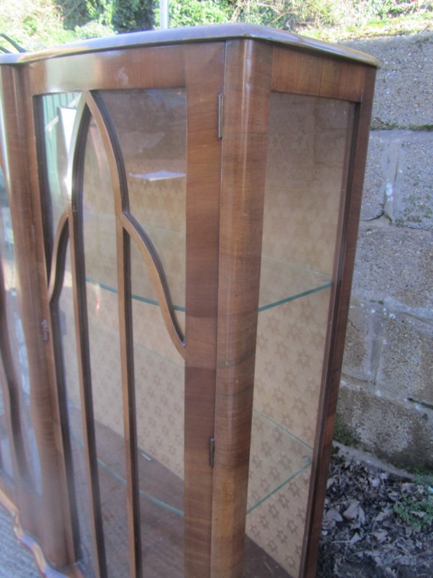 THIS IS A WALNUT VENEERED DISPLAY CABINET FROM THE 1930s / 40s. AN ELEGANT PIECE WITH GLAZED DOOR IN THE FRONT. IT STANDS ON CABRIOLET LEGS.