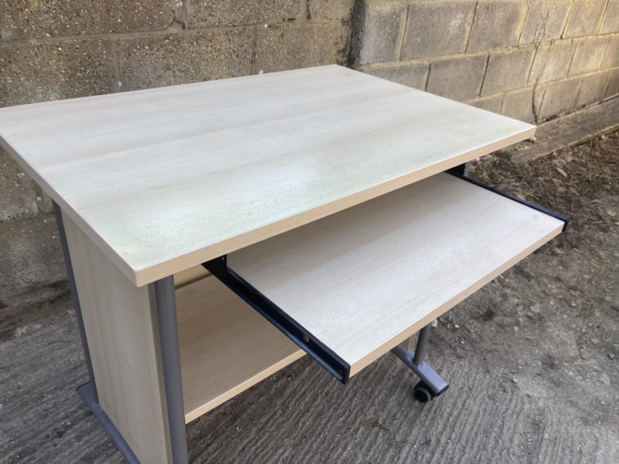 A BEECH EFFECT DESK ON A METAL FRAME. IT HAS A SLIDE OUT KEYBOARD SHELF AND STORAGE BELOW. THE TOP IS FADED.