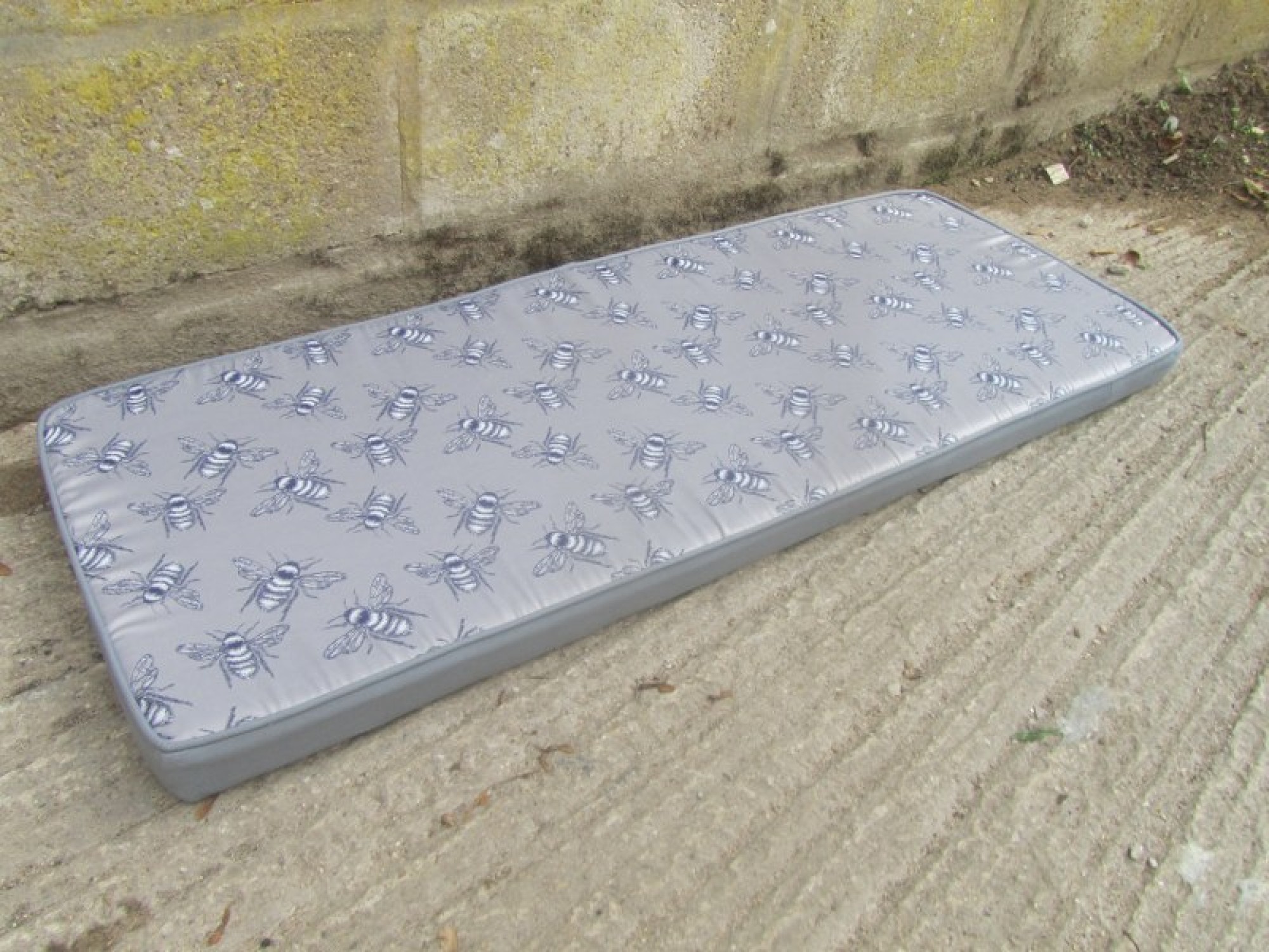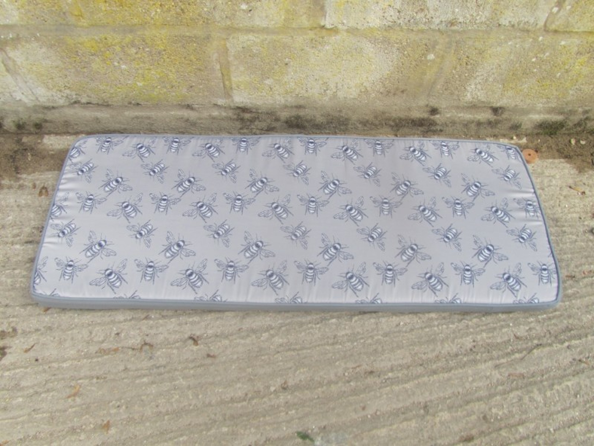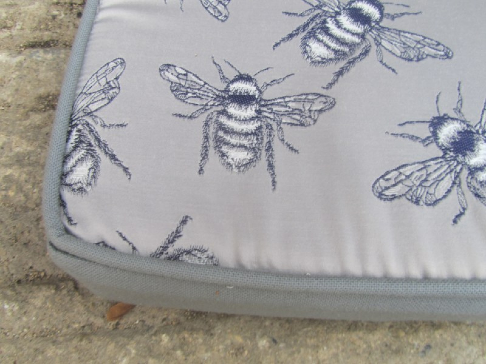 A LONG GARDEN BENCH / SOFA CUSHION. WITH BEE PATTERNED MATERIAL. IN GOOD CONDITION.
