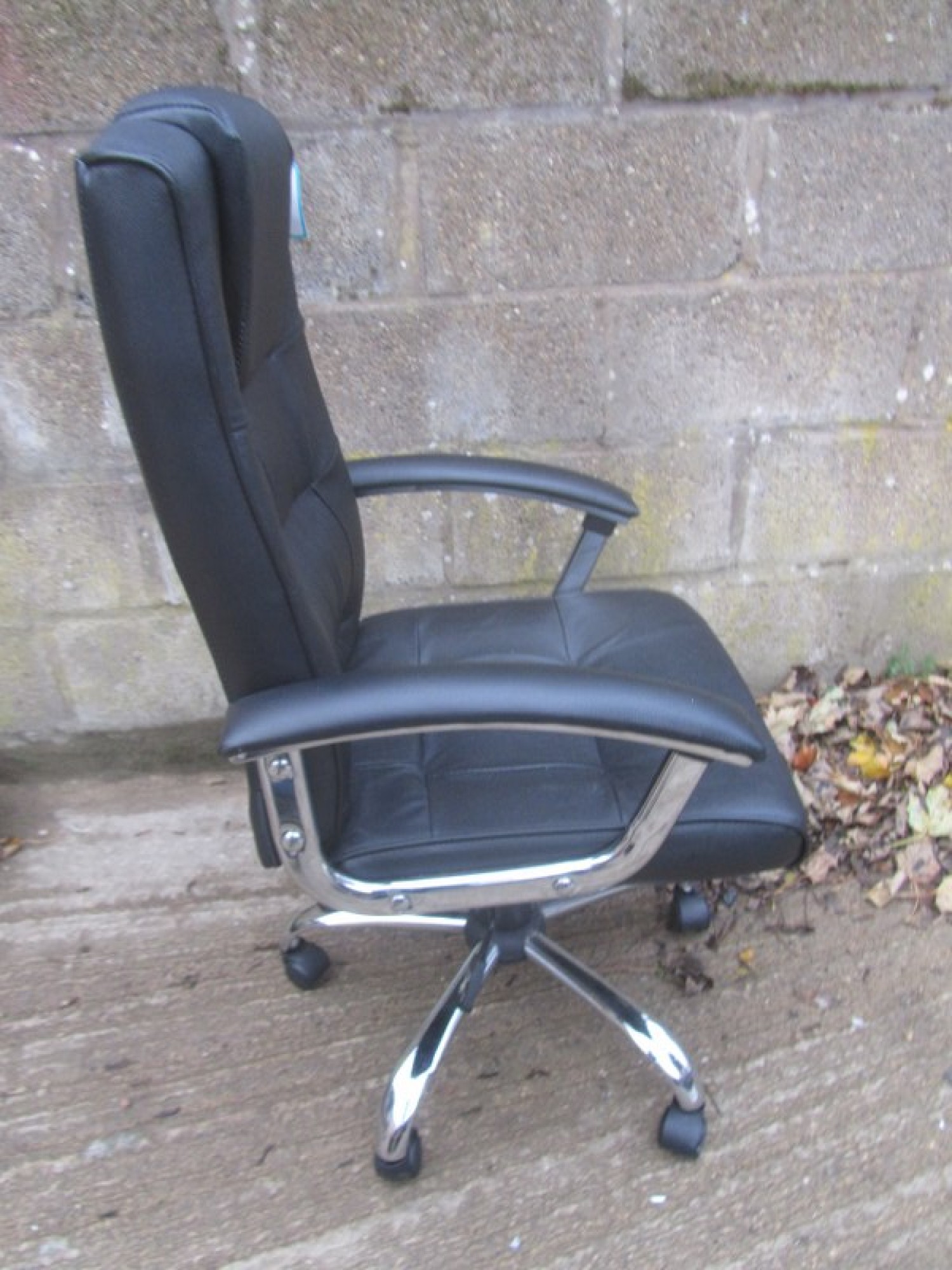A MODERN OFFICE SWIVEL CHAIR, IT STANDS ON 5 CASTORS. IT IS UPHOLSTERED IN BLACK LEATHER EFFECT MATERIAL. THERE IS GAS LIFT HEIGHT ADJUSTMENT. SEAT HEIGHT IS 47 - 56cm. WELL PADDED AND COMFORTABLE. GOOD QUALITY.