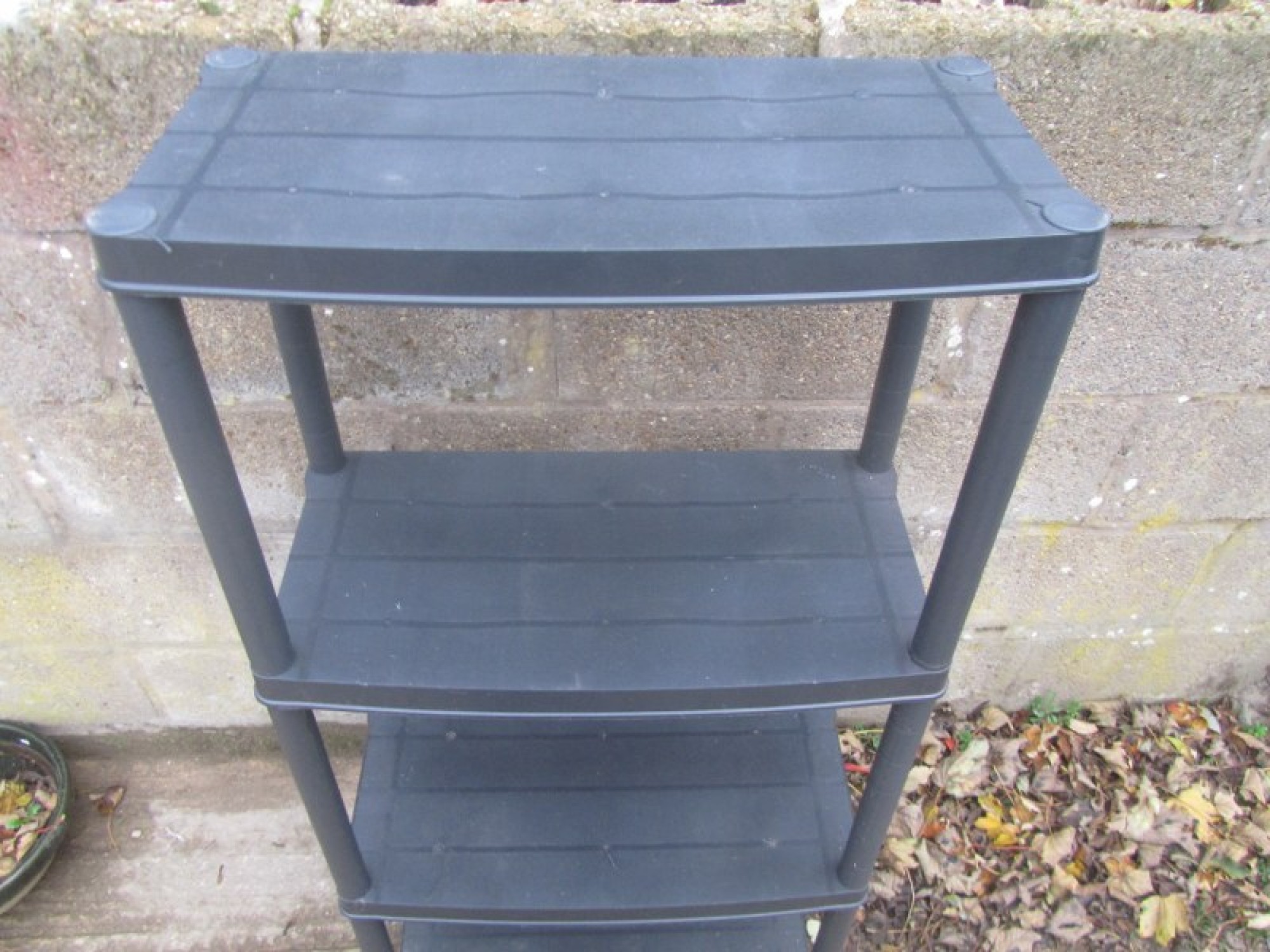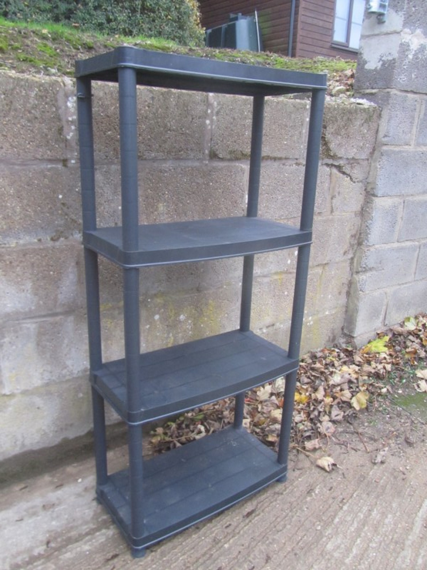 A LIGHTWEIGHT SET OF SHELVES IN PLASTIC, SOME WEAR AND MARKS. IDEAL STORAGE.