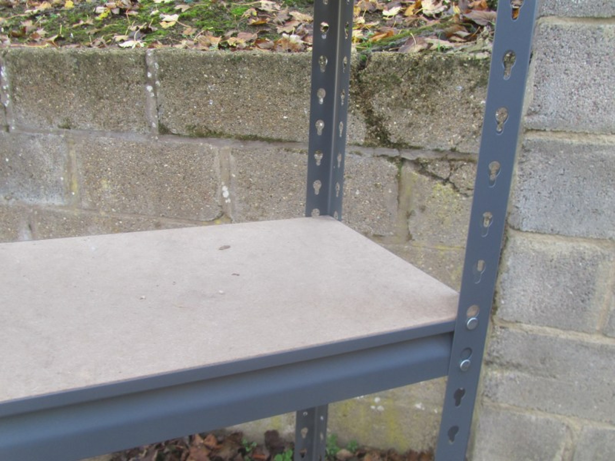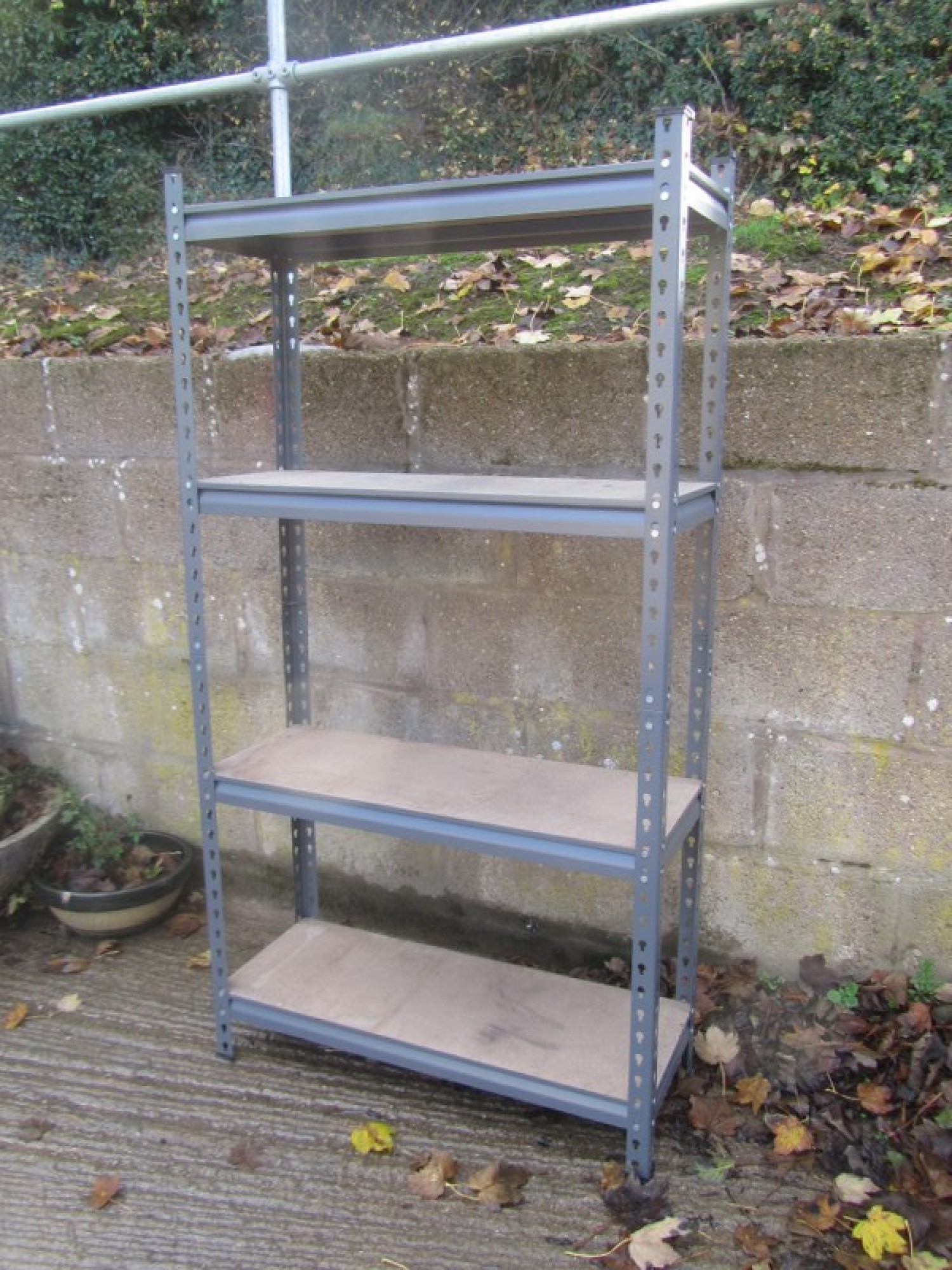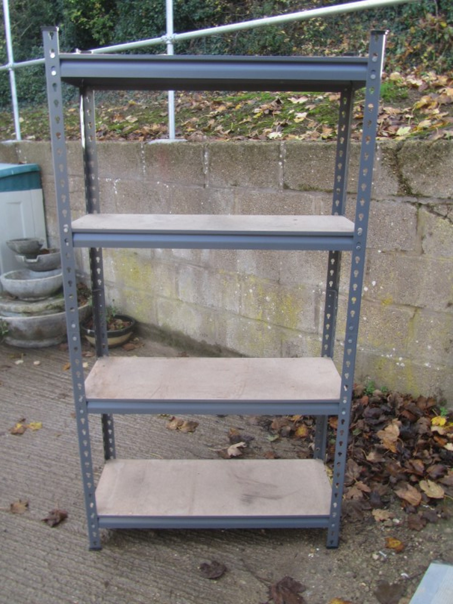 A STURDY SET OF SHELVES, IDEAL STORAGE FOR THE GARAGE OR SHED. METAL FRAME, MDF SHELVES. IT IS RECOMMENDED THAT TALL FURNITURE SHOULD BE SAFELY SECURED TO THE WALL WITH SCREWS / BRACKETS FOR SAFETY.