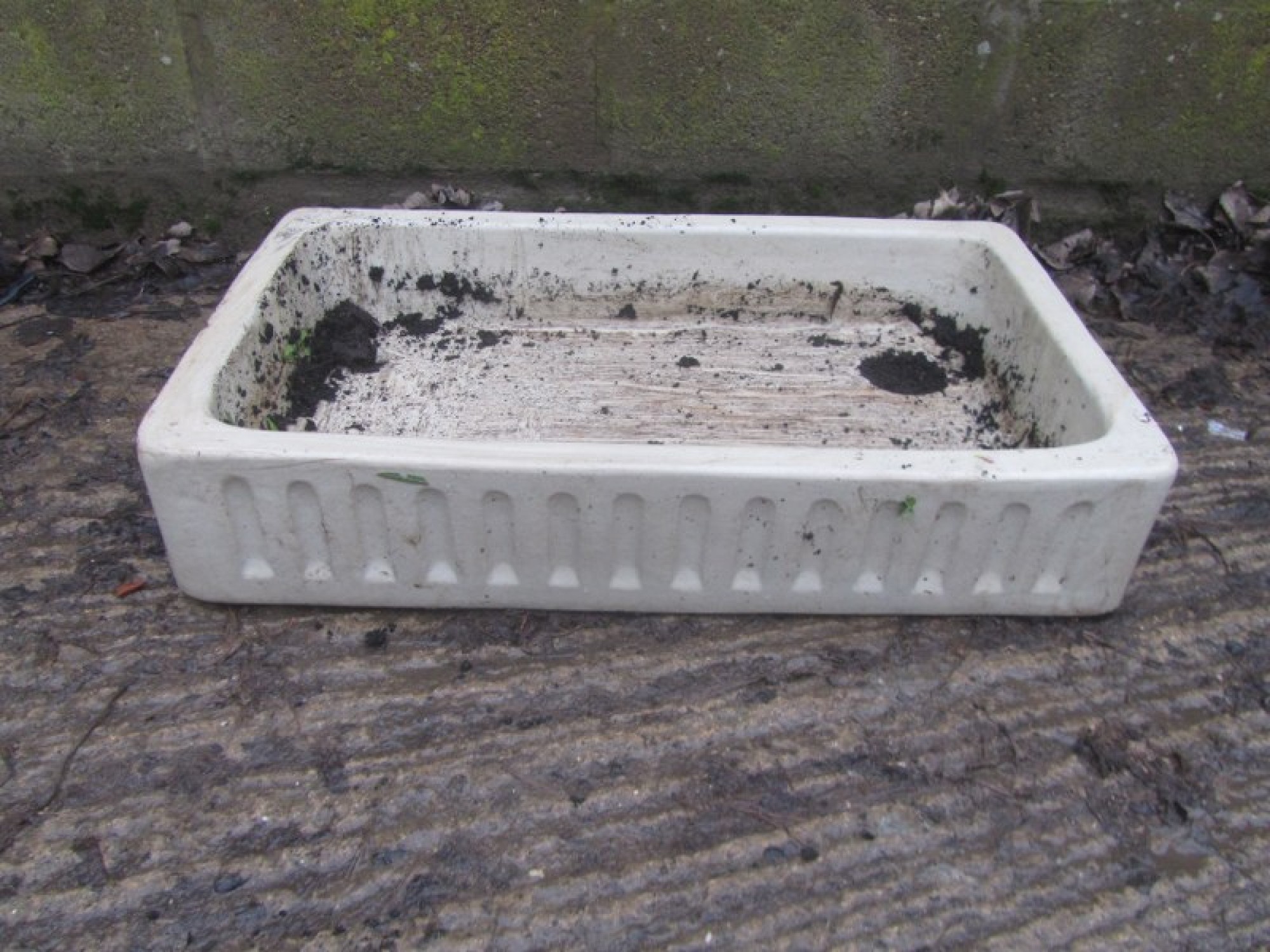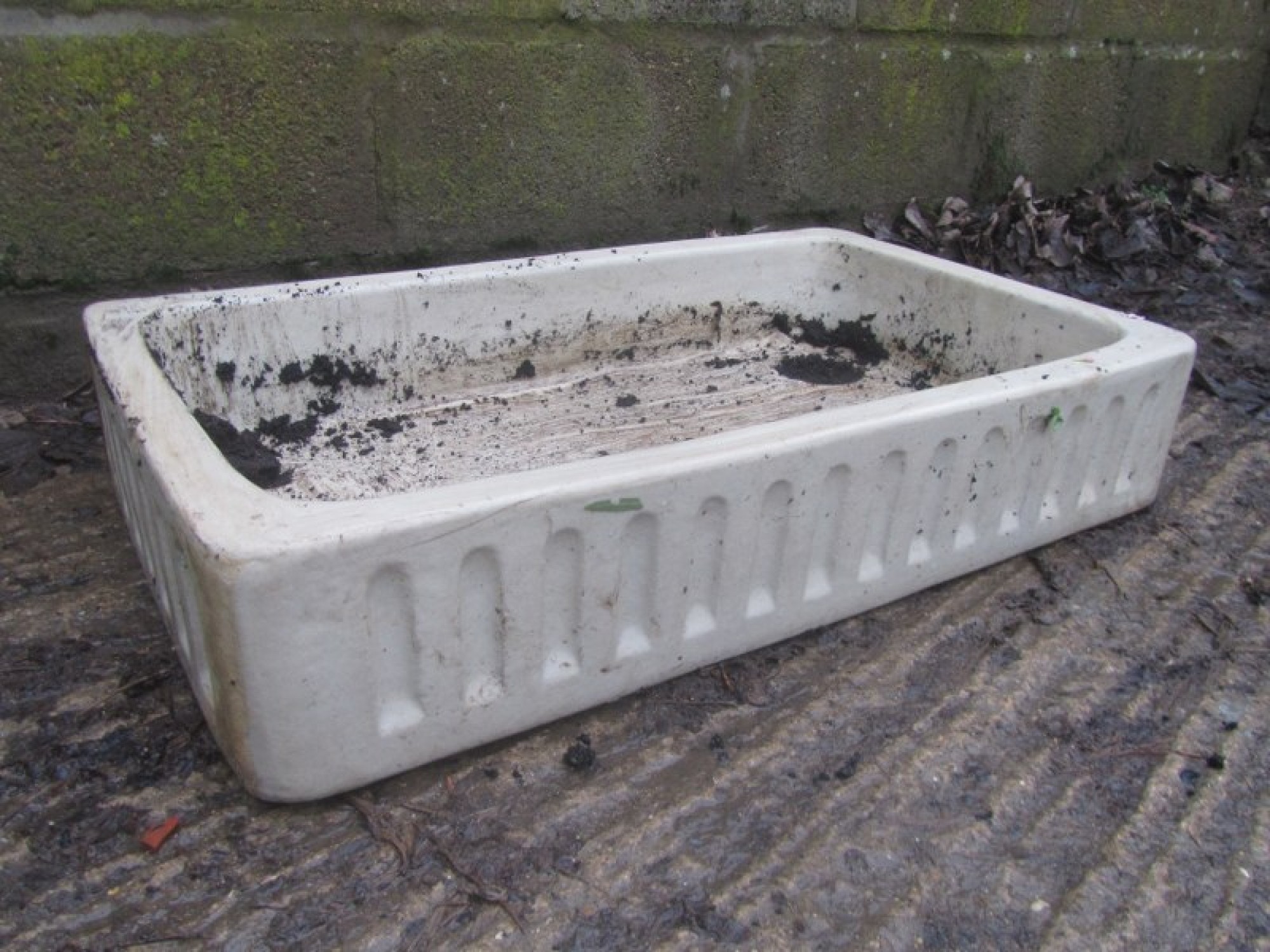 THIS IS AN OLD BELFAST SINK IN A CREAM COLOURED SALT GLAZE FINISH. IT HAS SAT IN A GARDEN FOR YEARS, SOME WEAR, IT NEEDS A GOOD CLEAN, IT IS BEYOND USE AS A SINK IN A KITCHEN, BUT WOULD LOOK GREAT IN A GARDEN AS A PLANTER.
