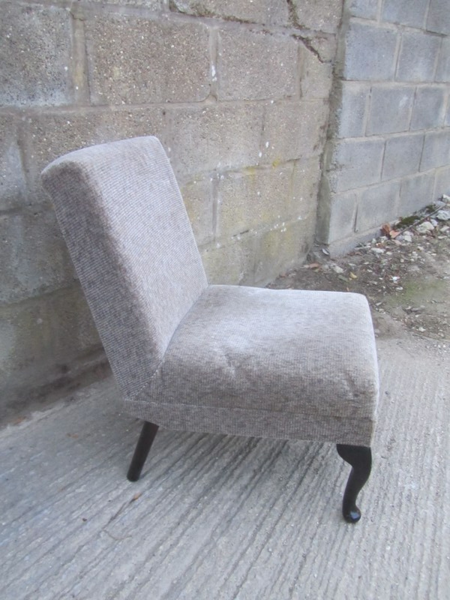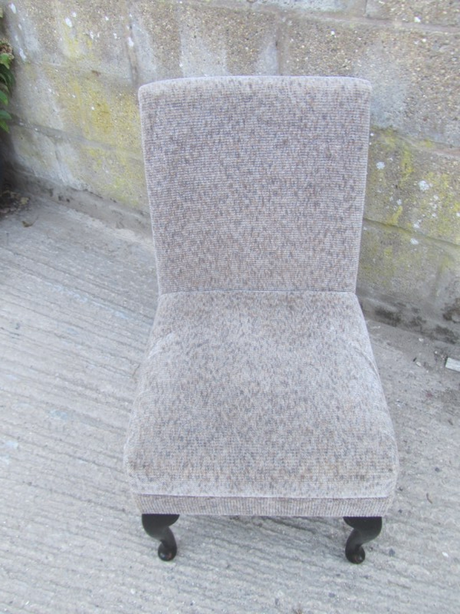 THIS IS A LOW BEDROOM CHAIR. A STURDY SIMPLE CHAIR. MATERIAL SEAT. A GREAT PIECE FOR ANYWHERE IN THE HOME. IN GOOD CONDITION, SOME LIGHT MARKS.