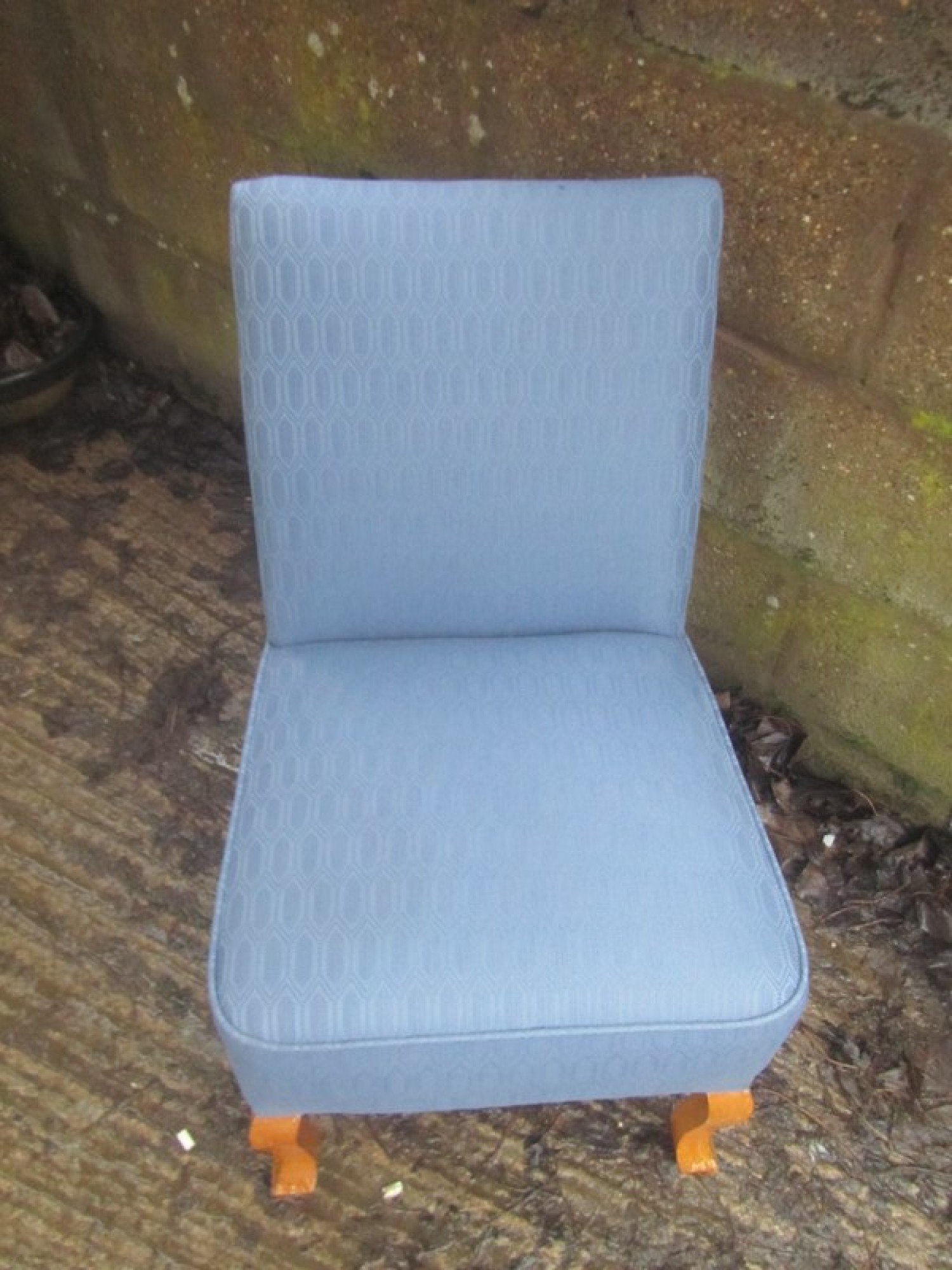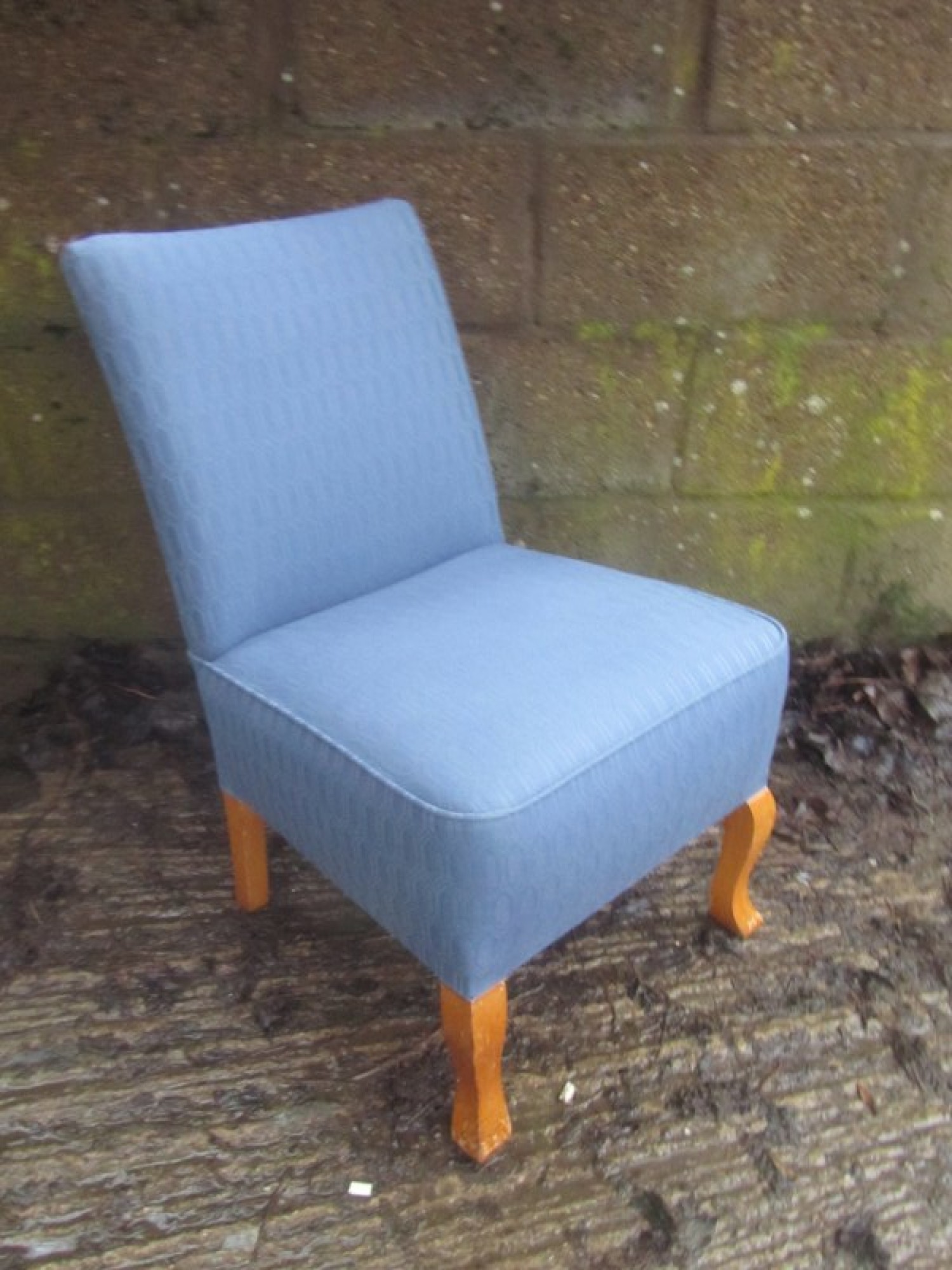 THIS IS A LOW BEDROOM CHAIR. A STURDY SIMPLE CHAIR. MATERIAL SEAT. A GREAT PIECE FOR ANYWHERE IN THE HOME. IN GOOD CONDITION, SOME LIGHT MARKS. SEAT HEIGHT IS 40cm.